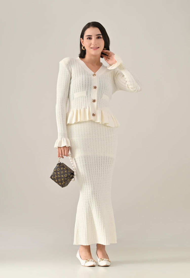 A chic sweater knit co-ord set featuring a stylish V neckline and open front with inner plastic and outer showy rhinestone buttons for a touch of sparkle. The top is enhanced with shoulder pads, ruffled hem, and long fitted sleeves with ruffled cuffs, creating a feminine silhouette. Designed with showy front pocket , rib detailing all over the front. Skirt with Broad elasticated waist for a flattering fit. Paired with a fitted Fishtail long skirt, half-lined for comfort and coverage. Crafted from soft, comfortable, and stretchable fabric, this set blends elegance with cozy sophistication.