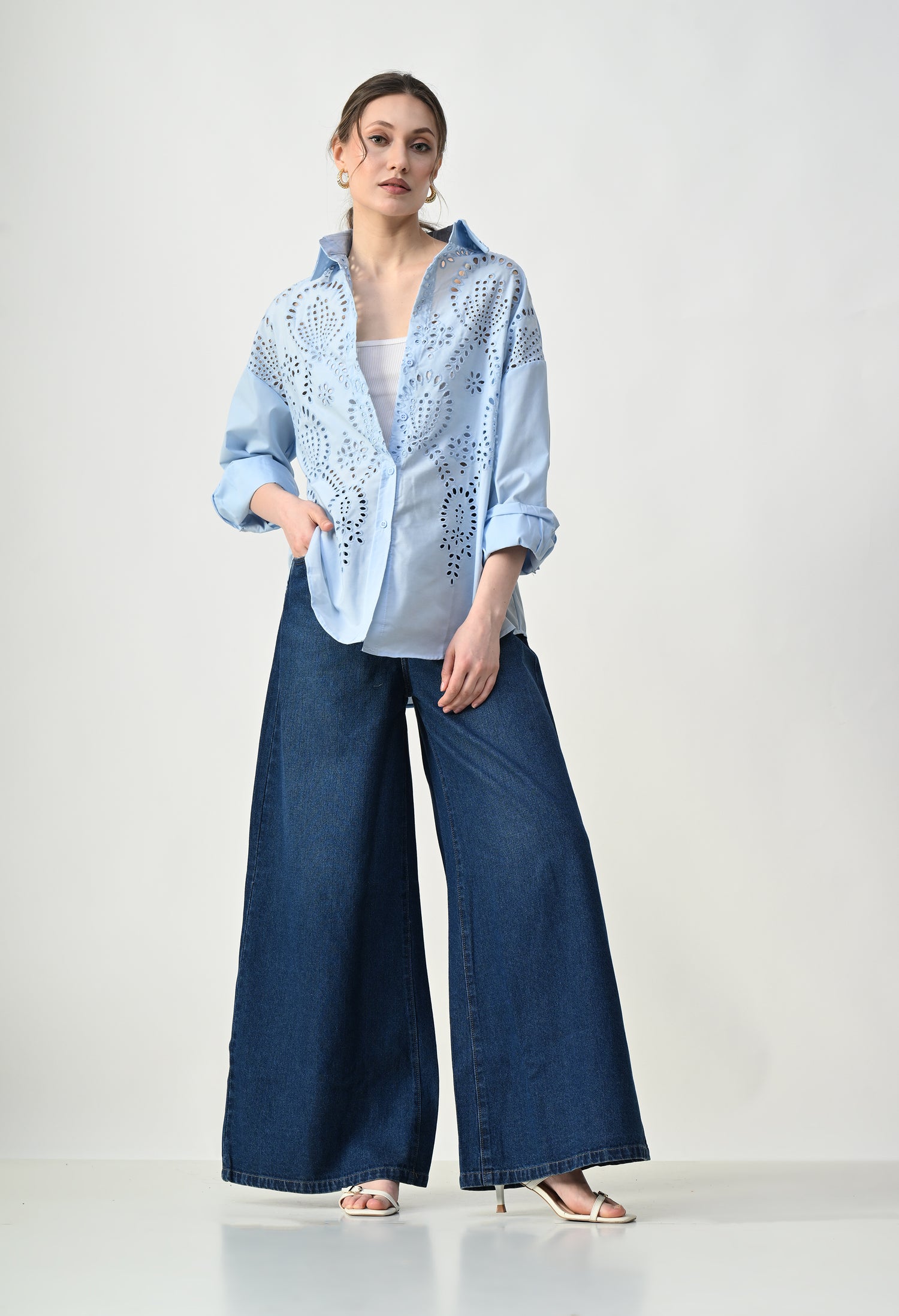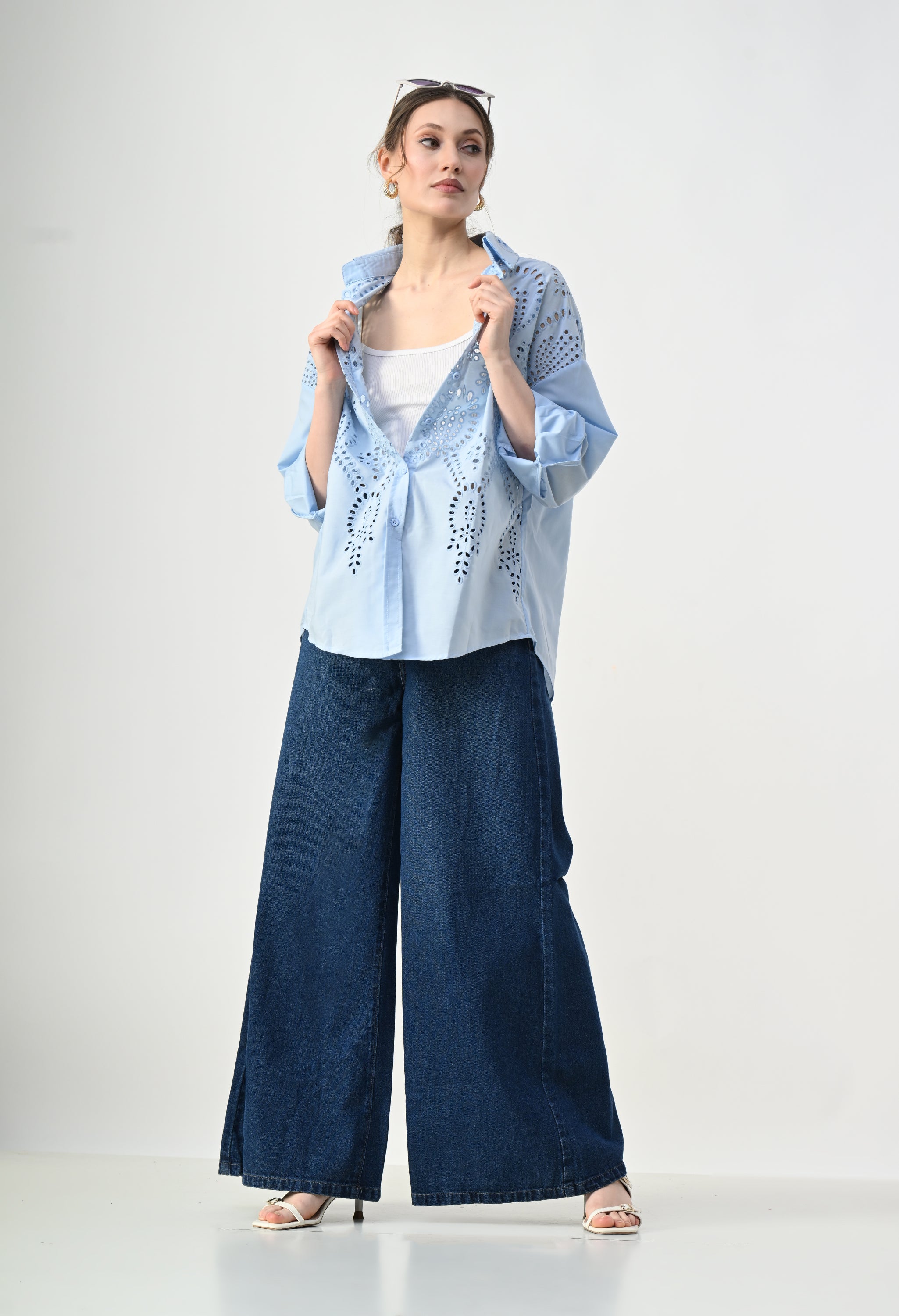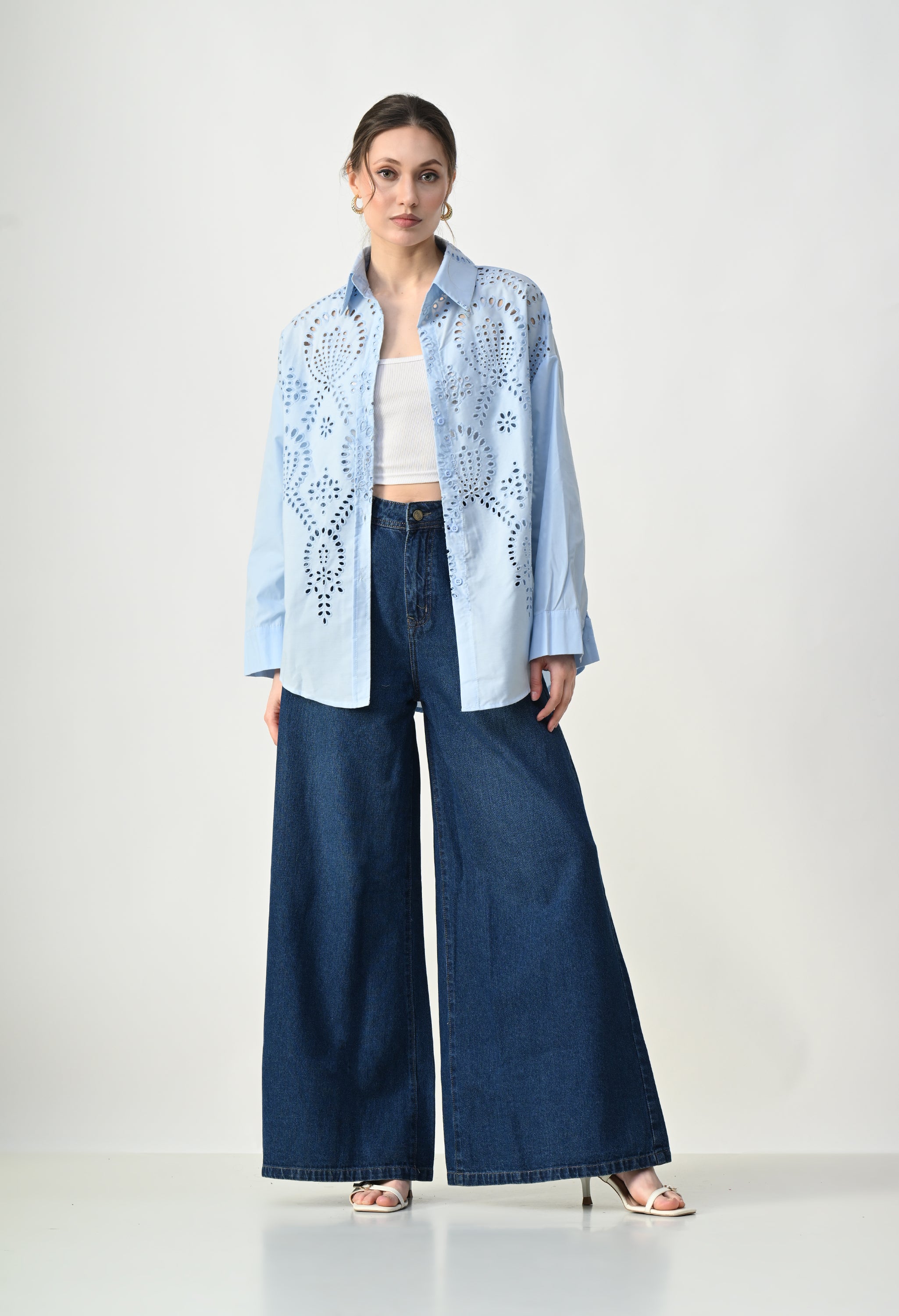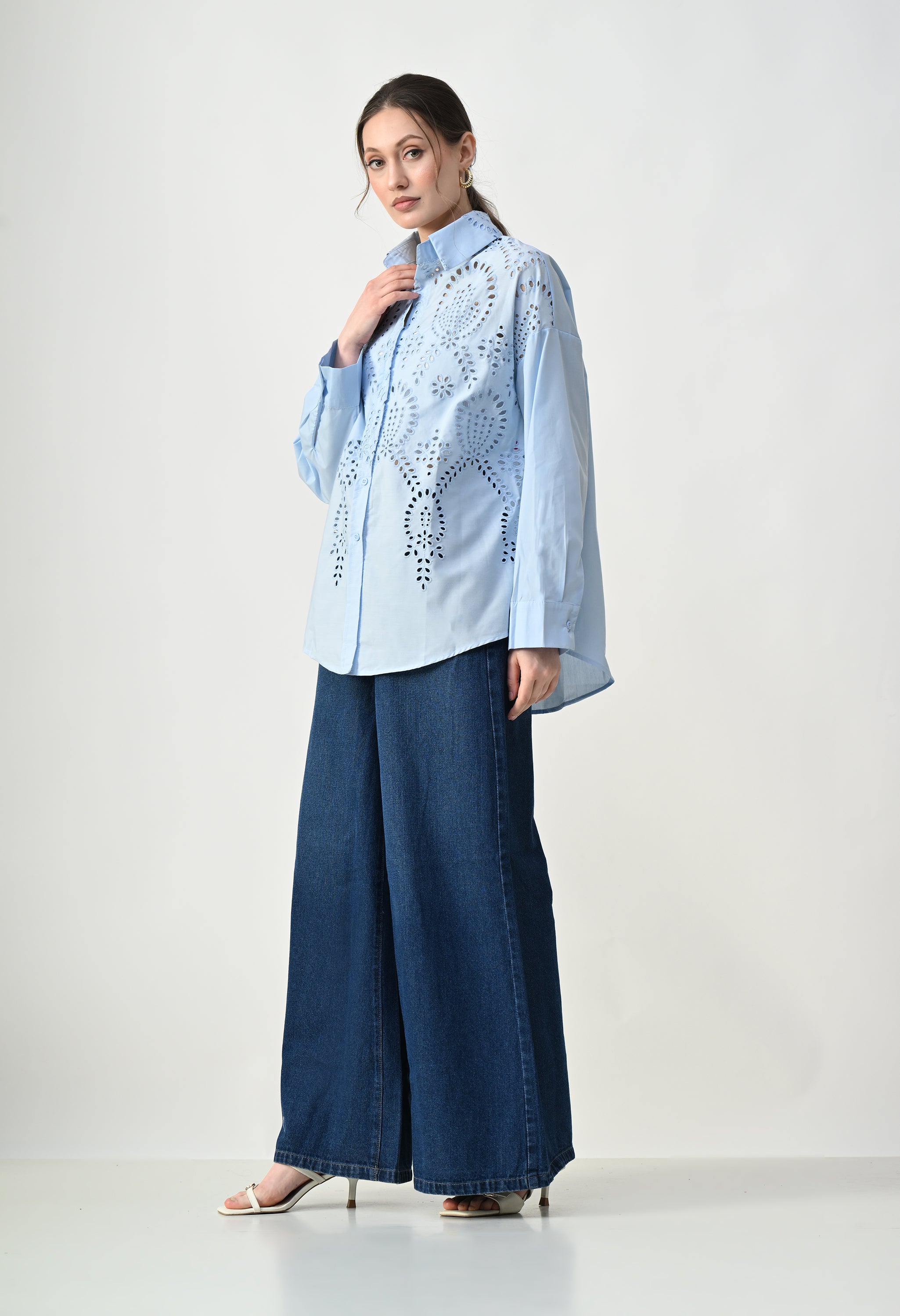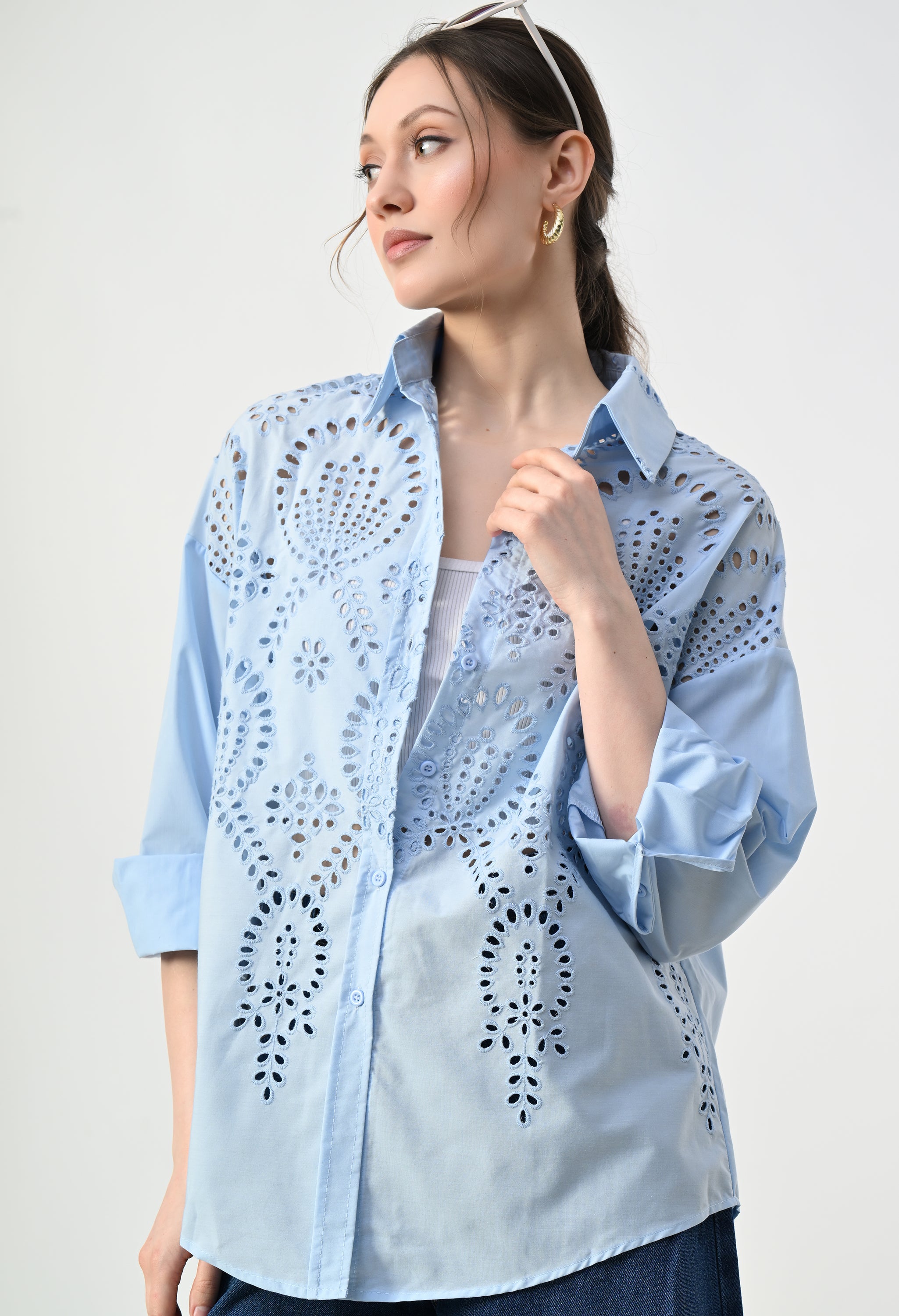 This charming light blue button-down shirt is a perfect blend of classic tailoring and delicate feminine detail. Crafted from a crisp, breathable fabric, it features a traditional pointed collar and a functional front placket with matching blue buttons. The front of the shirt is adorned with an intricate, large-scale eyelet embroidery pattern, showcasing circular and floral motifs that provide a subtle, semi-sheer texture. With its relaxed fit, slightly dropped shoulders, and long sleeves with buttoned cuffs, this shirt offers a modern yet timeless silhouette that can easily transition from a polished office look to a casual weekend ensemble.
