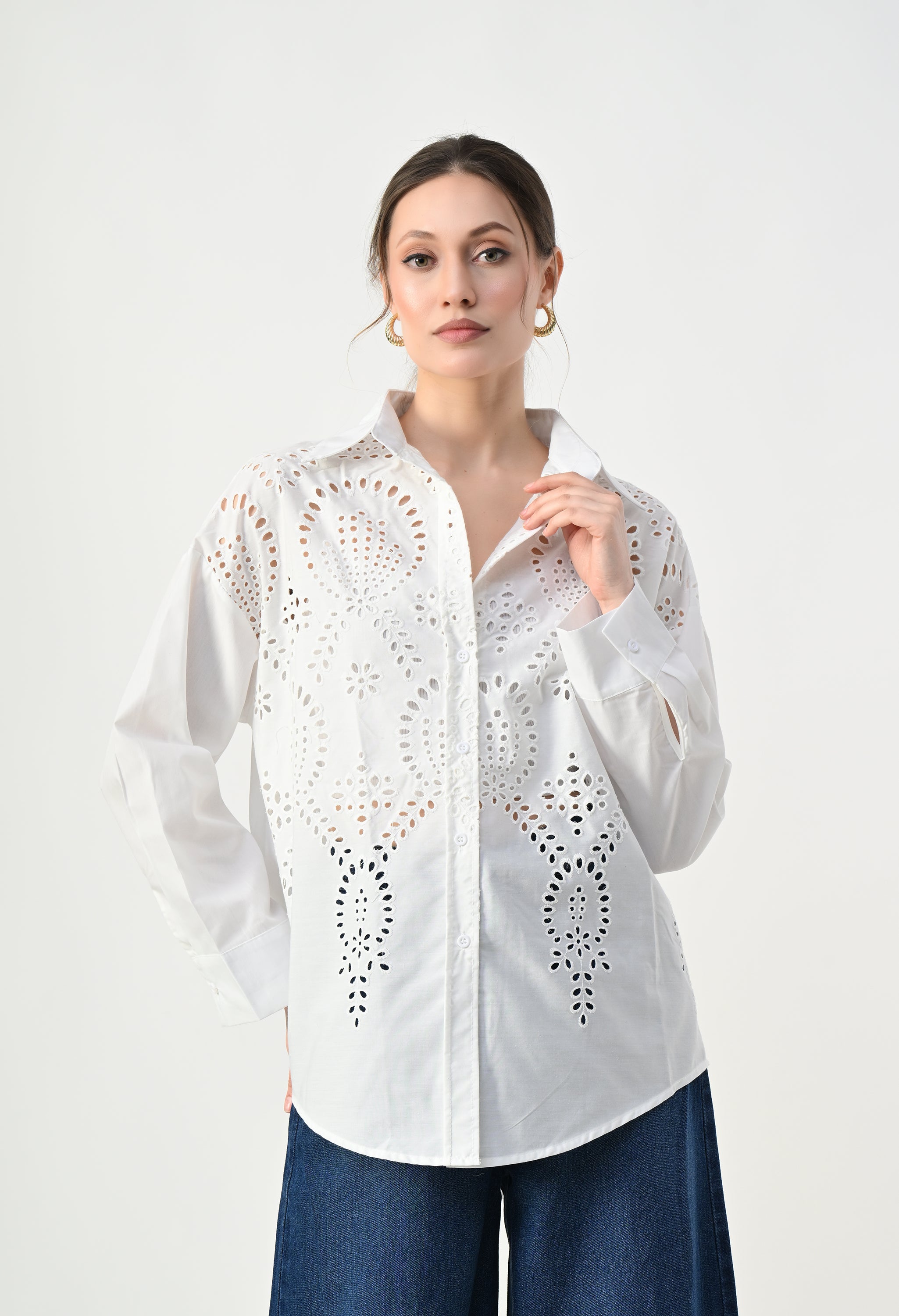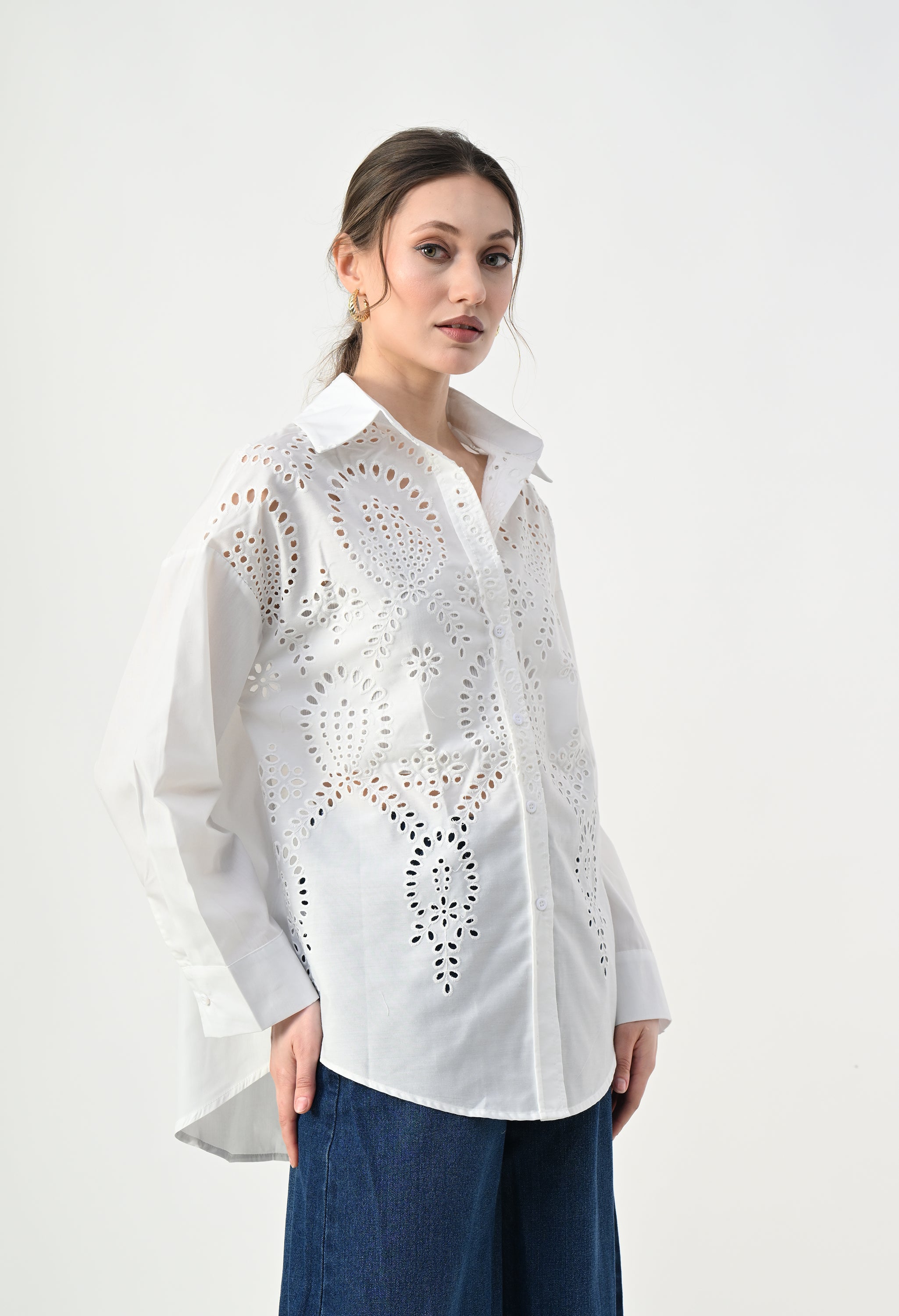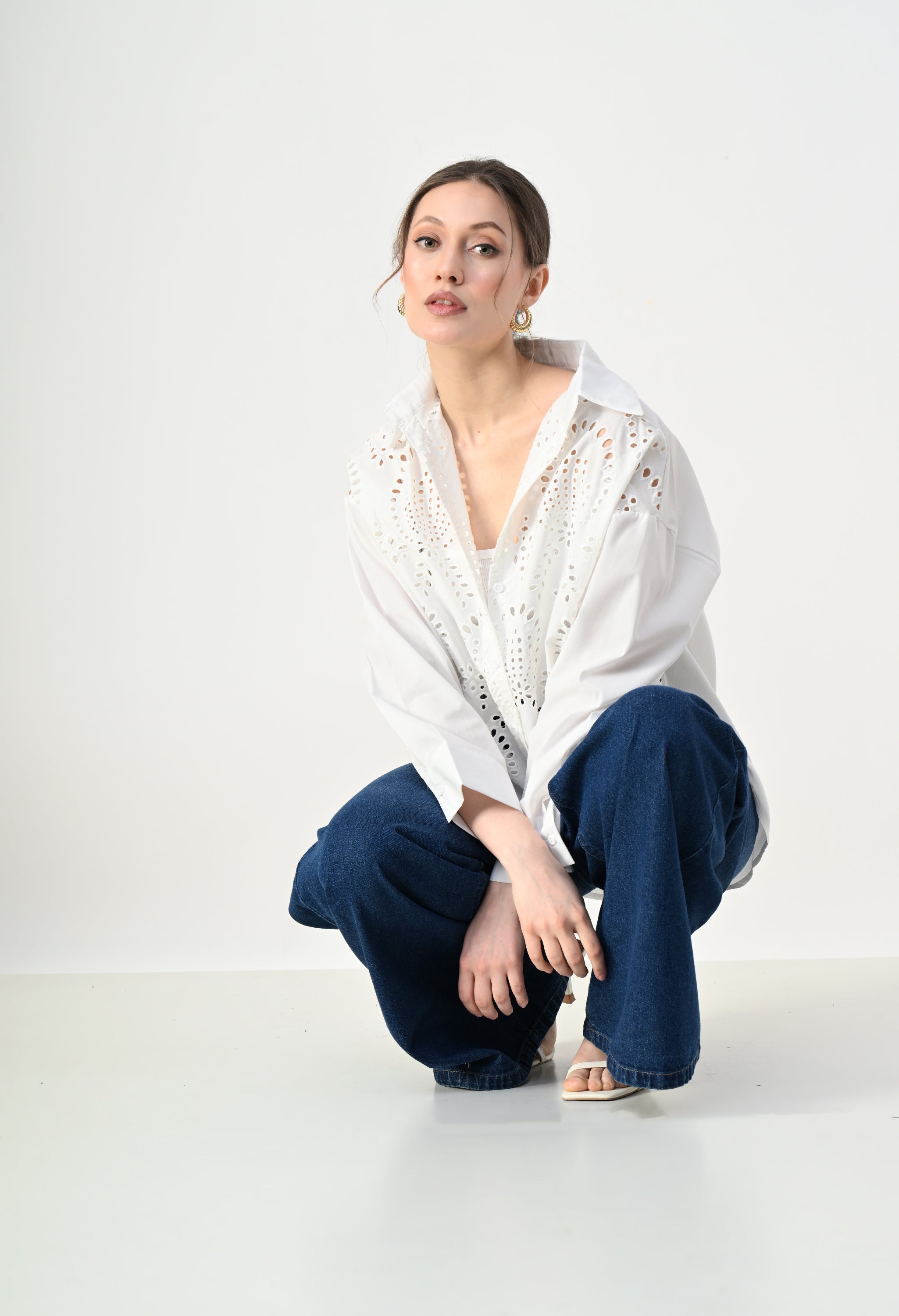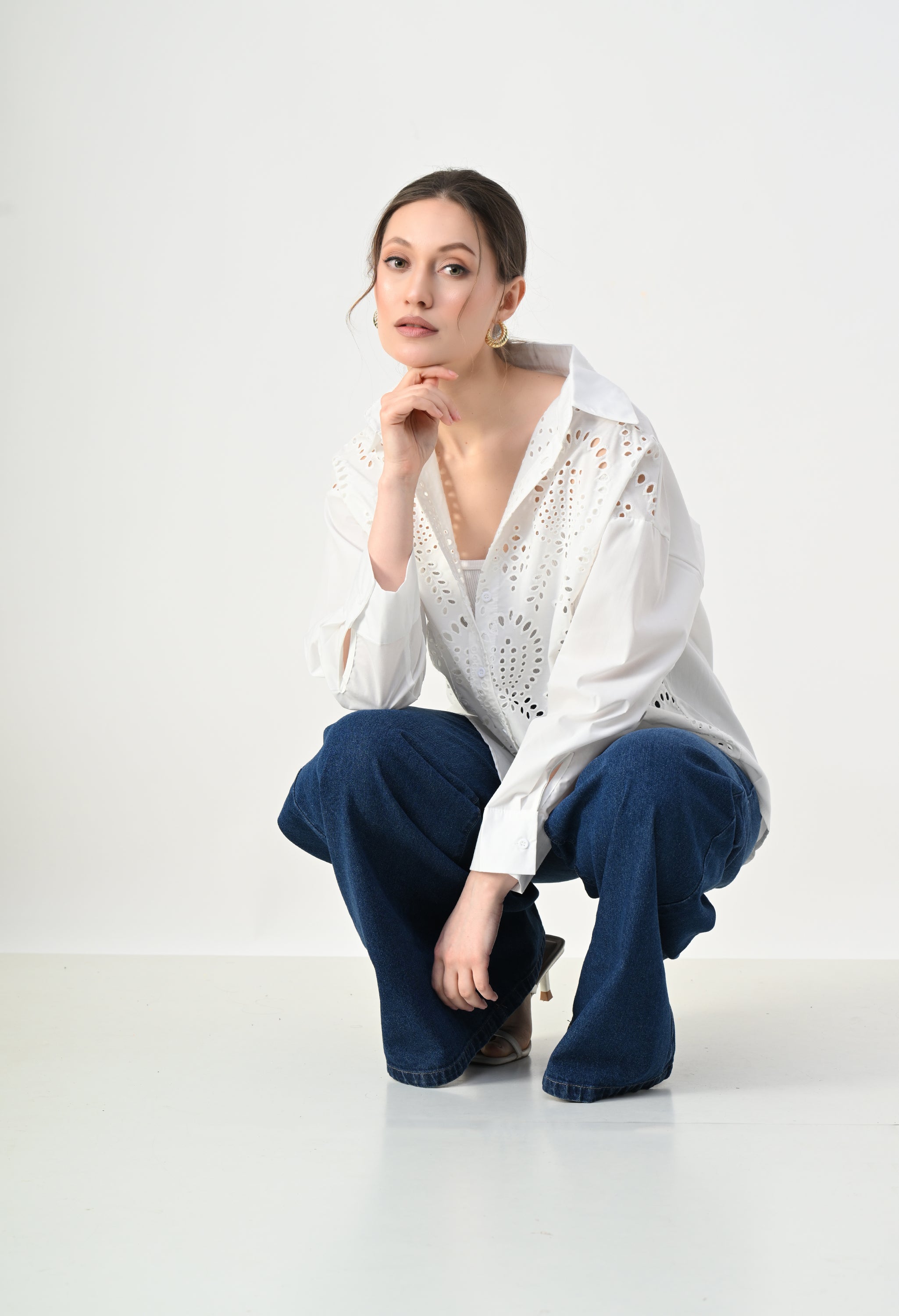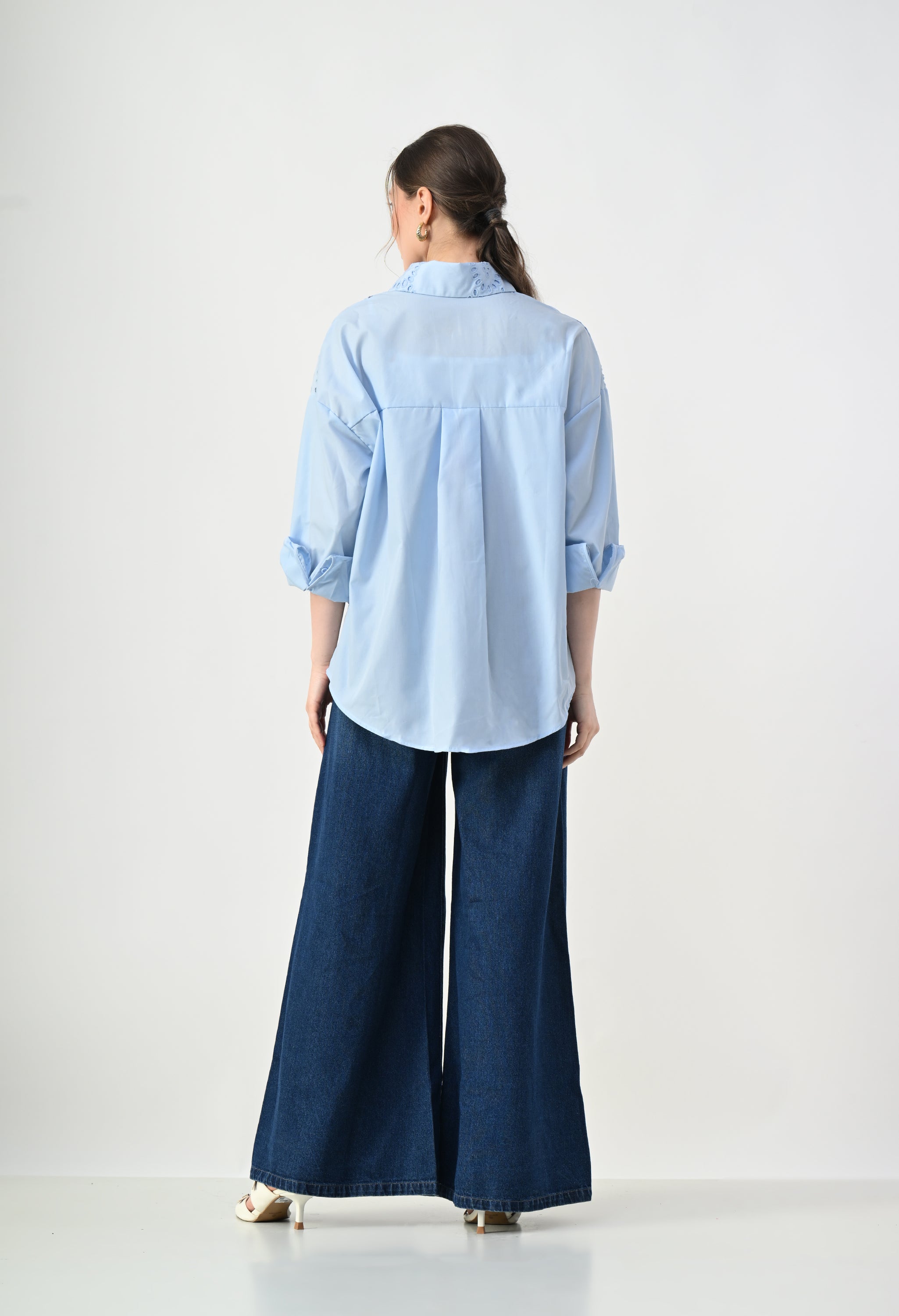 This charming light blue button-down shirt is a perfect blend of classic tailoring and delicate feminine detail. Crafted from a crisp, breathable fabric, it features a traditional pointed collar and a functional front placket with matching blue buttons. The front of the shirt is adorned with an intricate, large-scale eyelet embroidery pattern, showcasing circular and floral motifs that provide a subtle, semi-sheer texture. With its relaxed fit, slightly dropped shoulders, and long sleeves with buttoned cuffs, this shirt offers a modern yet timeless silhouette that can easily transition from a polished office look to a casual weekend ensemble.