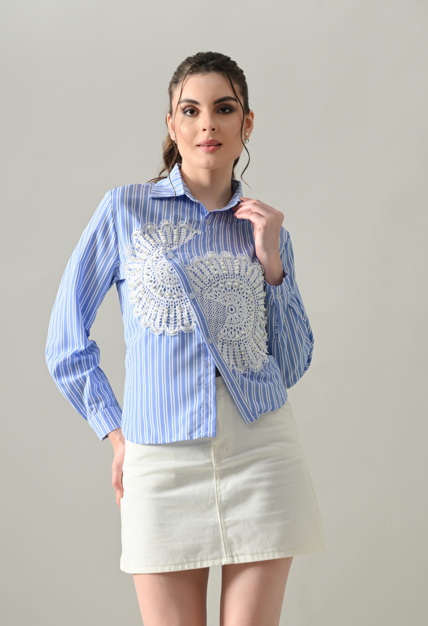 Fresh, feminine, and fashion-forward—the Sunlit Lace Panel Shirt is a modern reimagination of stripes with artisanal charm. Featuring delicate peach-and-white pinstripes as its canvas, this shirt stands out with intricate lace panel detailing that adds a romantic, handcrafted touch. Pair it with crisp trousers for work or style it with denim for an elevated casual vibe.