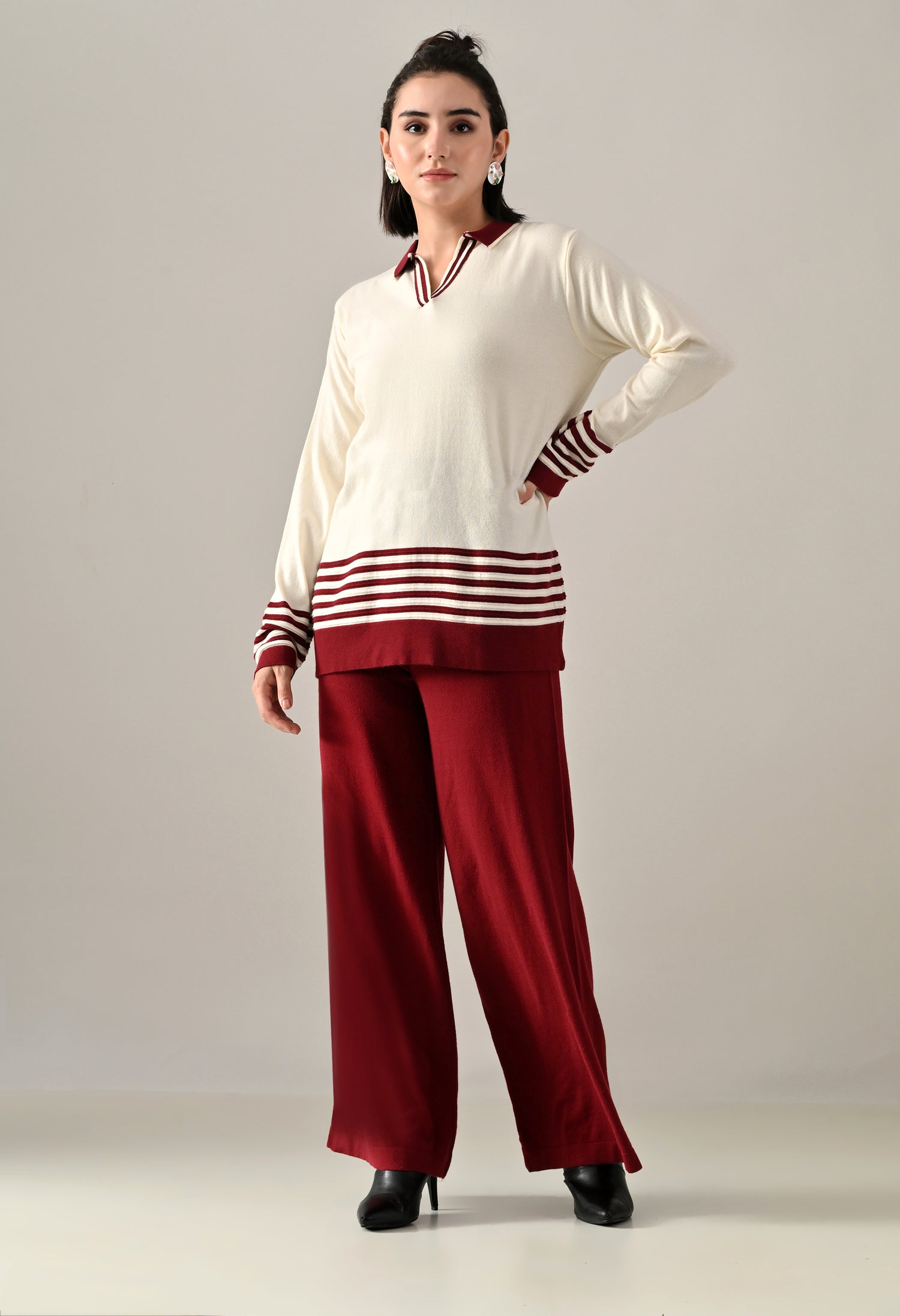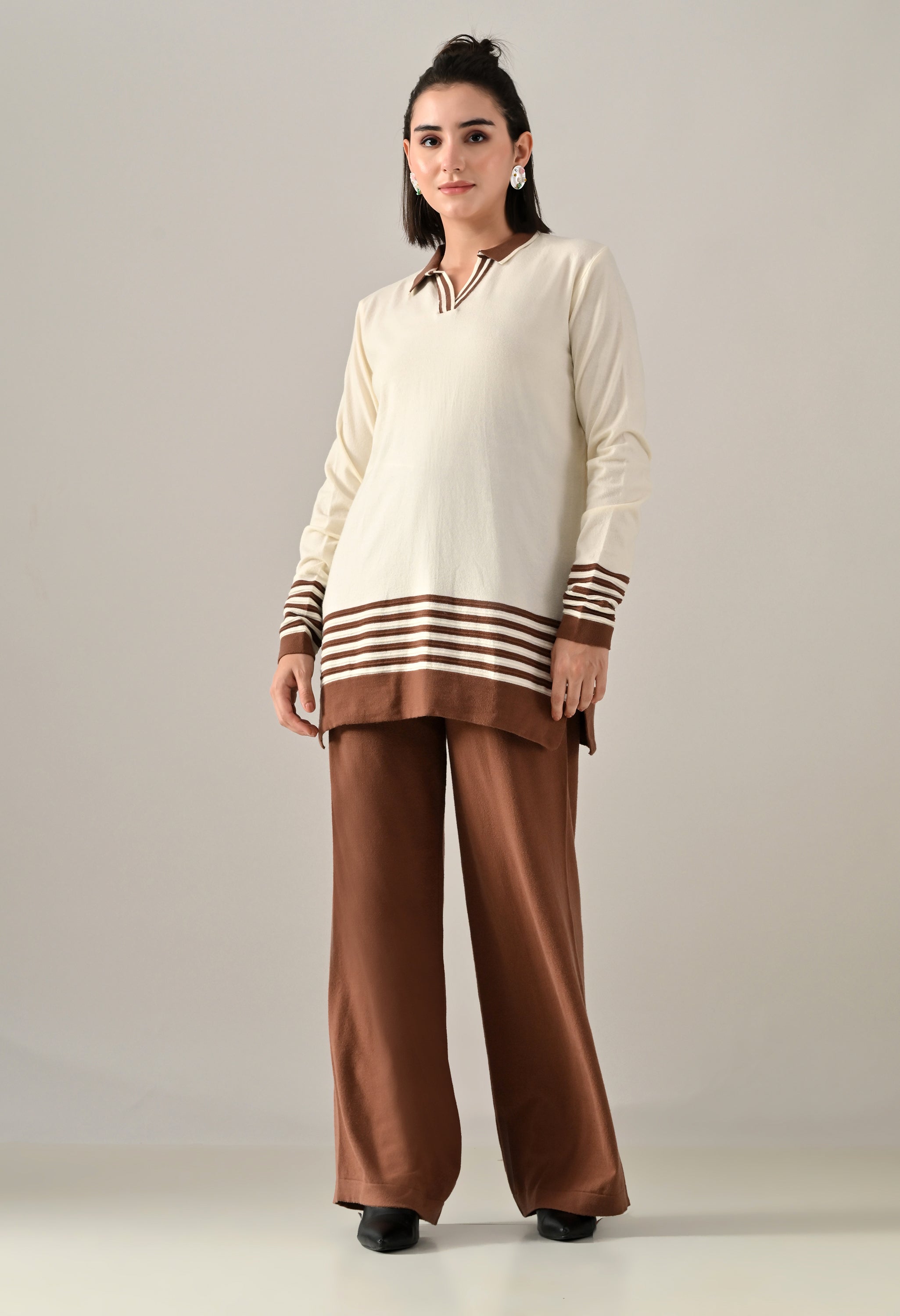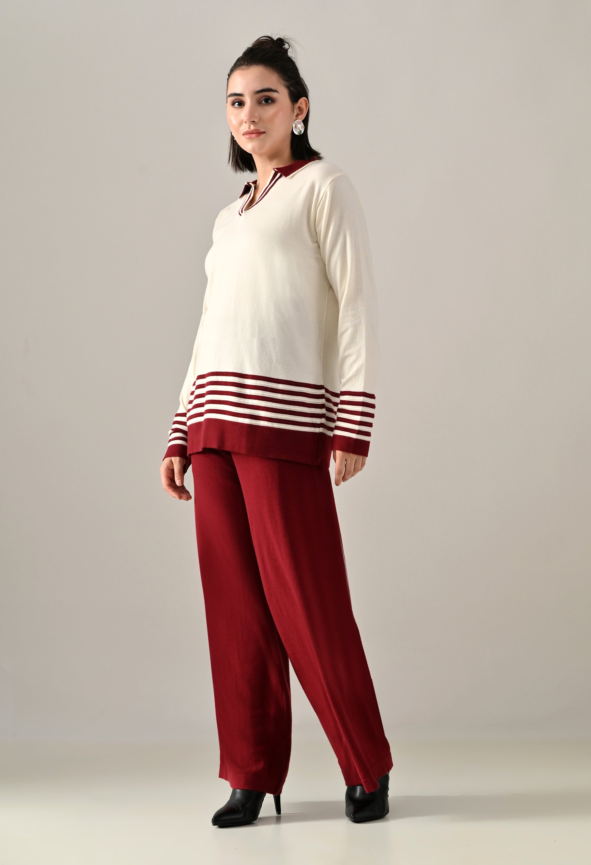 A trendy sweater-knitted co-ord set featuring a V-shaped neckline with a collar and regular full sleeves accented by a stripe design. The top includes a regular hem with matching stripe detail and side slits for added ease. Paired with flared stripe trousers featuring a broad elasticated waistband with coordinated stripe detailing. Made from soft, comfortable, and stretchable fabric, this set blends sporty style with cozy elegance — perfect for casual chic looks.