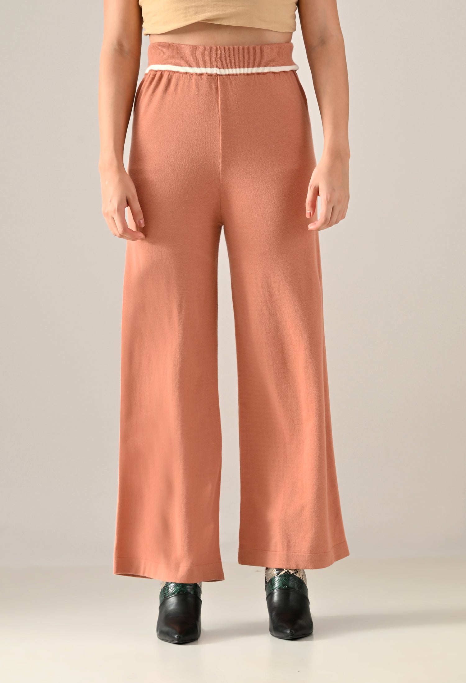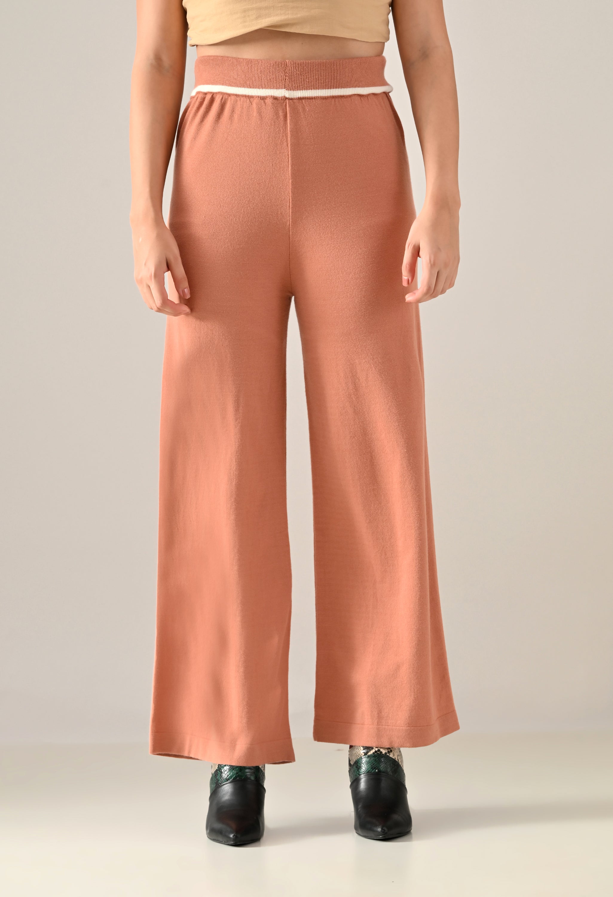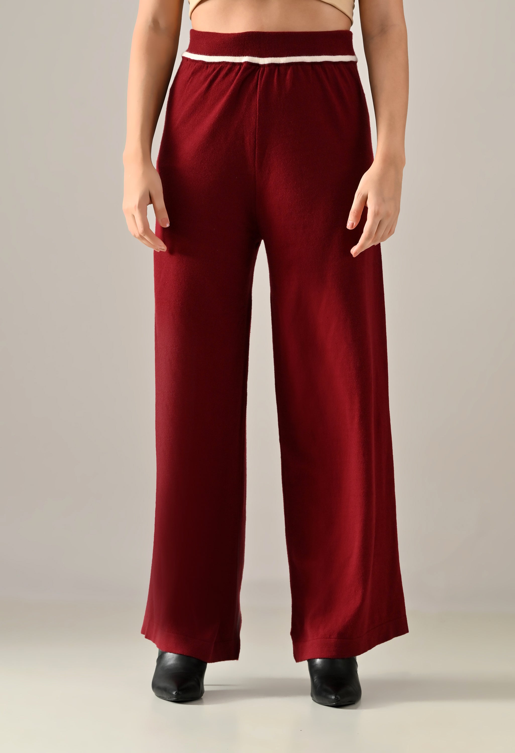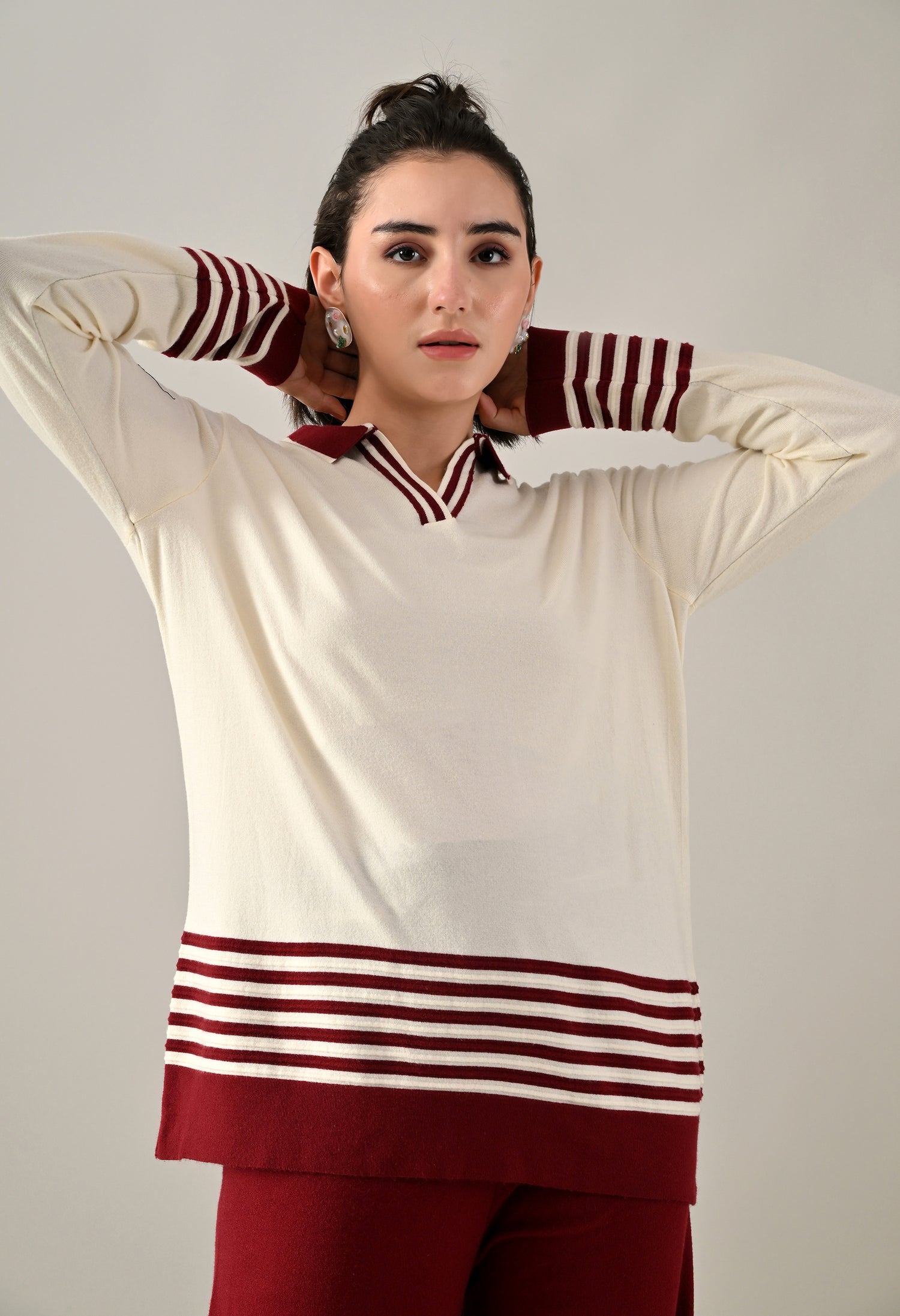 A trendy sweater-knitted co-ord set featuring a V-shaped neckline with a collar and regular full sleeves accented by a stripe design. The top includes a regular hem with matching stripe detail and side slits for added ease. Paired with flared stripe trousers featuring a broad elasticated waistband with coordinated stripe detailing. Made from soft, comfortable, and stretchable fabric, this set blends sporty style with cozy elegance — perfect for casual chic looks.