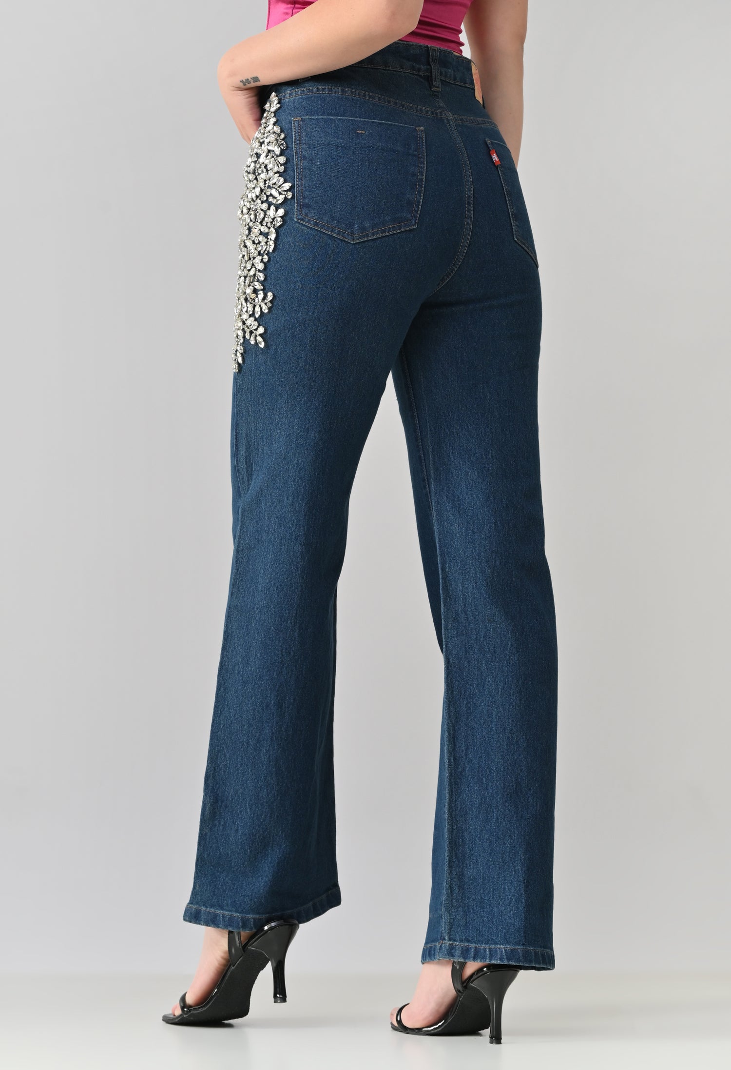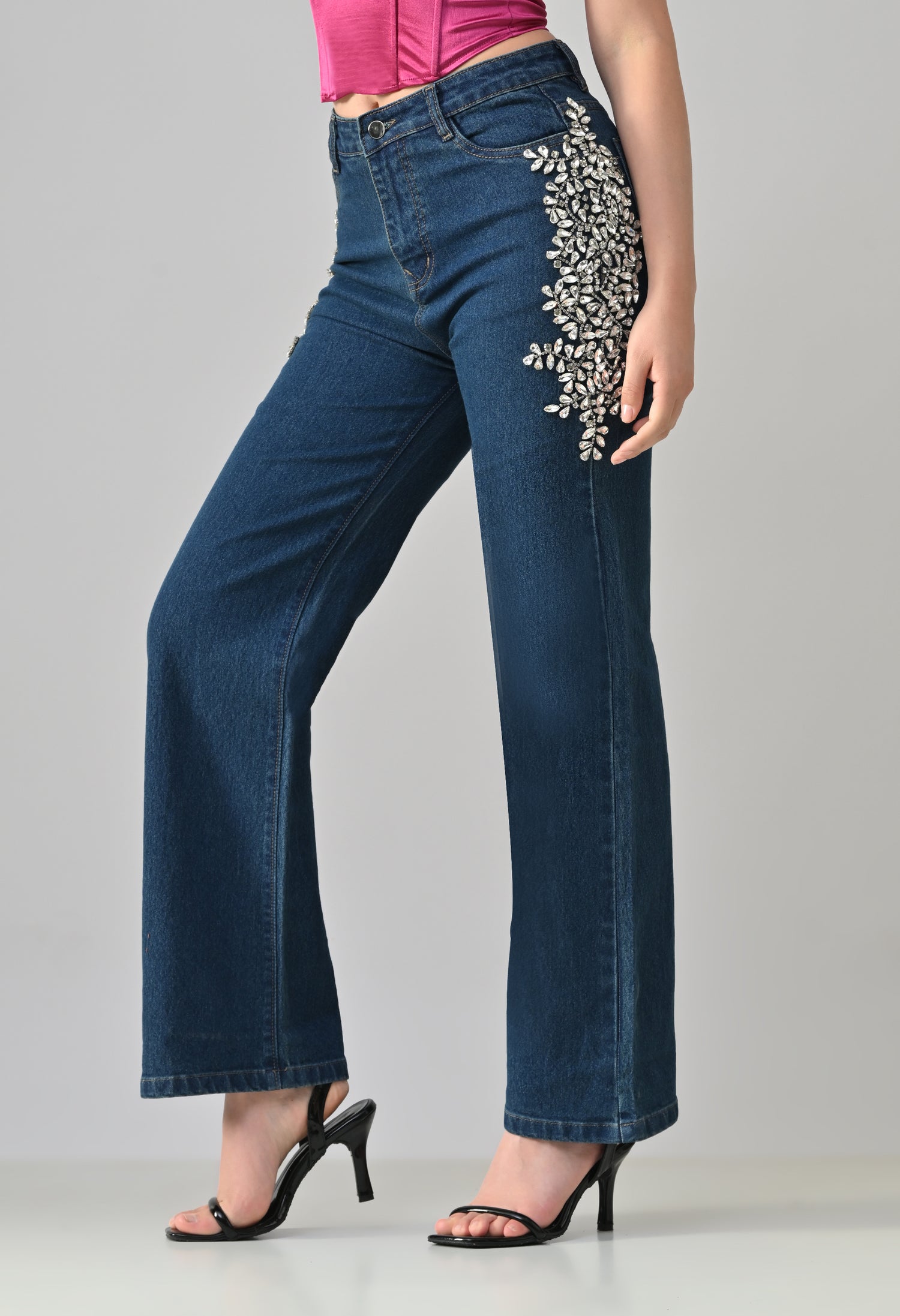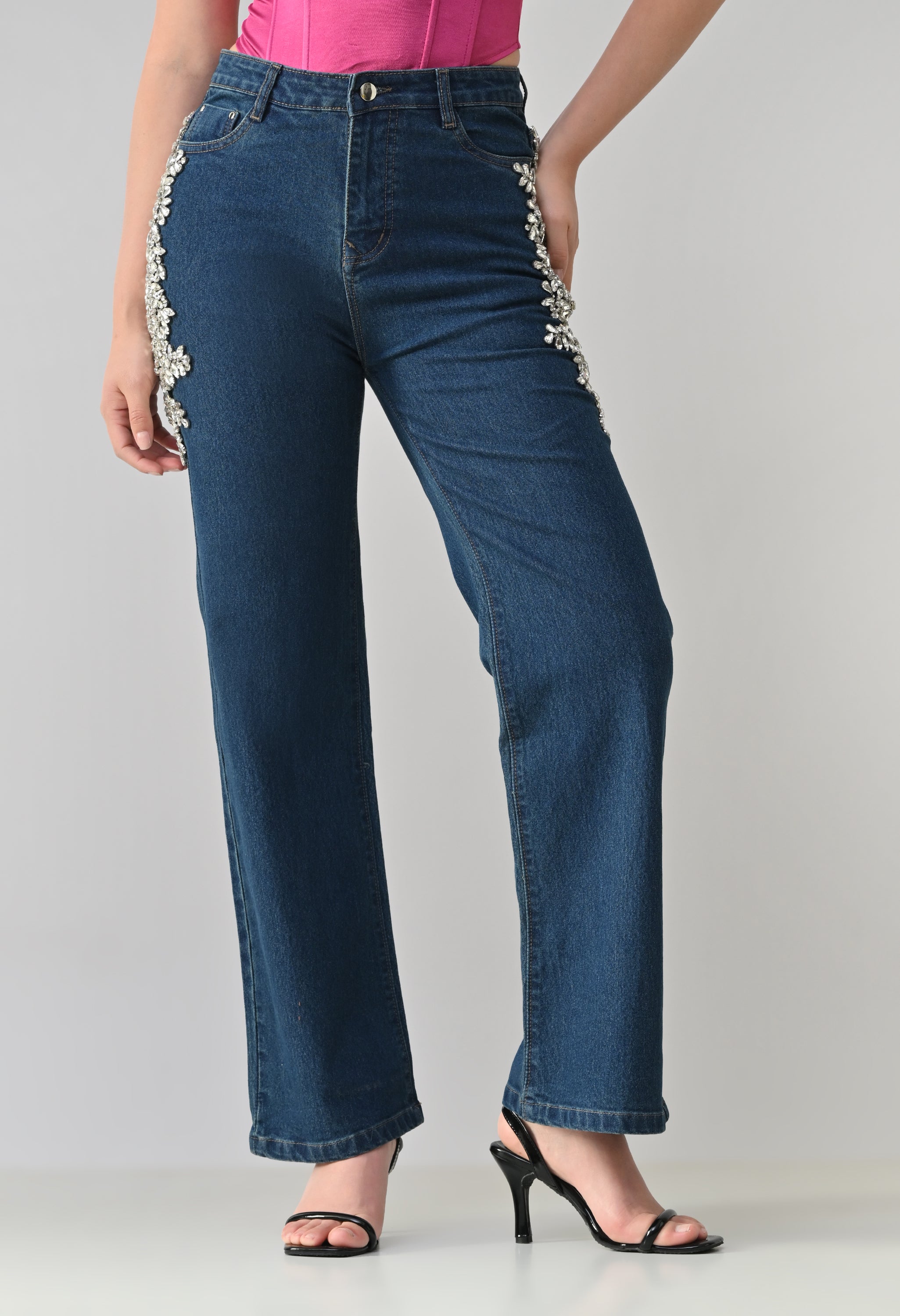 These stylish denim jeans feature a statement look with intricate Crystal floral embellishment placed along the sides near the pockets. They offer a flattering straight-leg silhouette with a classic five-pocket design. The embellished detailing adds a touch of glamour, making these jeans perfect for dressing up casual outfits or adding sparkle to evening wear. Crafted from sturdy, non-stretch denim for a structured fit.