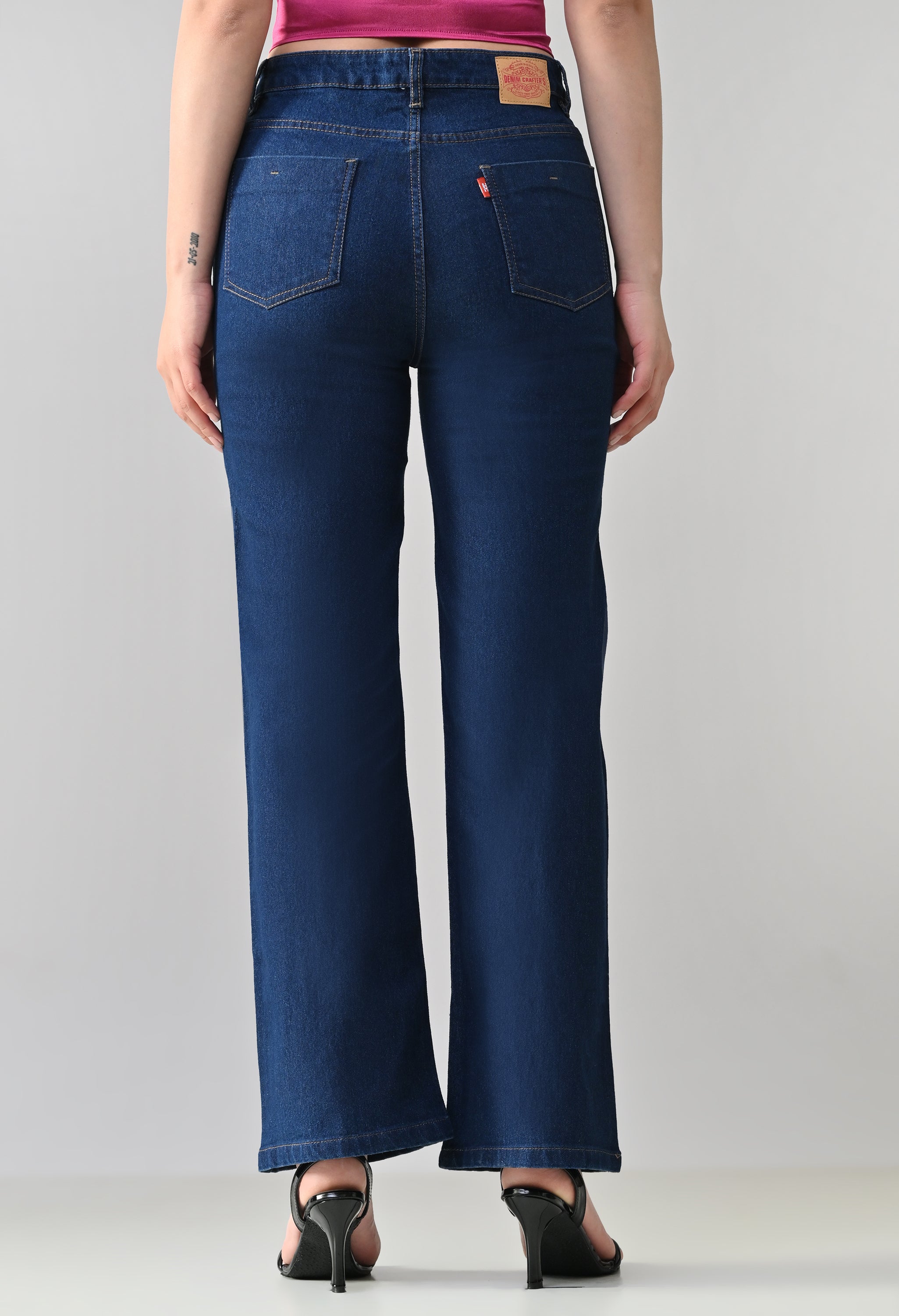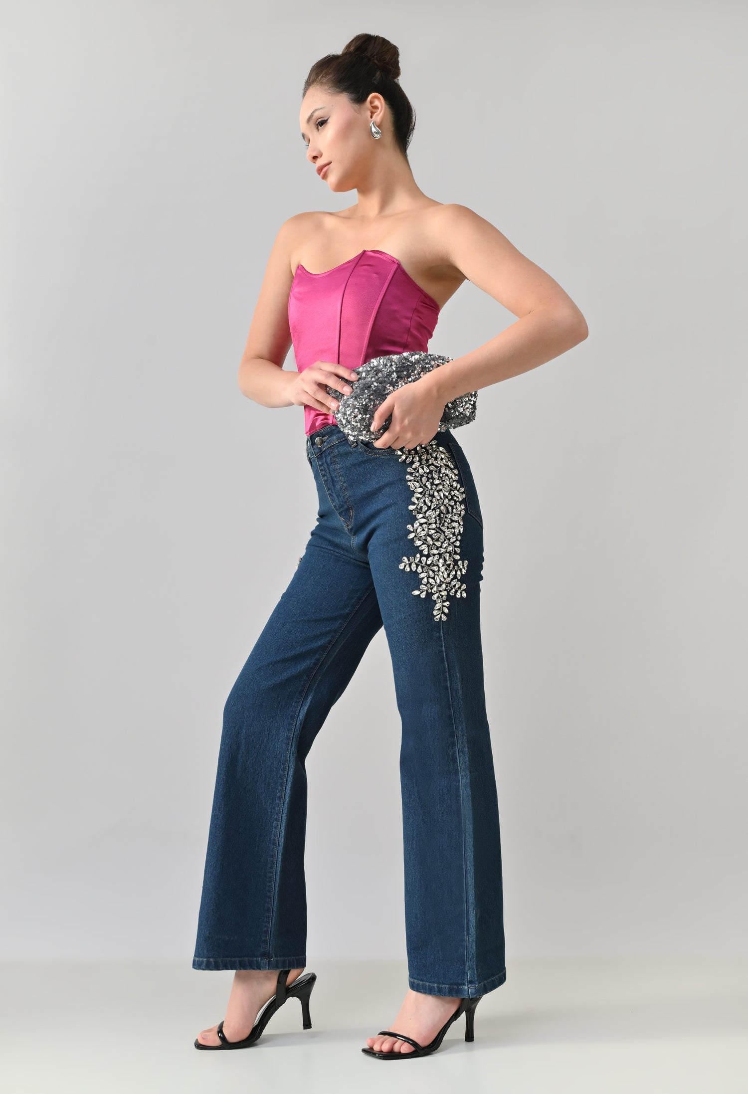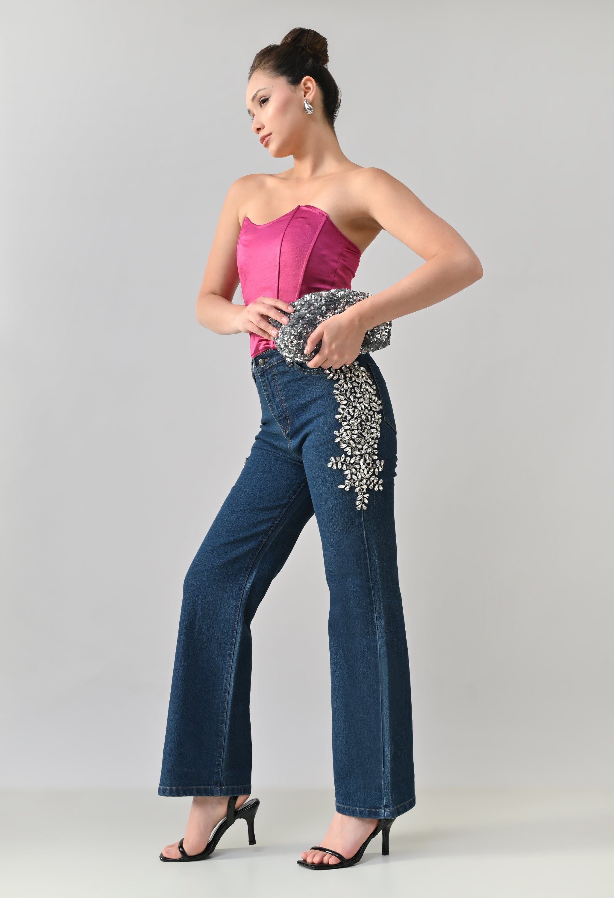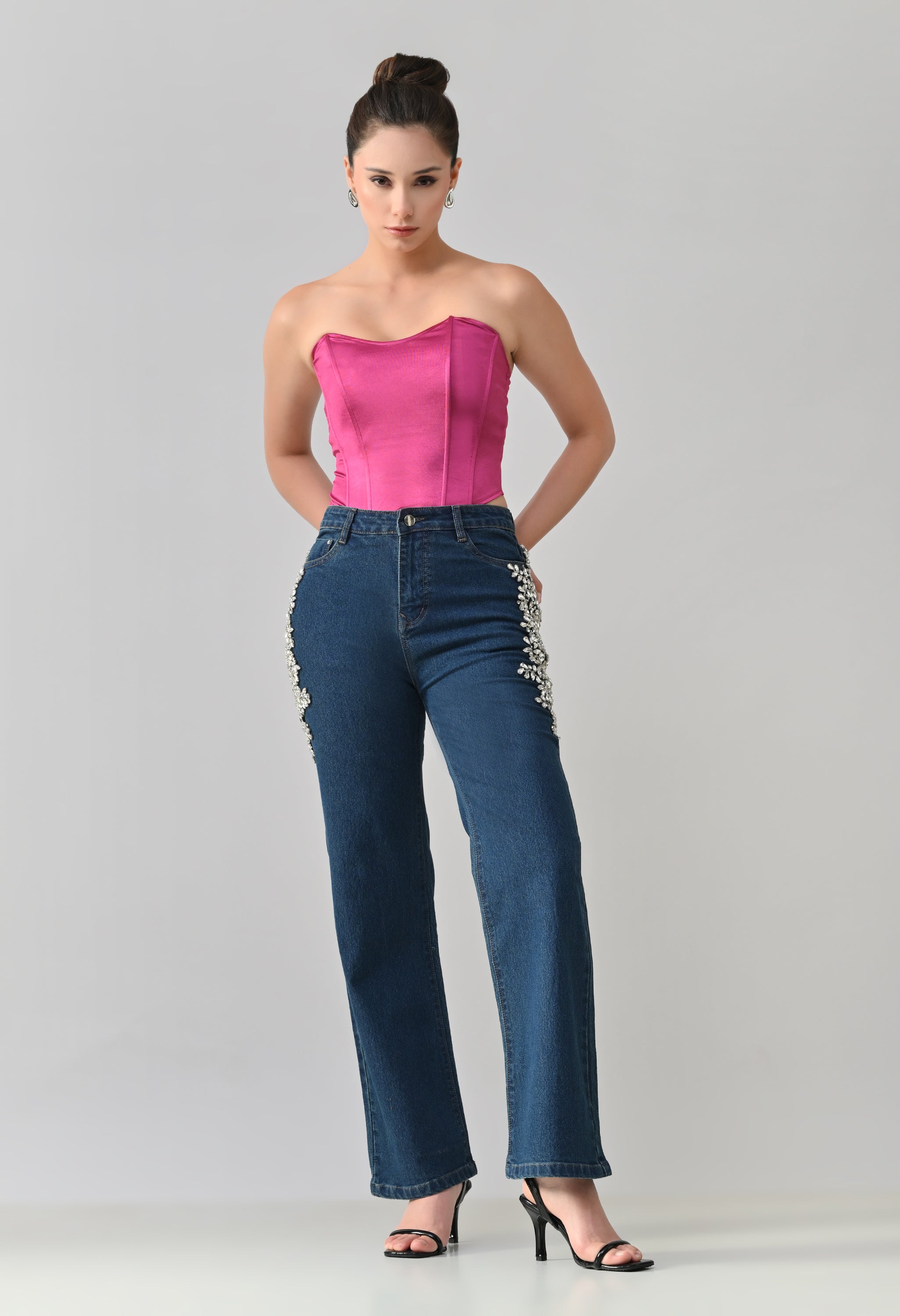These stylish denim jeans feature a statement look with intricate Crystal floral embellishment placed along the sides near the pockets. They offer a flattering straight-leg silhouette with a classic five-pocket design. The embellished detailing adds a touch of glamour, making these jeans perfect for dressing up casual outfits or adding sparkle to evening wear. Crafted from sturdy, non-stretch denim for a structured fit.