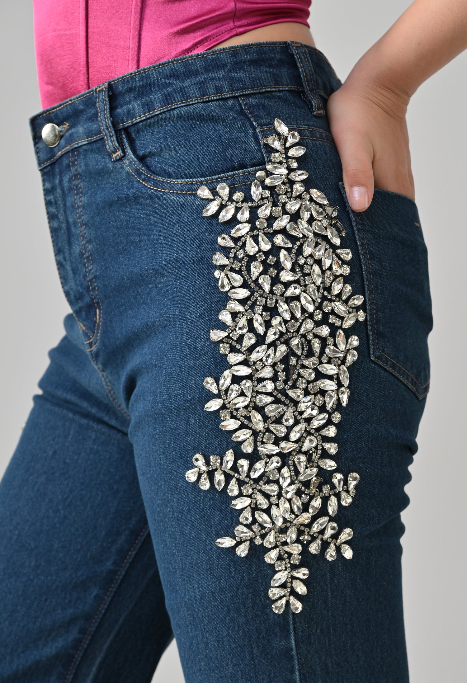 - Crystal embellishment at side seams near pockets