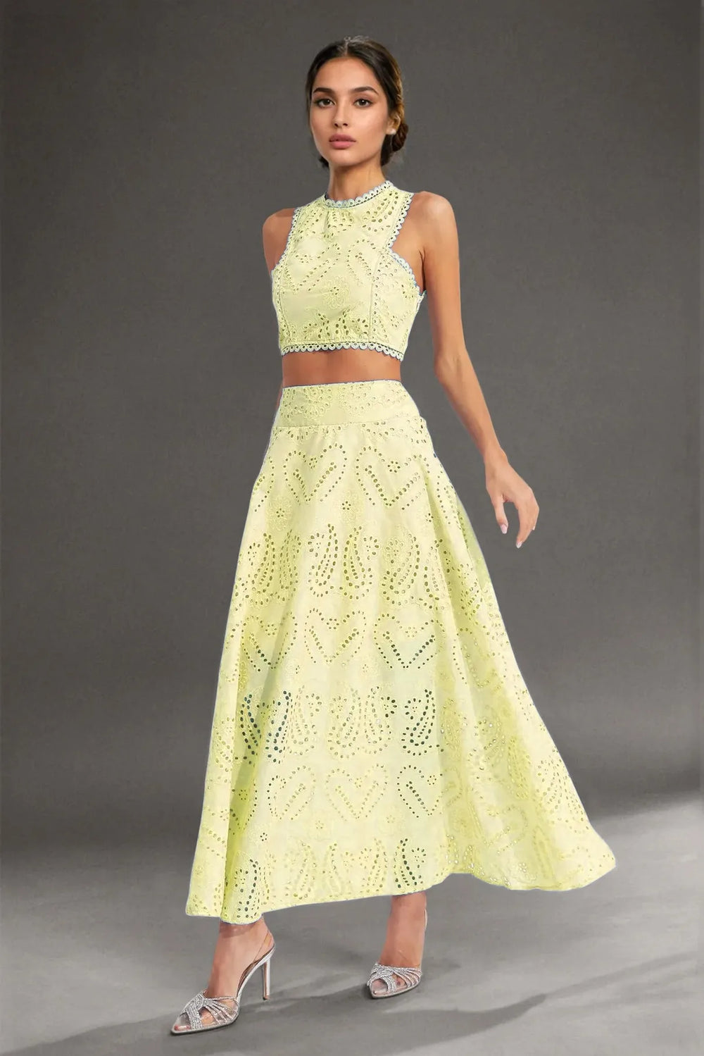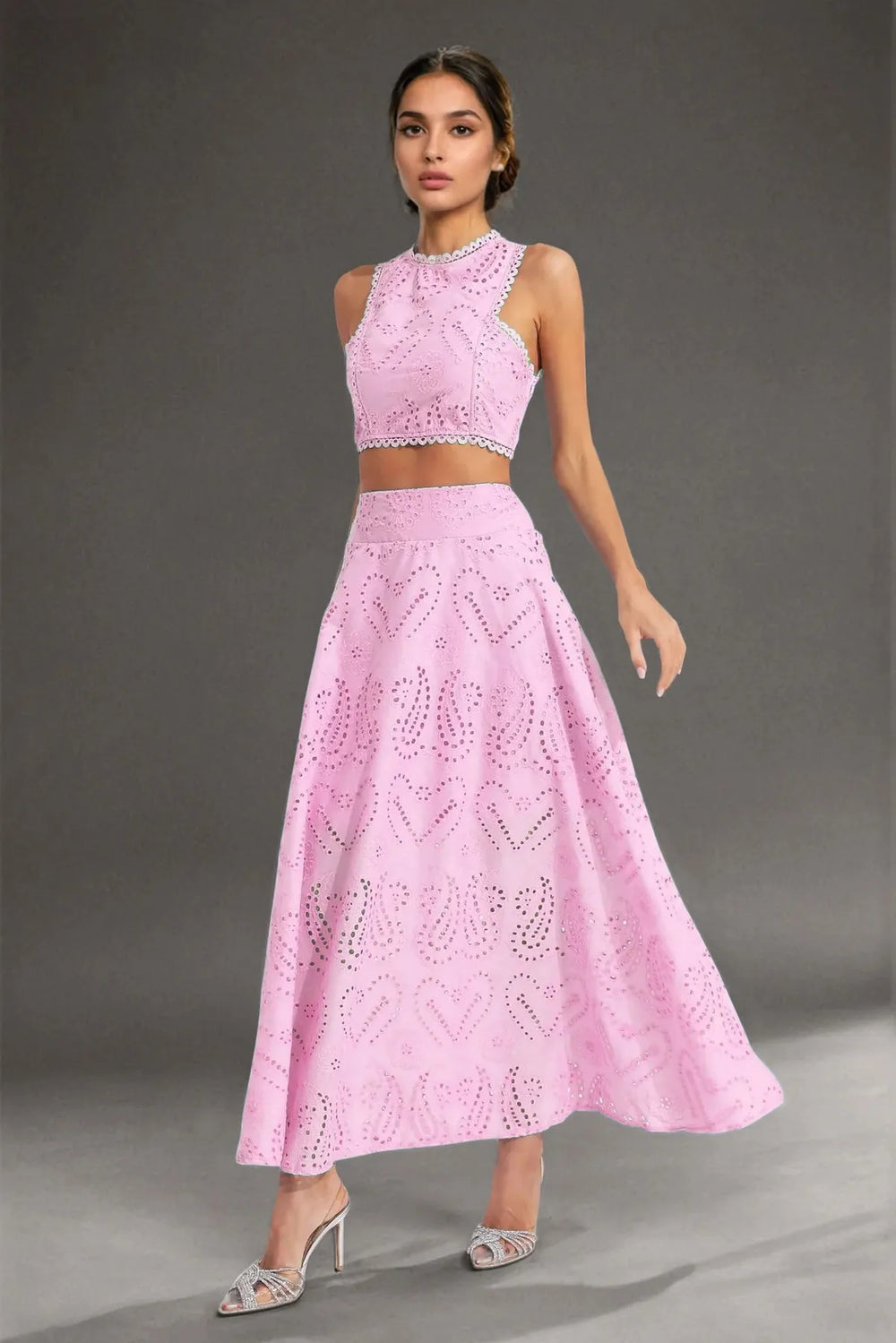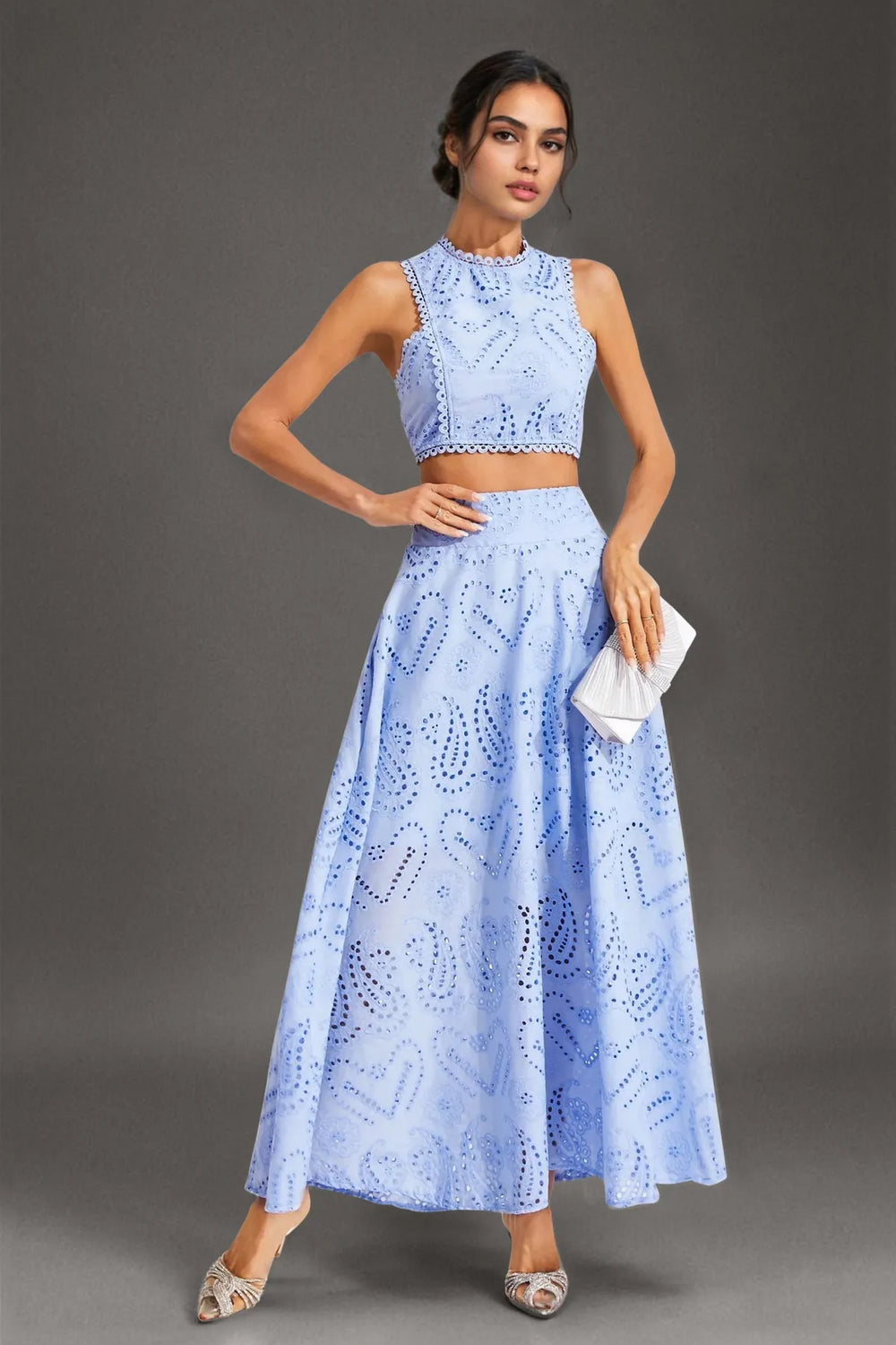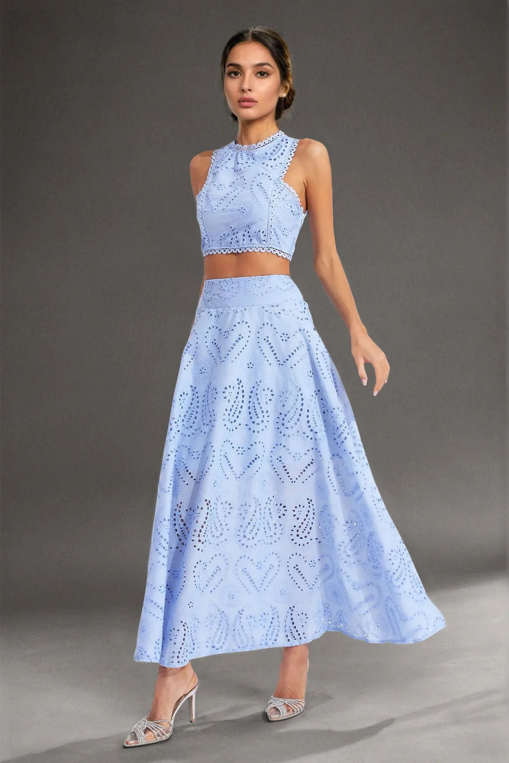 Chic and elegant, this cut-work two-piece set features a round neckline, backless waist-revealing design, and intricate embroidery. Paired with a high-waisted flared midi skirt, it's perfect for vacations, parties, or stylish day-to-night looks.