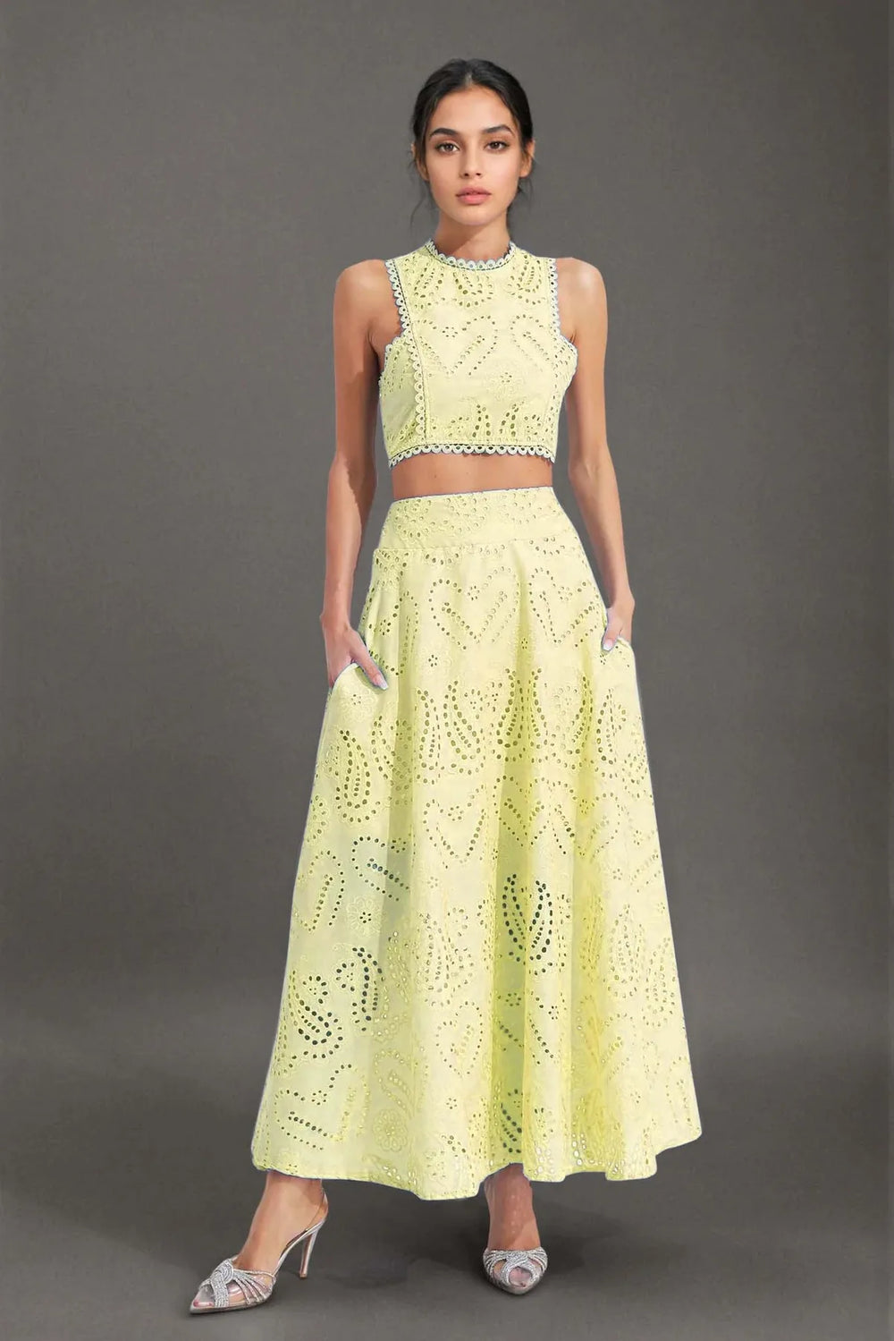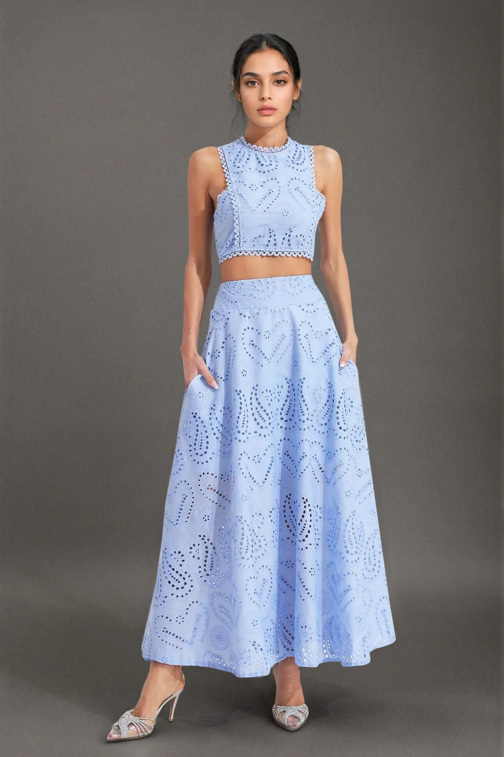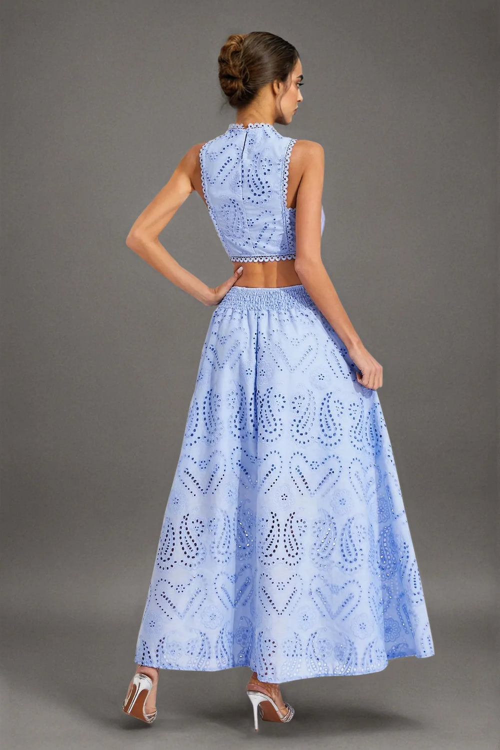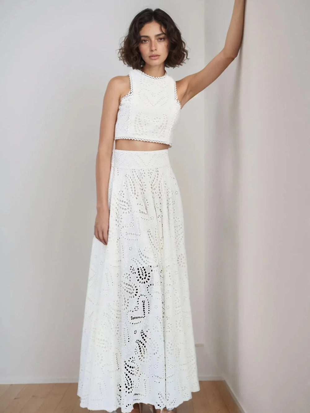 Chic and elegant, this cut-work two-piece set features a round neckline, backless waist-revealing design, and intricate embroidery. Paired with a high-waisted flared midi skirt, it's perfect for vacations, parties, or stylish day-to-night looks.