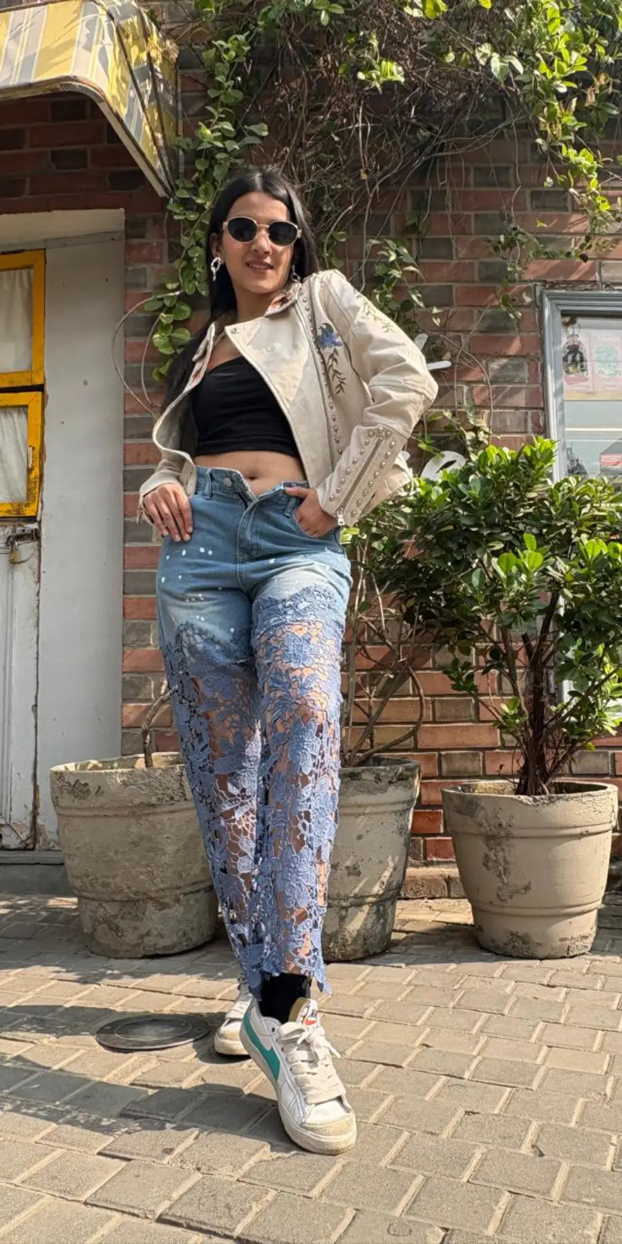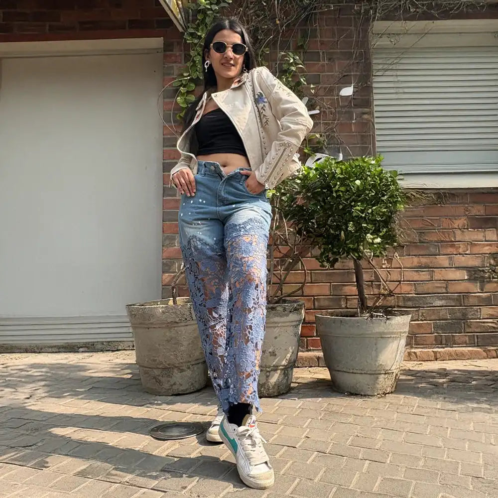 These jeans are a bold reinvention of classic denim, featuring intricate floral lace cut-outs and subtle paint-drop detailing for an artistic finish. Designed in a straight, comfort-fit silhouette with stretchable fabric for ease and movement. Perfect for anytime your denim needs to make a statement.
