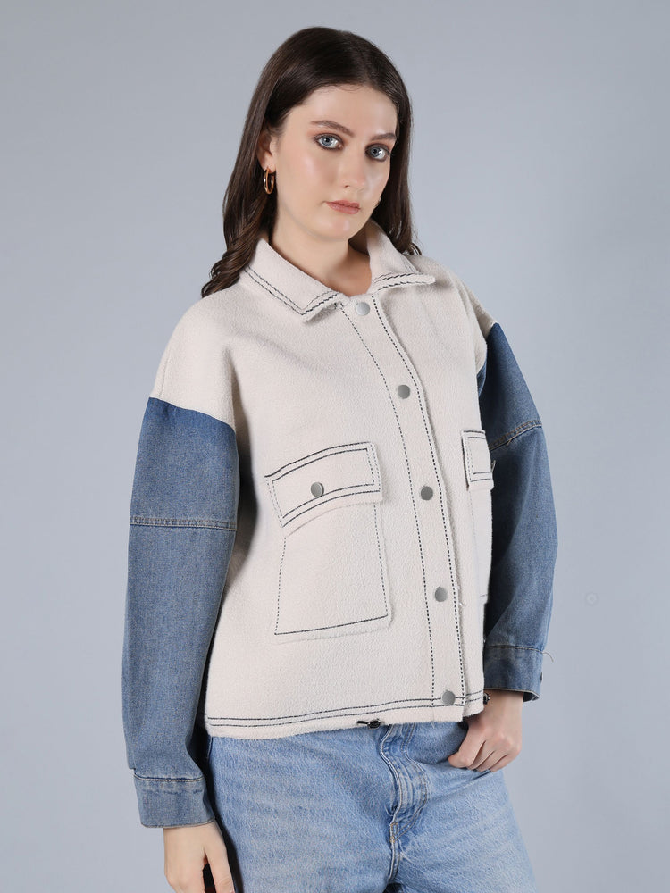 Elevate your style with this Contrast Stitch Jacket - an oversized winter essential featuring denim sleeves, a turn-down collar, and front pockets. Perfect for casual outings or vacations, its slightly stretchable fabric blends trendy elegance with cozy comfort for all seasons.