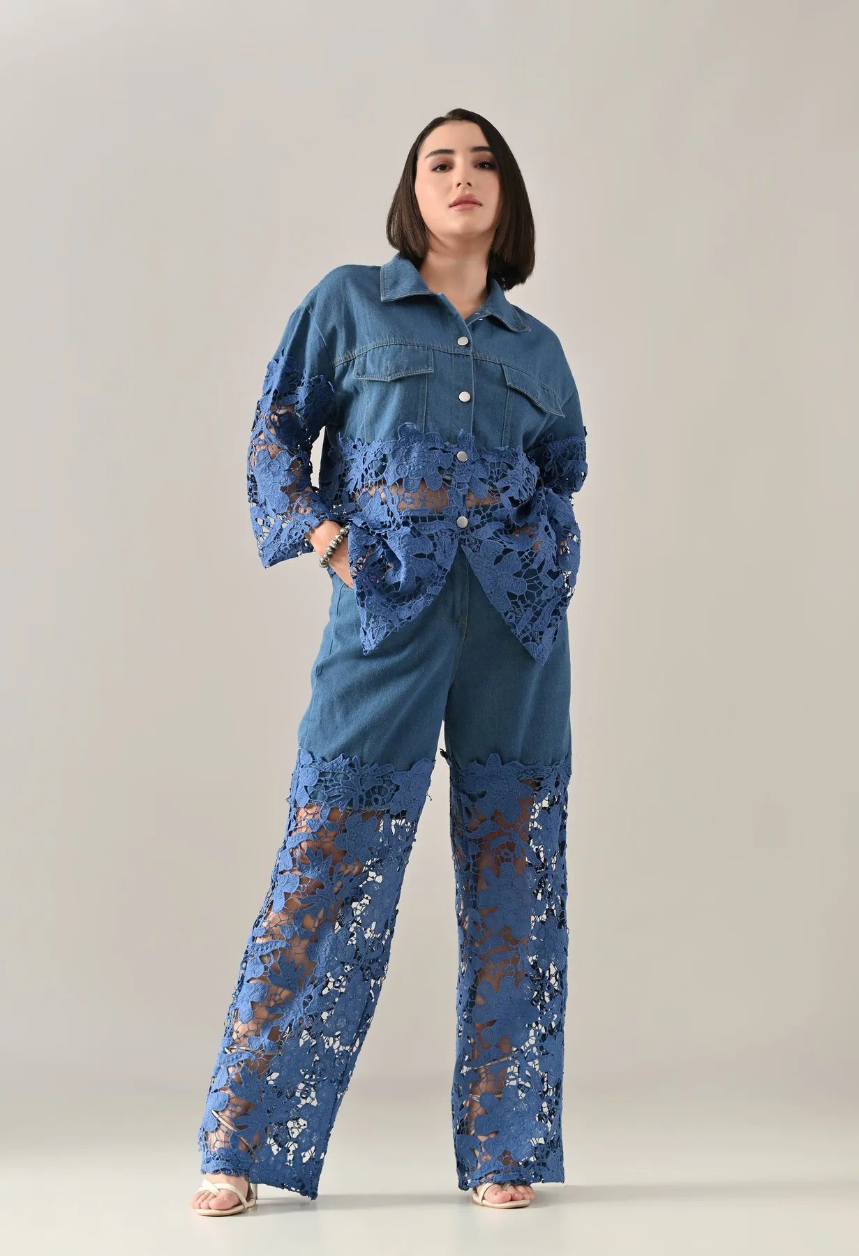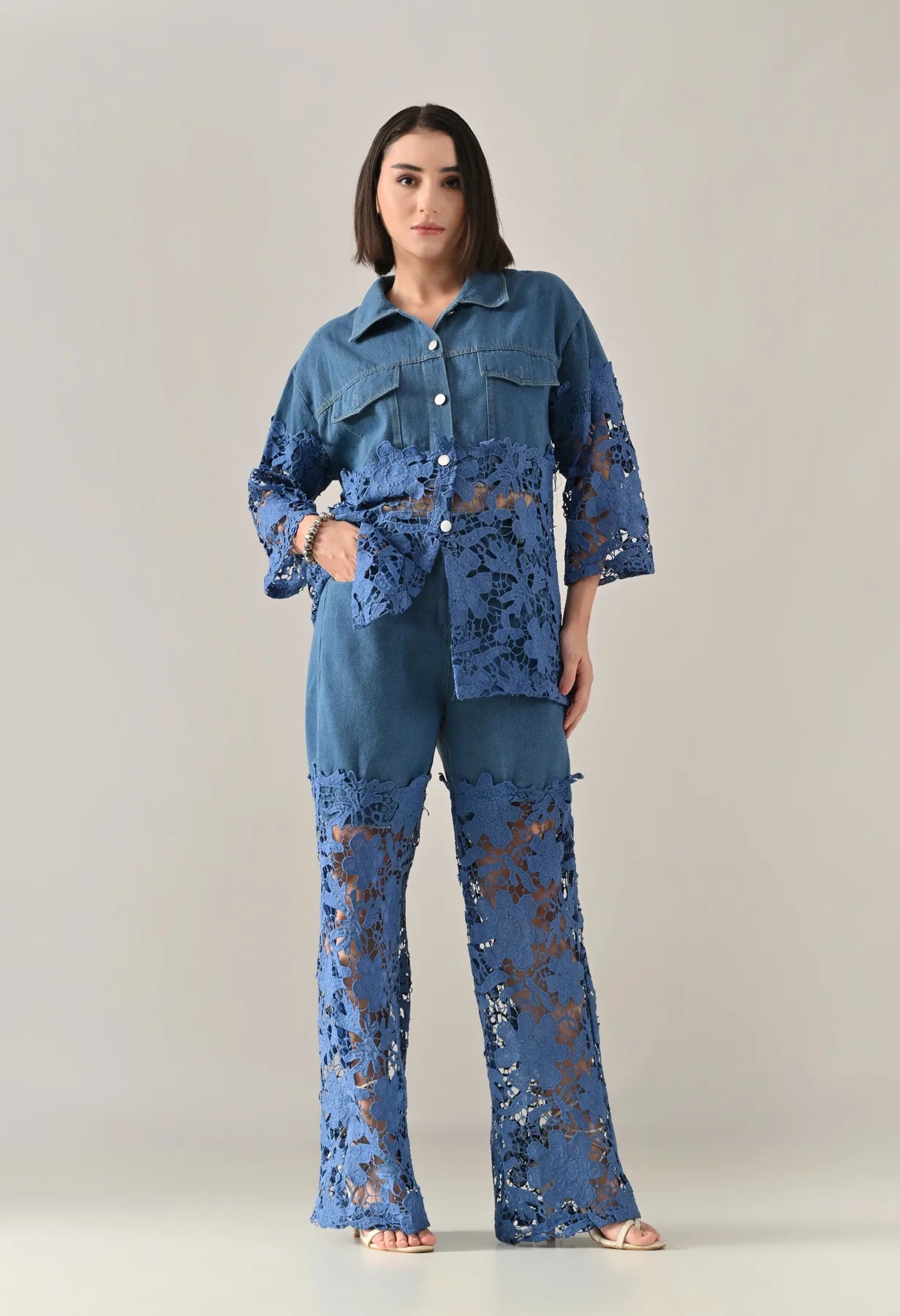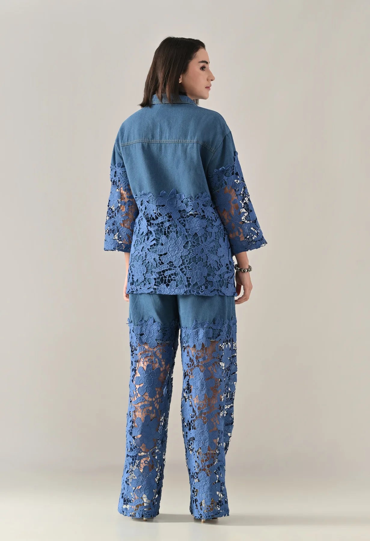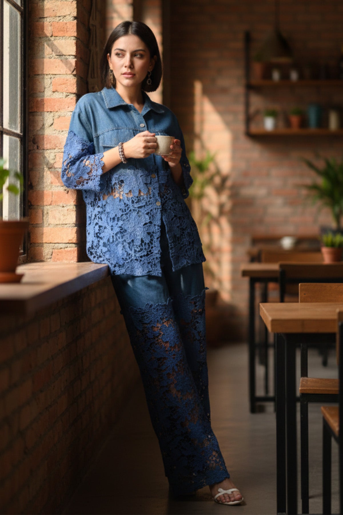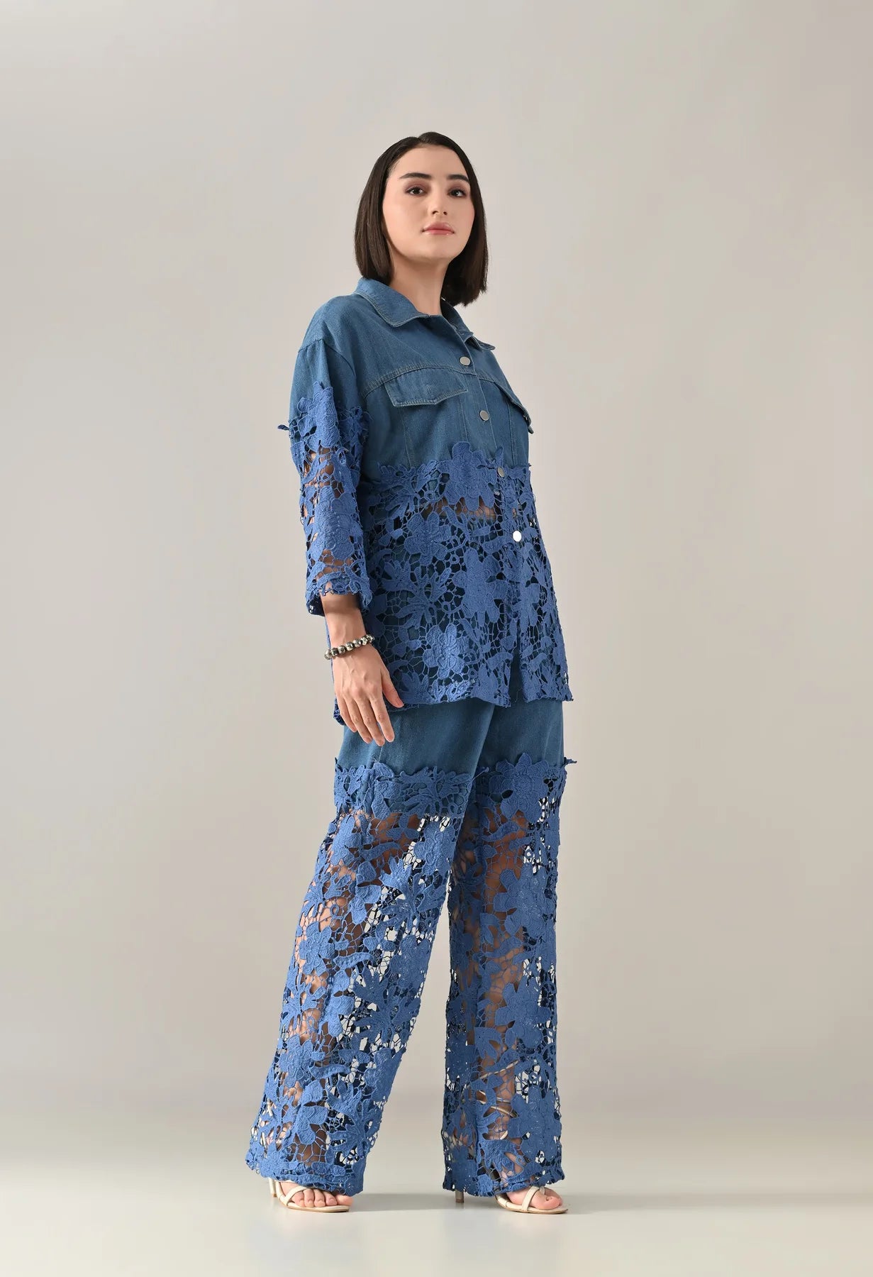 A trendy enzyme-washed denim cord set featuring a regular collar band shirt with an open front placket, showy pockets with flaps, and silver shank buttons for a stylish finish. The design is elevated with lace detailing at the bottom for a feminine touch. Paired with matching denim bottoms featuring a waistband with open fly and zipper, half elasticated waist, and belt loops for ease and comfort. Finished with contrast stitching details, this set is crafted from soft, comfortable, non-stretchable fabric, blending casual denim appeal with chic lace accents.