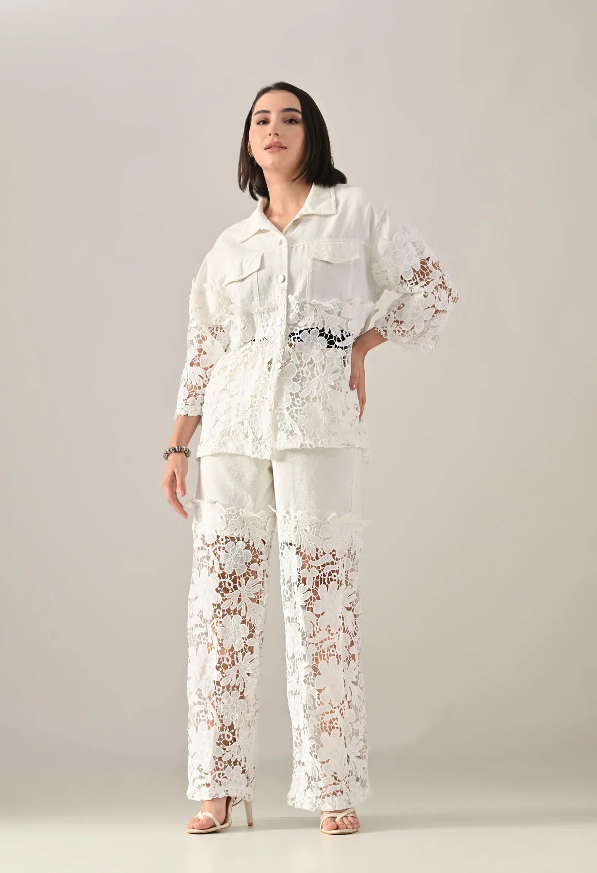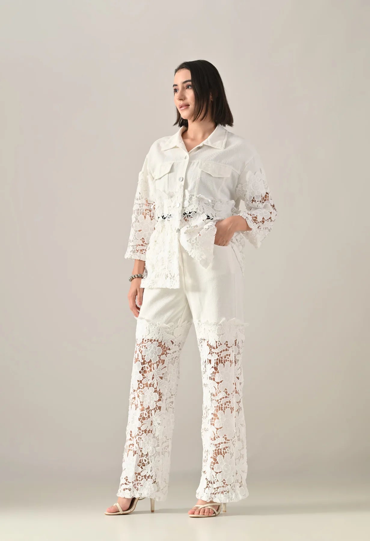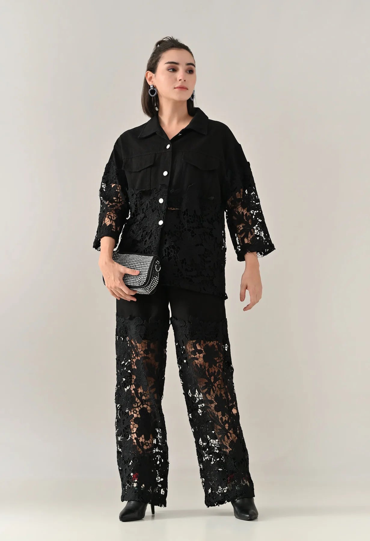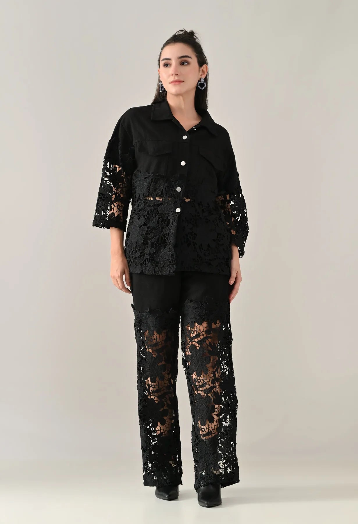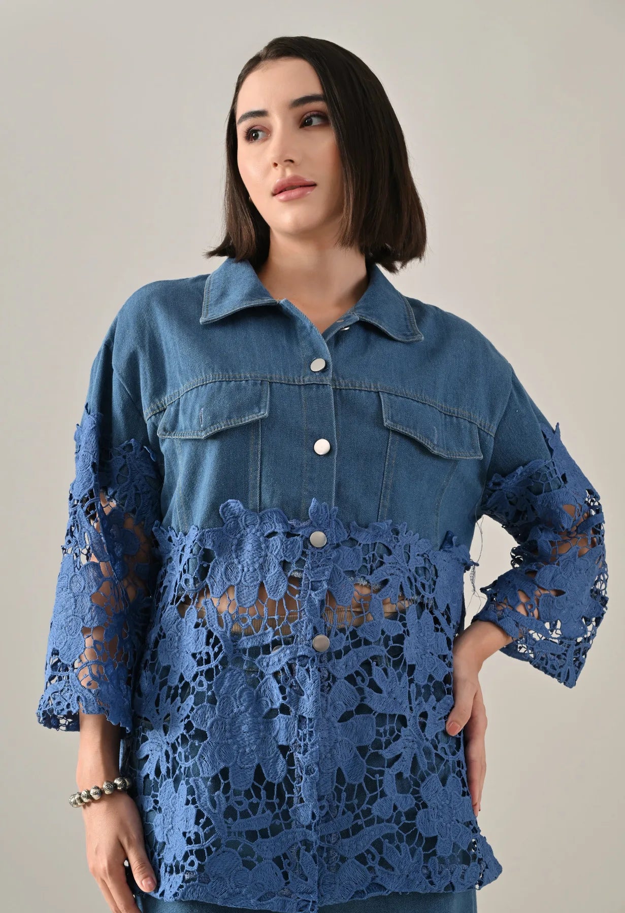 A trendy enzyme-washed denim cord set featuring a regular collar band shirt with an open front placket, showy pockets with flaps, and silver shank buttons for a stylish finish. The design is elevated with lace detailing at the bottom for a feminine touch. Paired with matching denim bottoms featuring a waistband with open fly and zipper, half elasticated waist, and belt loops for ease and comfort. Finished with contrast stitching details, this set is crafted from soft, comfortable, non-stretchable fabric, blending casual denim appeal with chic lace accents.