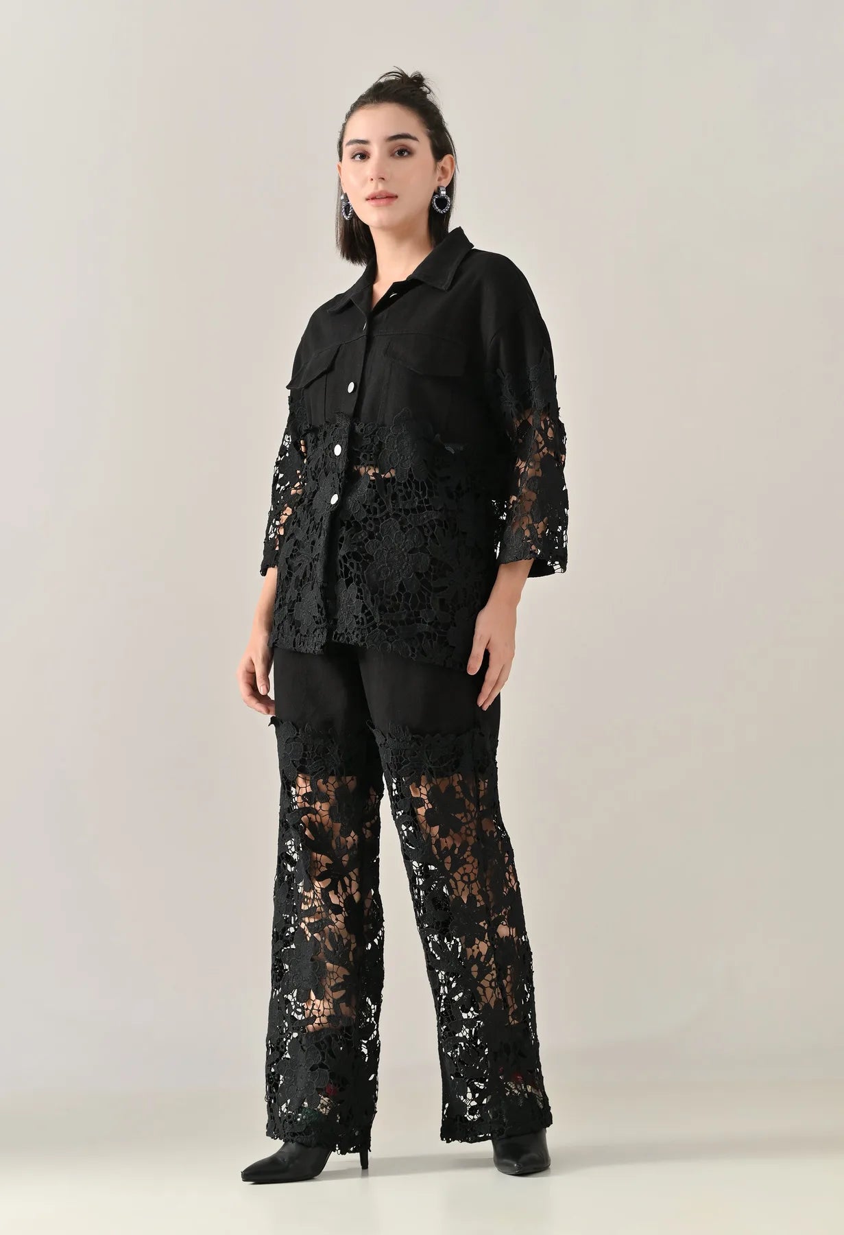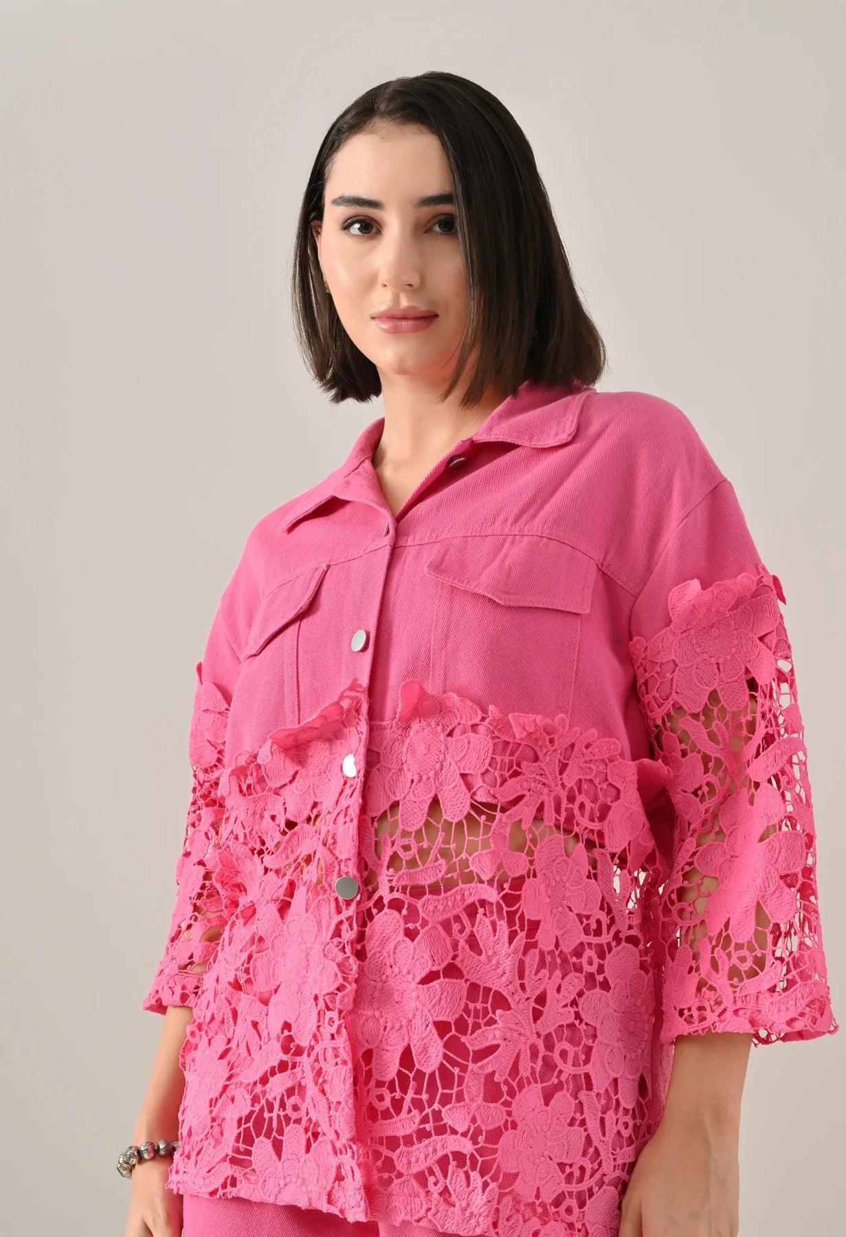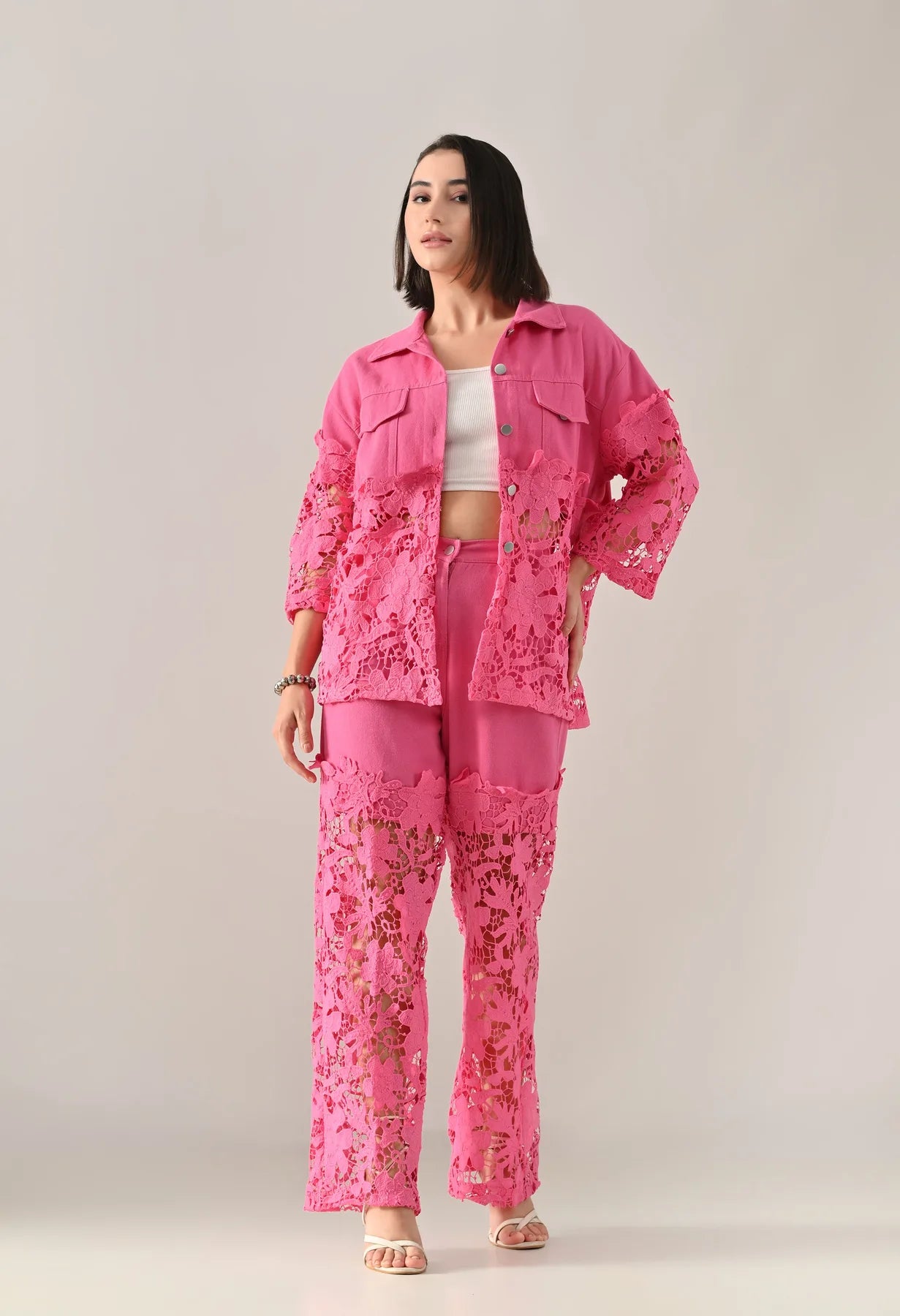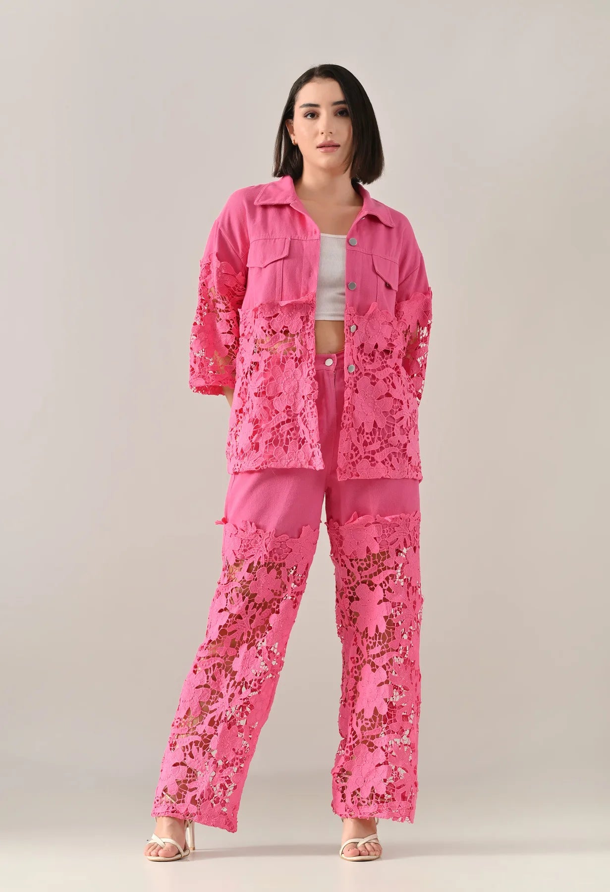 A trendy enzyme-washed denim cord set featuring a regular collar band shirt with an open front placket, showy pockets with flaps, and silver shank buttons for a stylish finish. The design is elevated with lace detailing at the bottom for a feminine touch. Paired with matching denim bottoms featuring a waistband with open fly and zipper, half elasticated waist, and belt loops for ease and comfort. Finished with contrast stitching details, this set is crafted from soft, comfortable, non-stretchable fabric, blending casual denim appeal with chic lace accents.