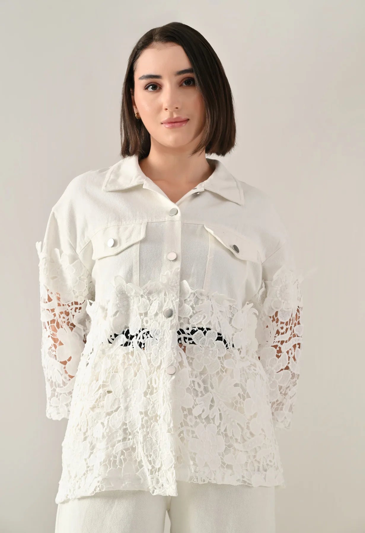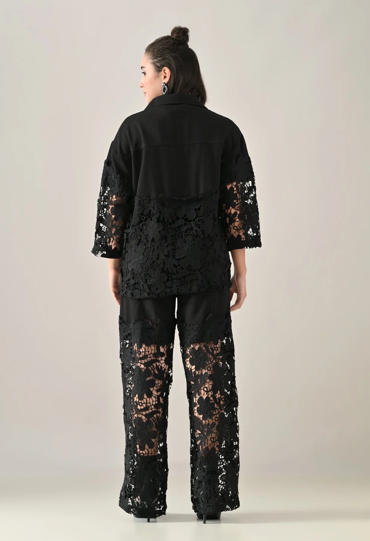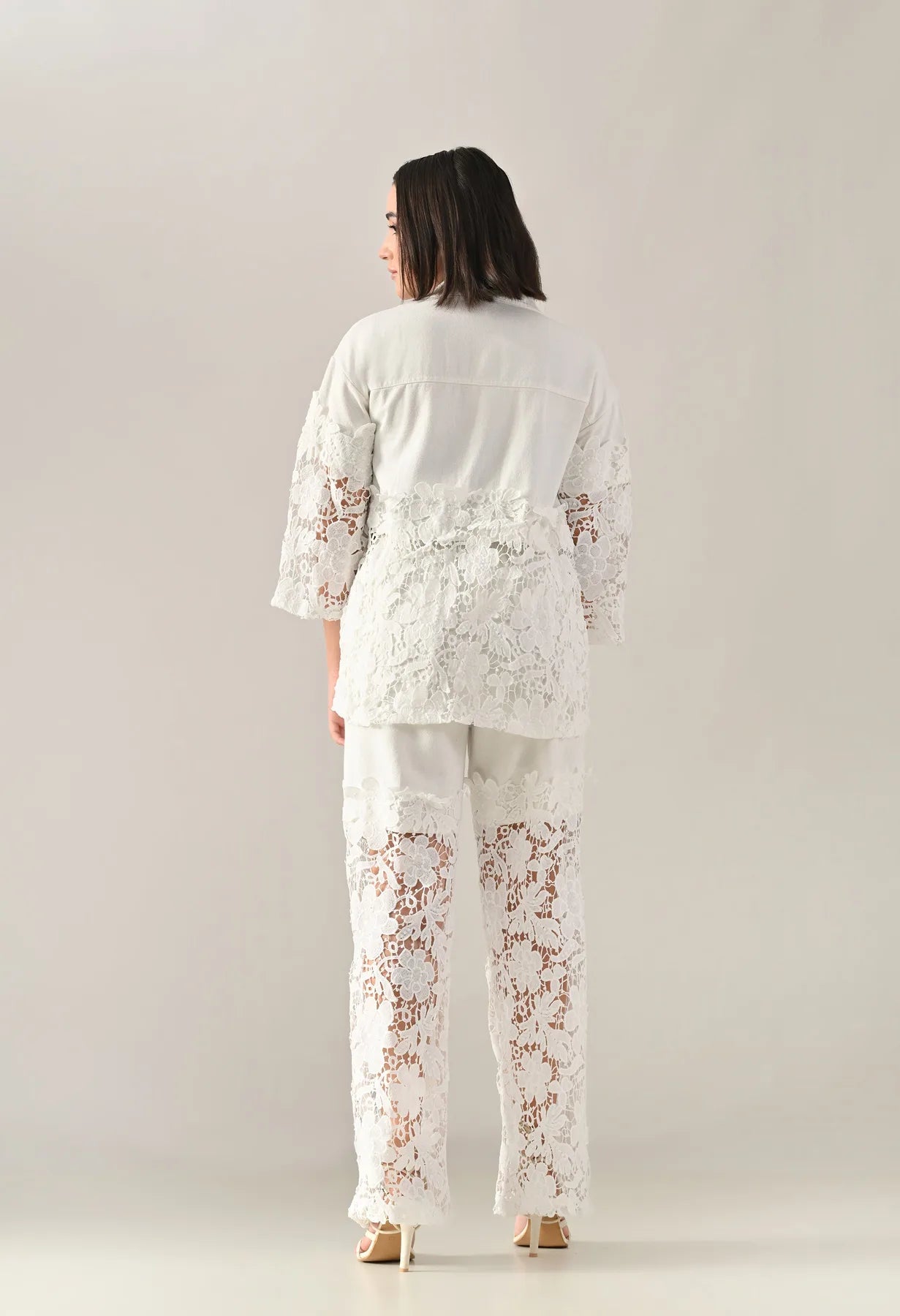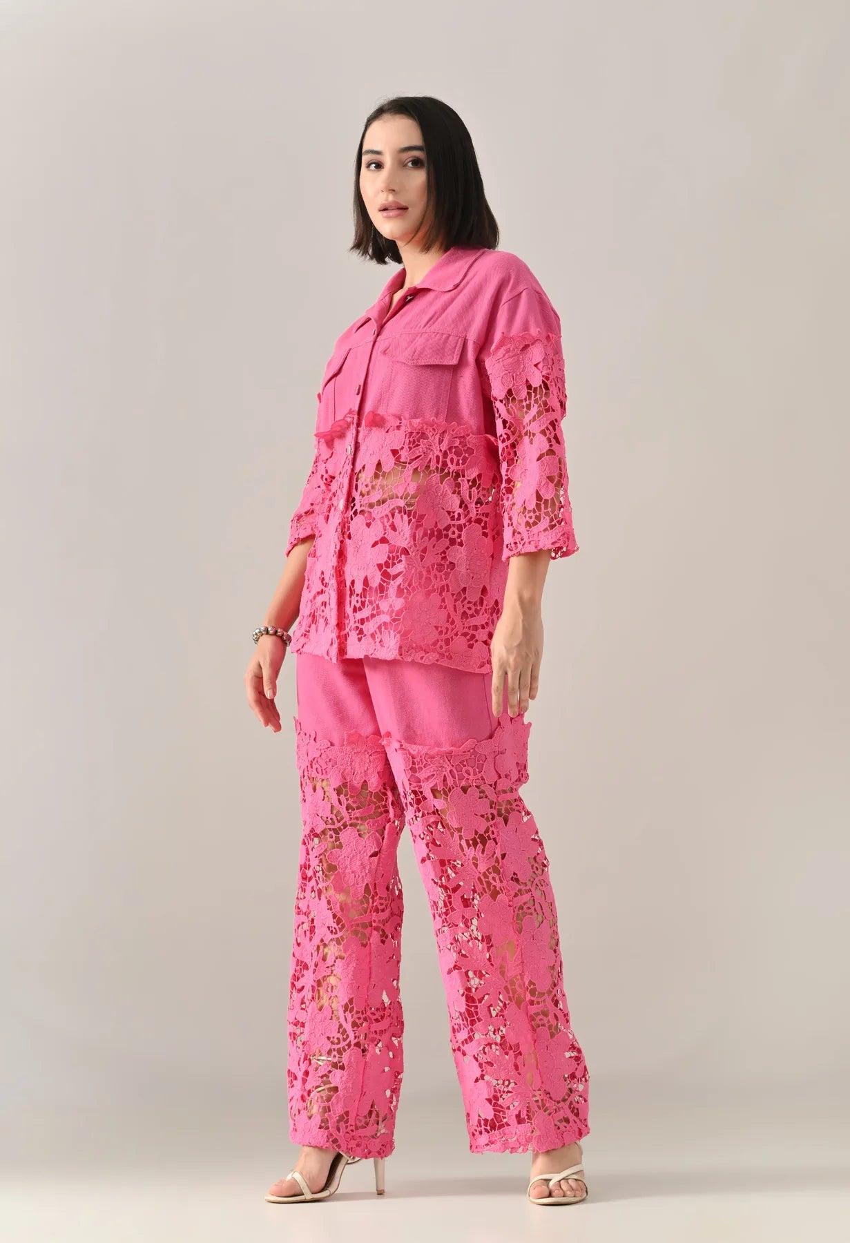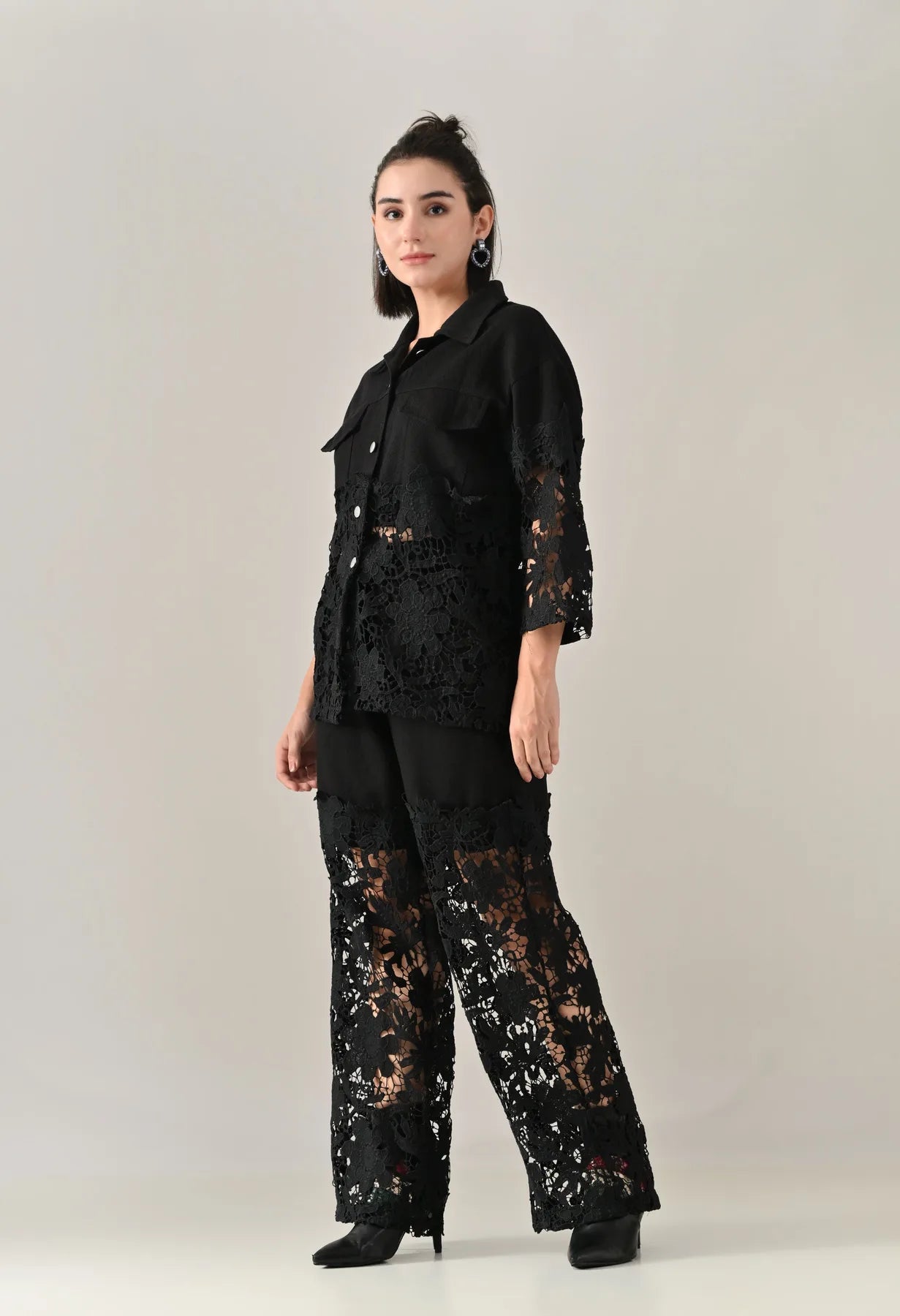 A trendy enzyme-washed denim cord set featuring a regular collar band shirt with an open front placket, showy pockets with flaps, and silver shank buttons for a stylish finish. The design is elevated with lace detailing at the bottom for a feminine touch. Paired with matching denim bottoms featuring a waistband with open fly and zipper, half elasticated waist, and belt loops for ease and comfort. Finished with contrast stitching details, this set is crafted from soft, comfortable, non-stretchable fabric, blending casual denim appeal with chic lace accents.