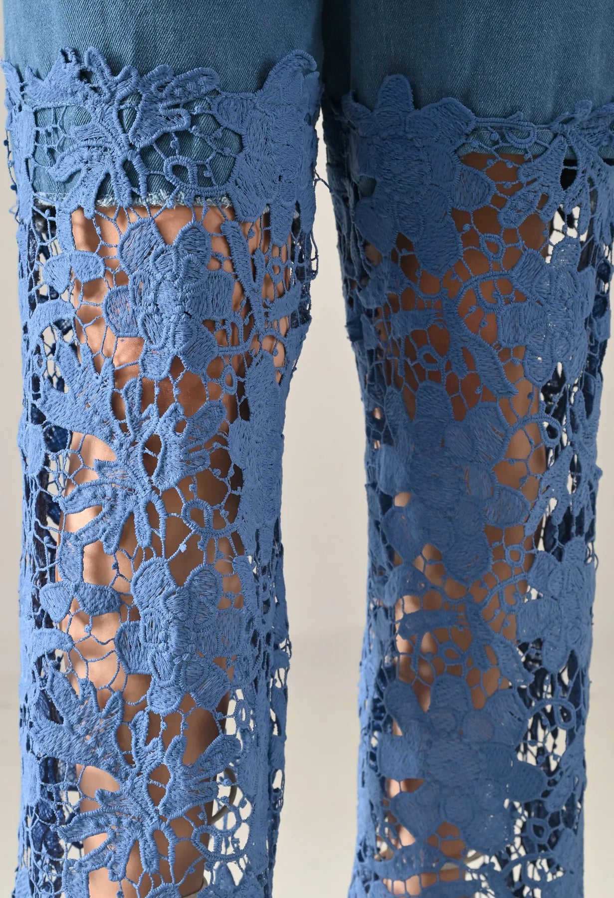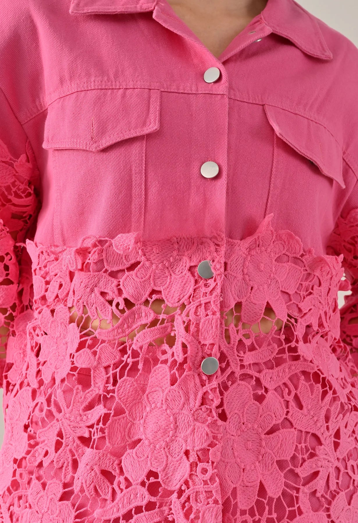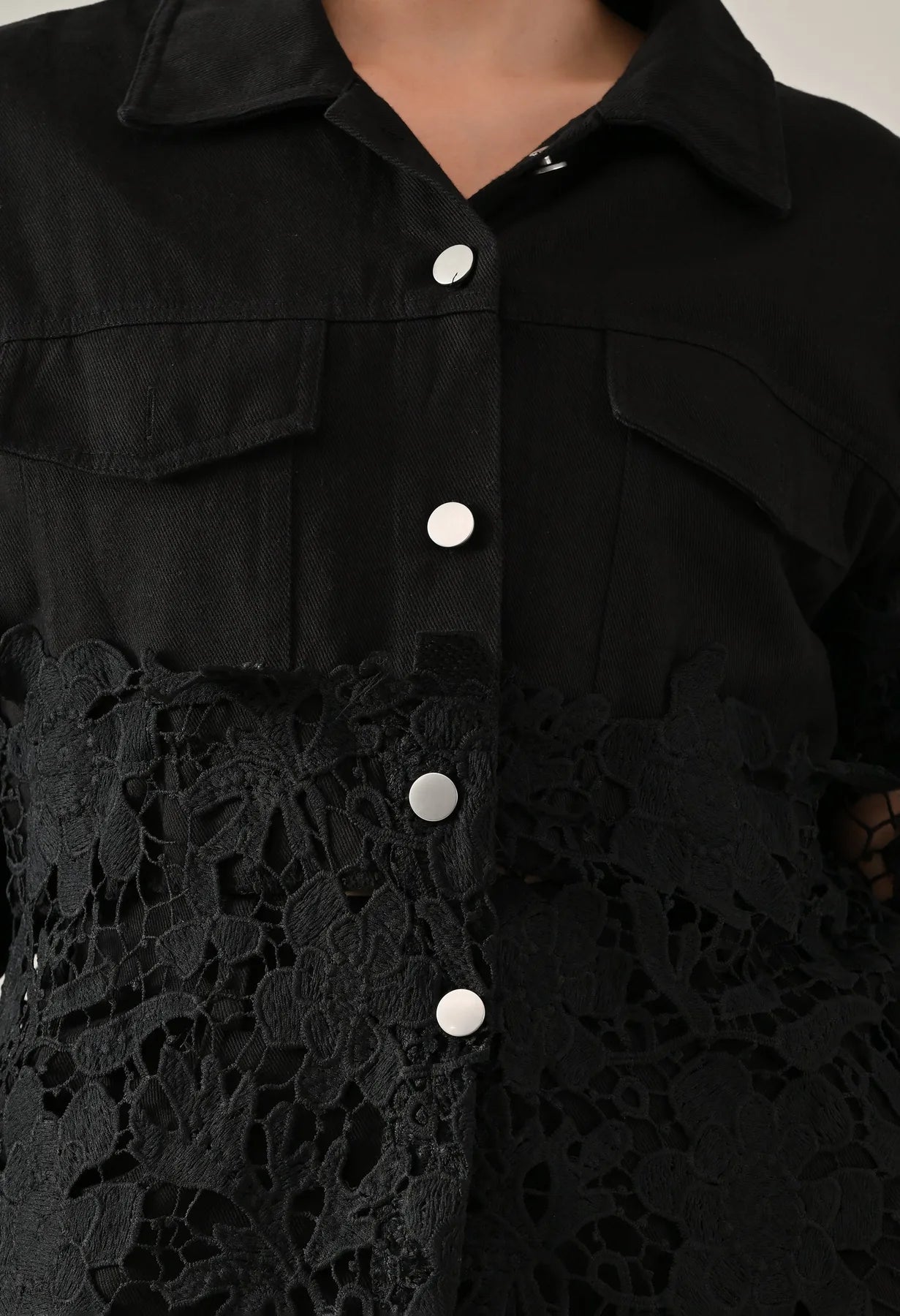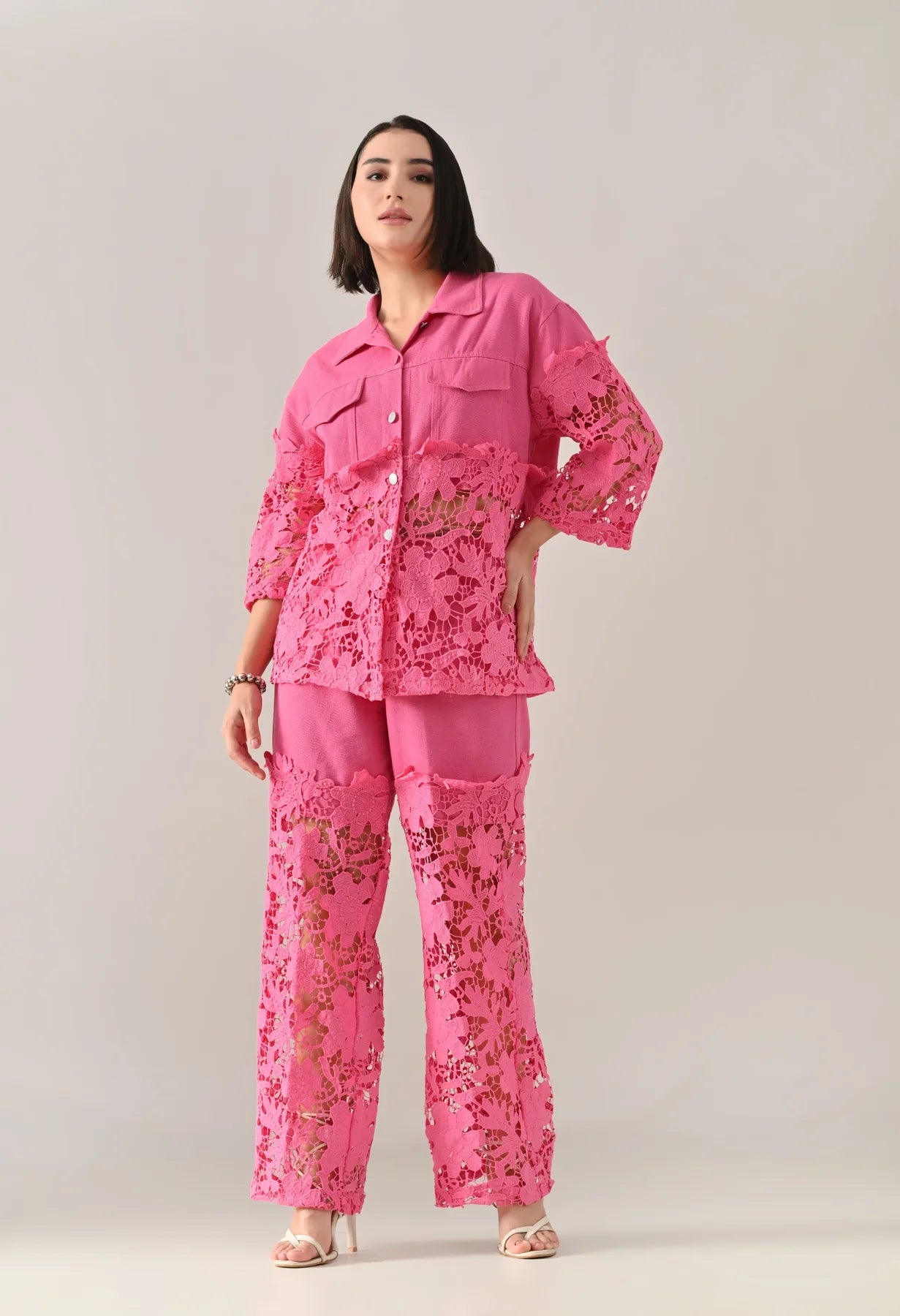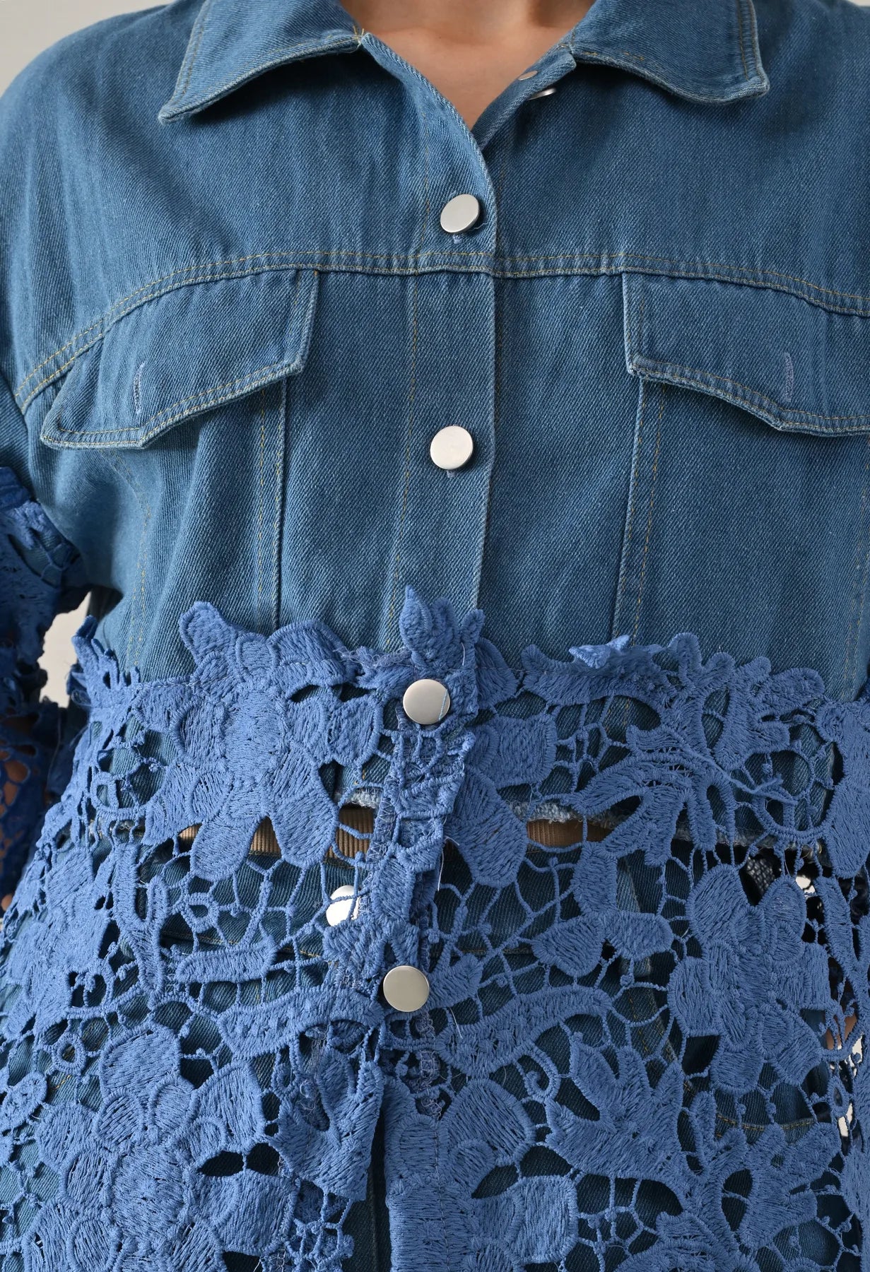 A trendy enzyme-washed denim cord set featuring a regular collar band shirt with an open front placket, showy pockets with flaps, and silver shank buttons for a stylish finish. The design is elevated with lace detailing at the bottom for a feminine touch. Paired with matching denim bottoms featuring a waistband with open fly and zipper, half elasticated waist, and belt loops for ease and comfort. Finished with contrast stitching details, this set is crafted from soft, comfortable, non-stretchable fabric, blending casual denim appeal with chic lace accents.