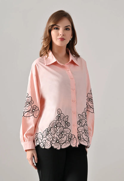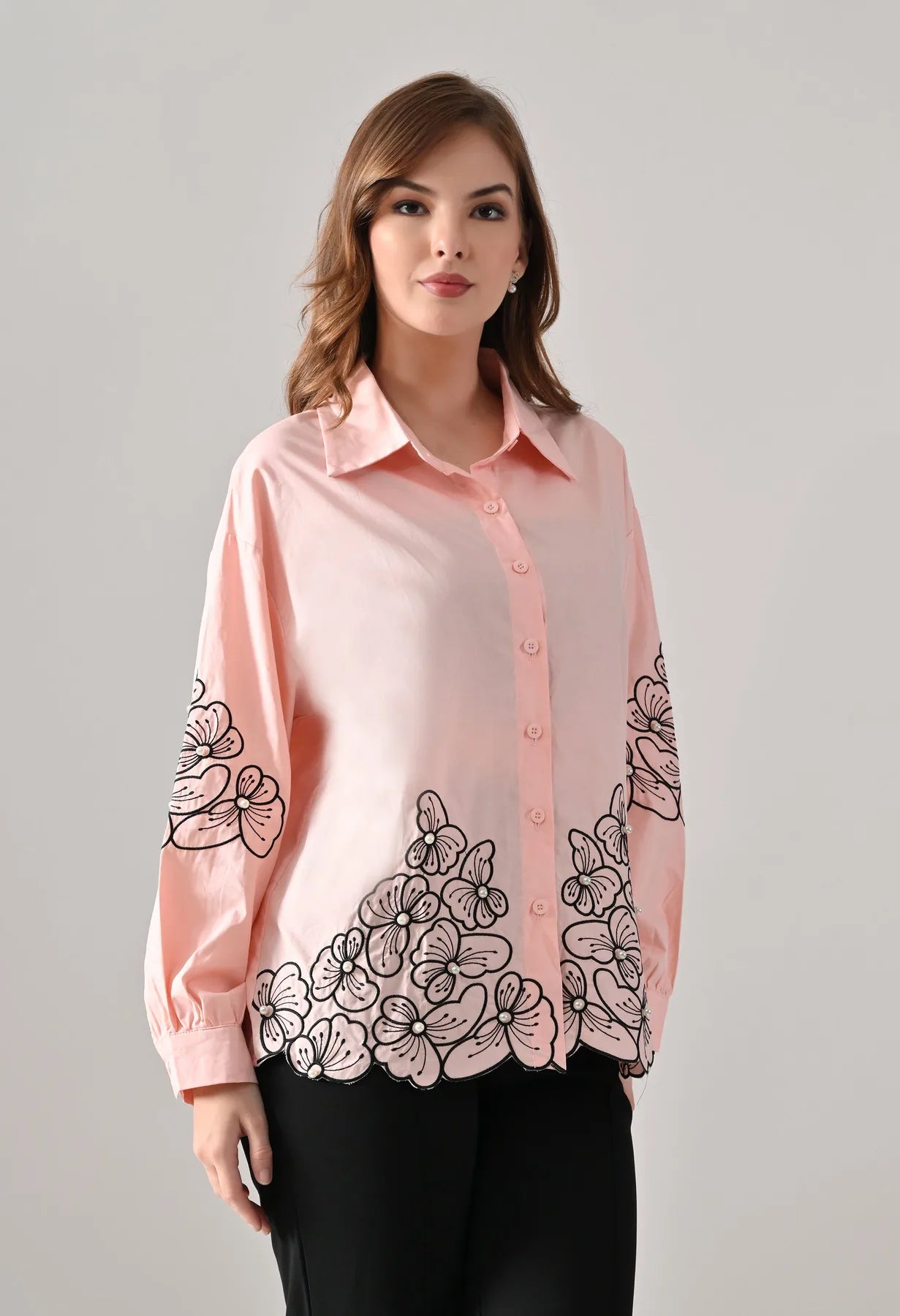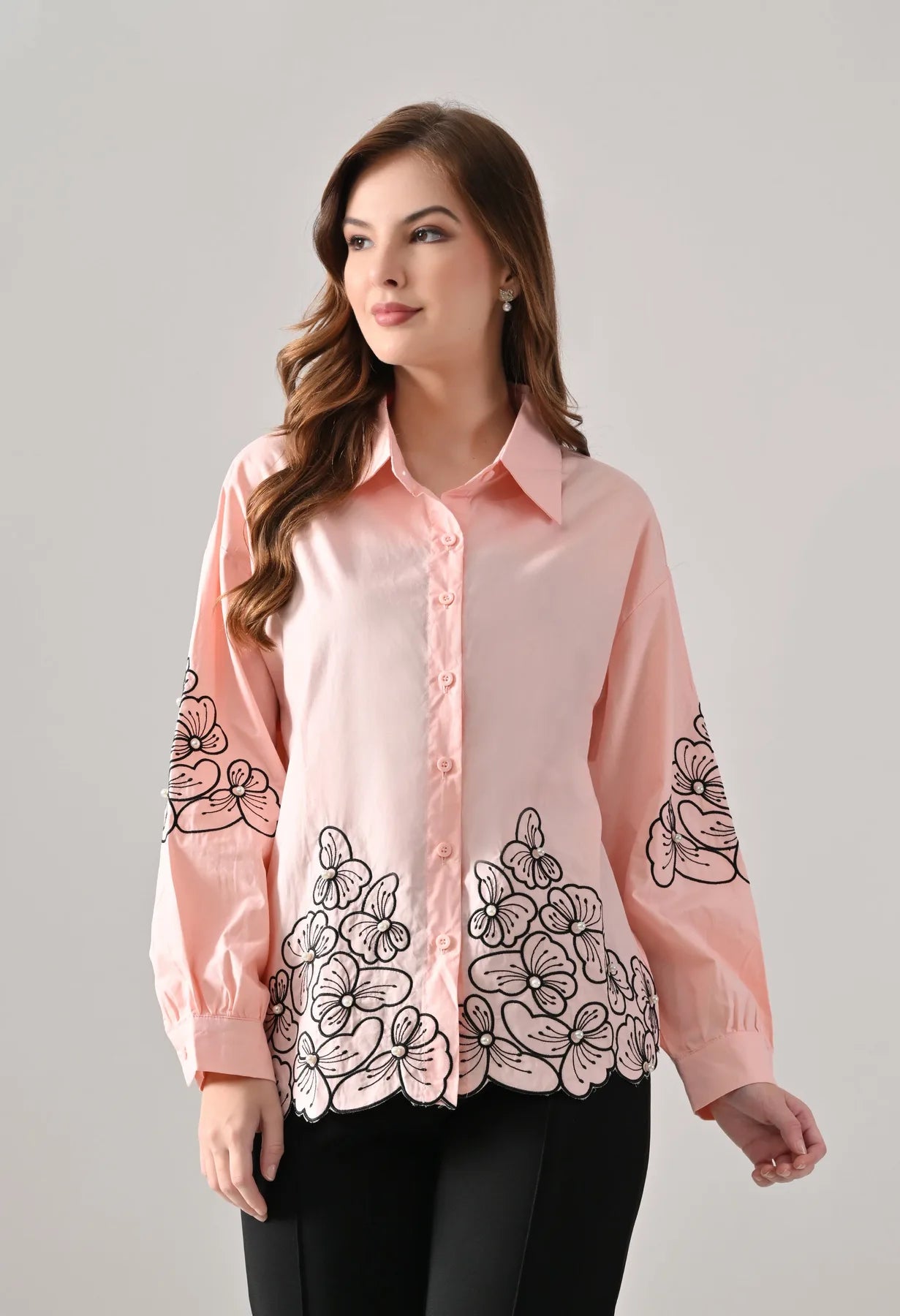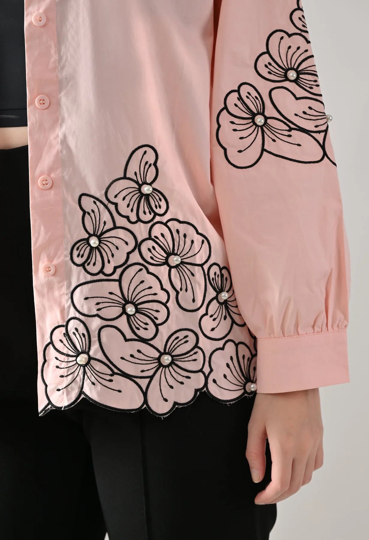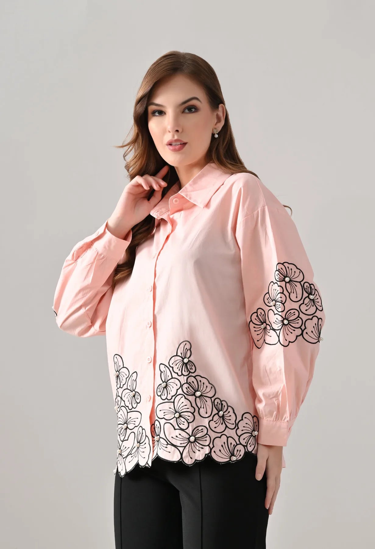 The Blush Bloom Embroidered Shirt brings feminine charm with its soft pink hue and bold floral embroidery along the hem and sleeves. Designed with a classic collar, front button closure, long sleeves with cuffs, and a relaxed silhouette, this shirt blends comfort with elegance. The scalloped edge and subtle pearl accents add a refined finish, making it perfect for day-to-night styling.