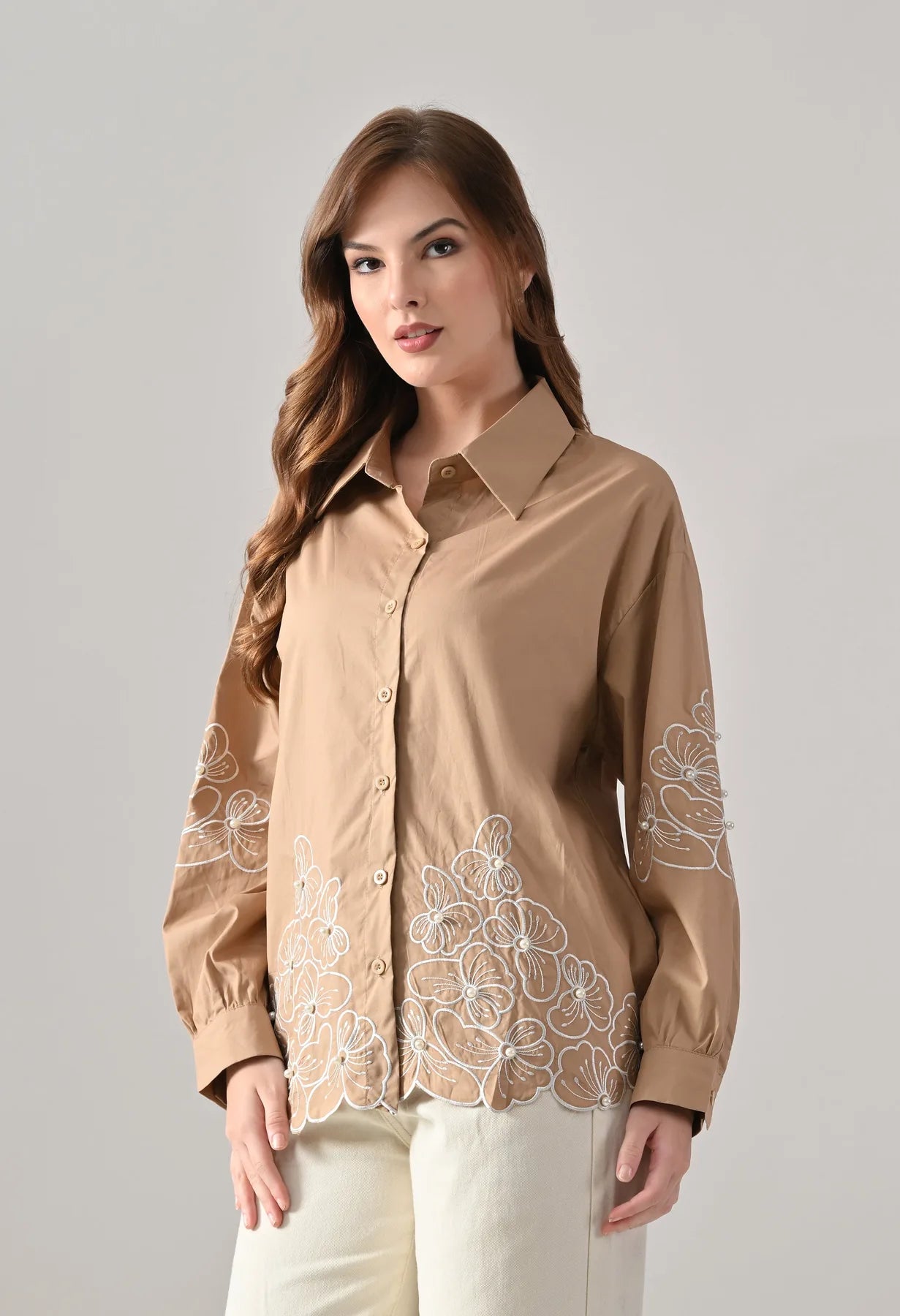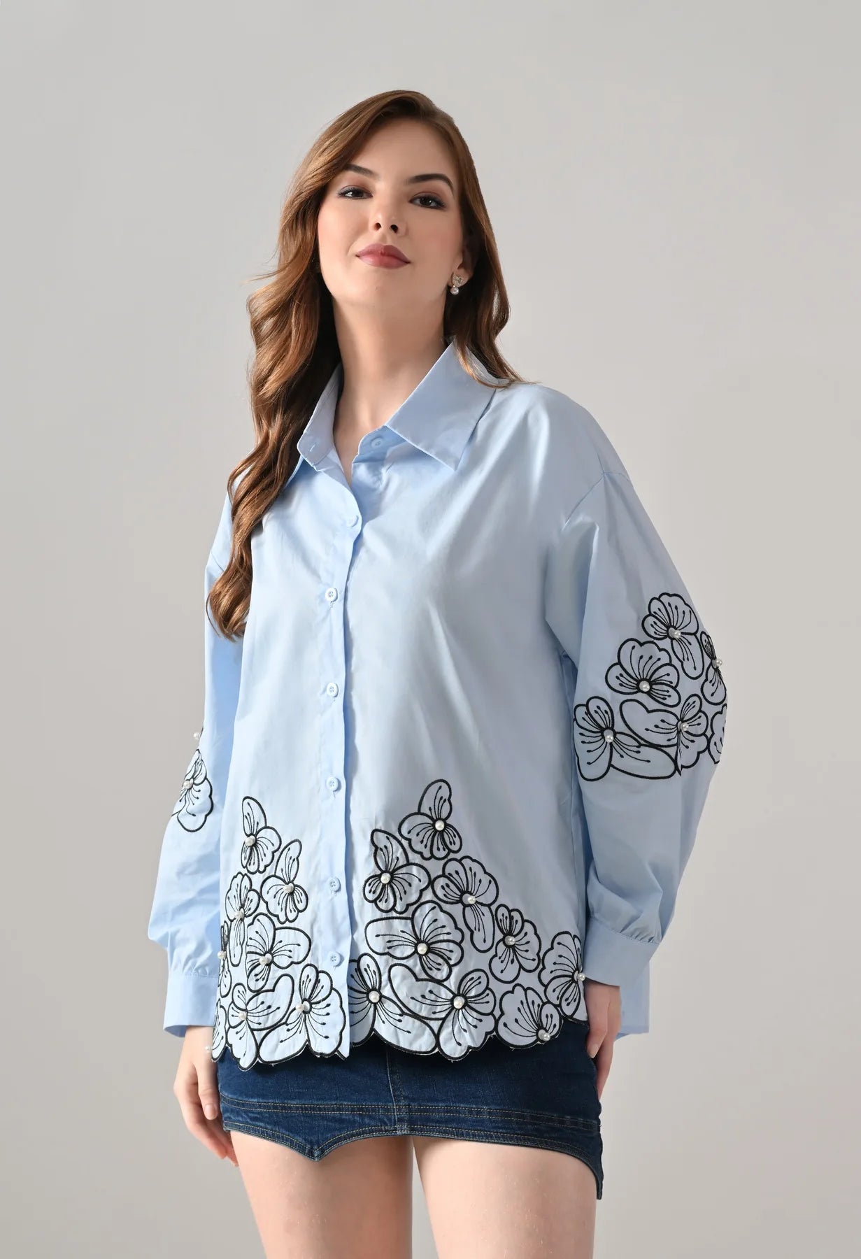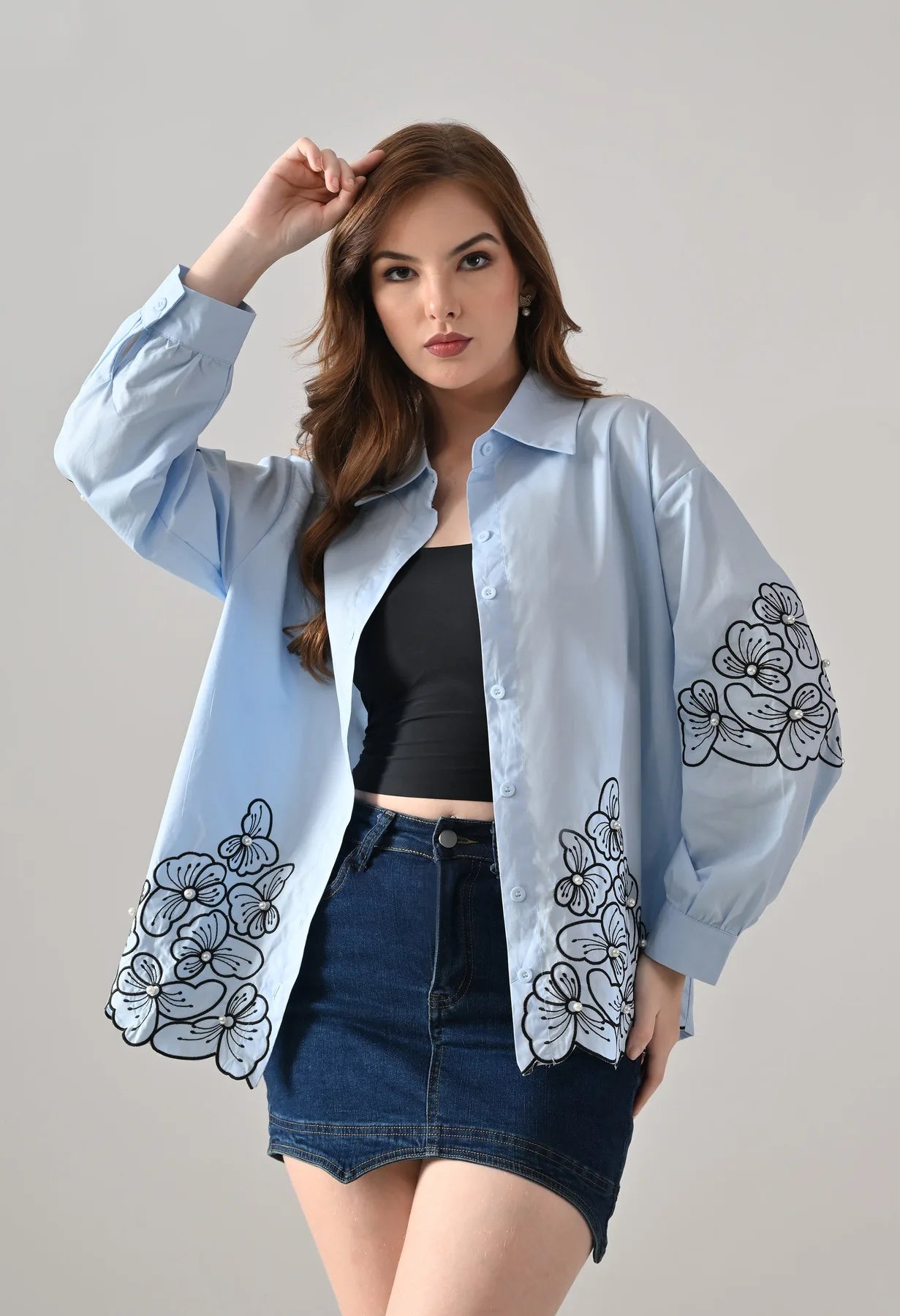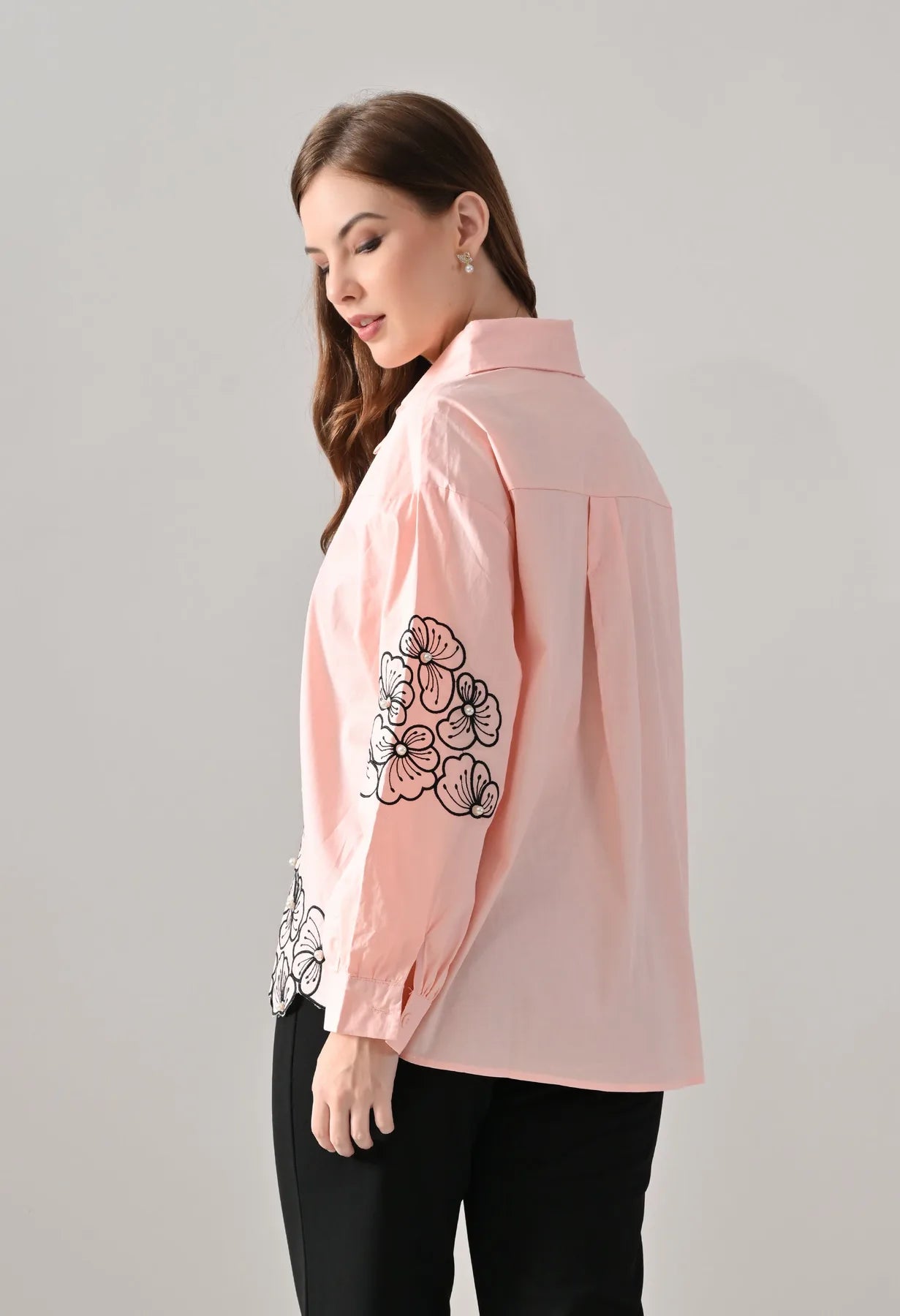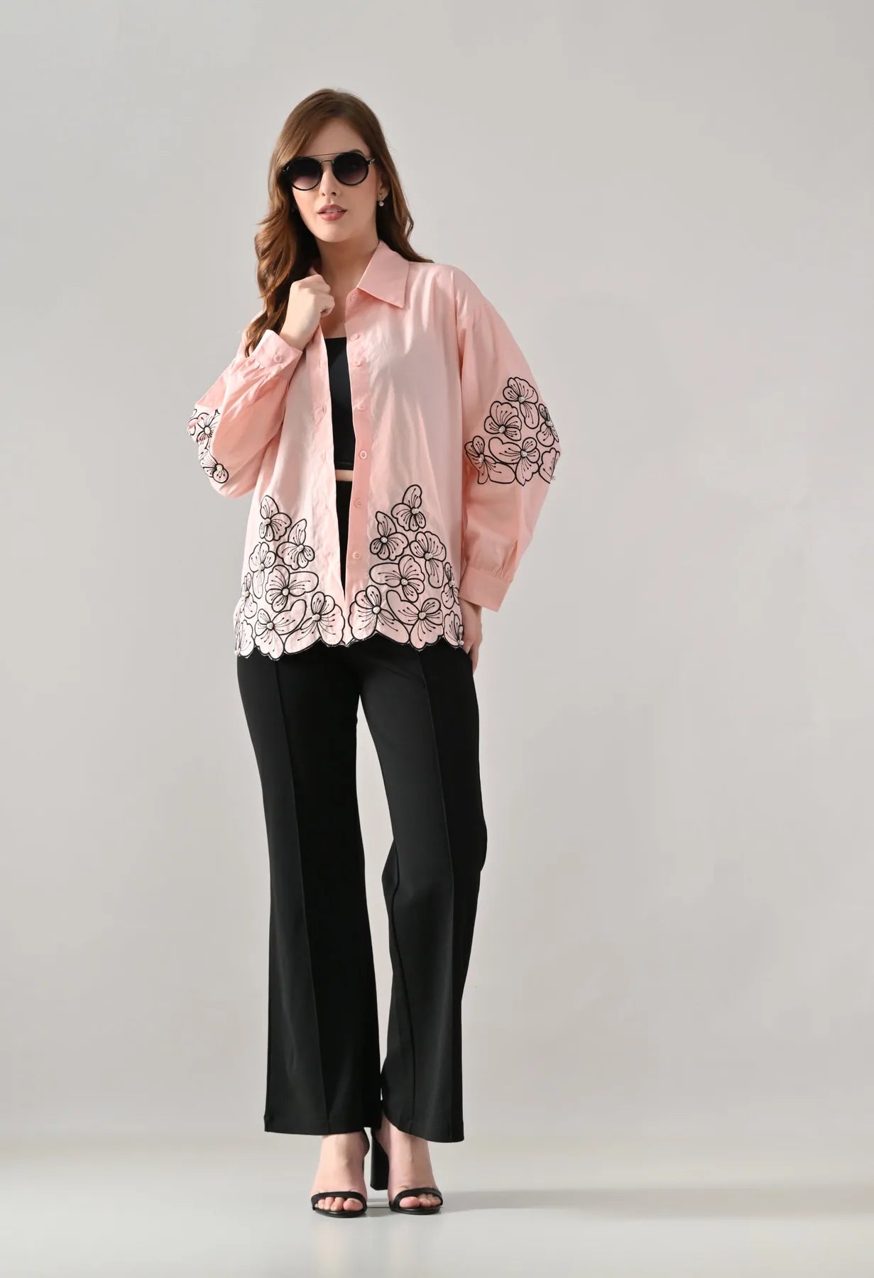 The Blush Bloom Embroidered Shirt brings feminine charm with its soft pink hue and bold floral embroidery along the hem and sleeves. Designed with a classic collar, front button closure, long sleeves with cuffs, and a relaxed silhouette, this shirt blends comfort with elegance. The scalloped edge and subtle pearl accents add a refined finish, making it perfect for day-to-night styling.