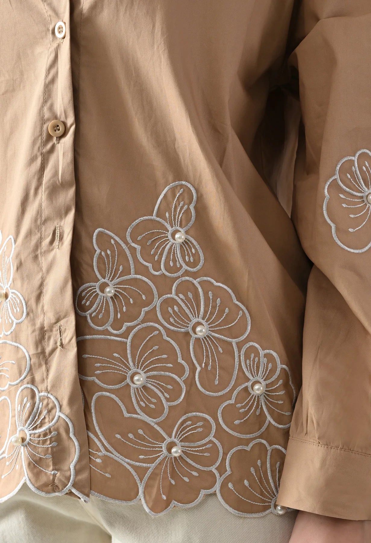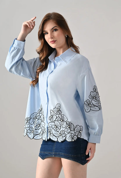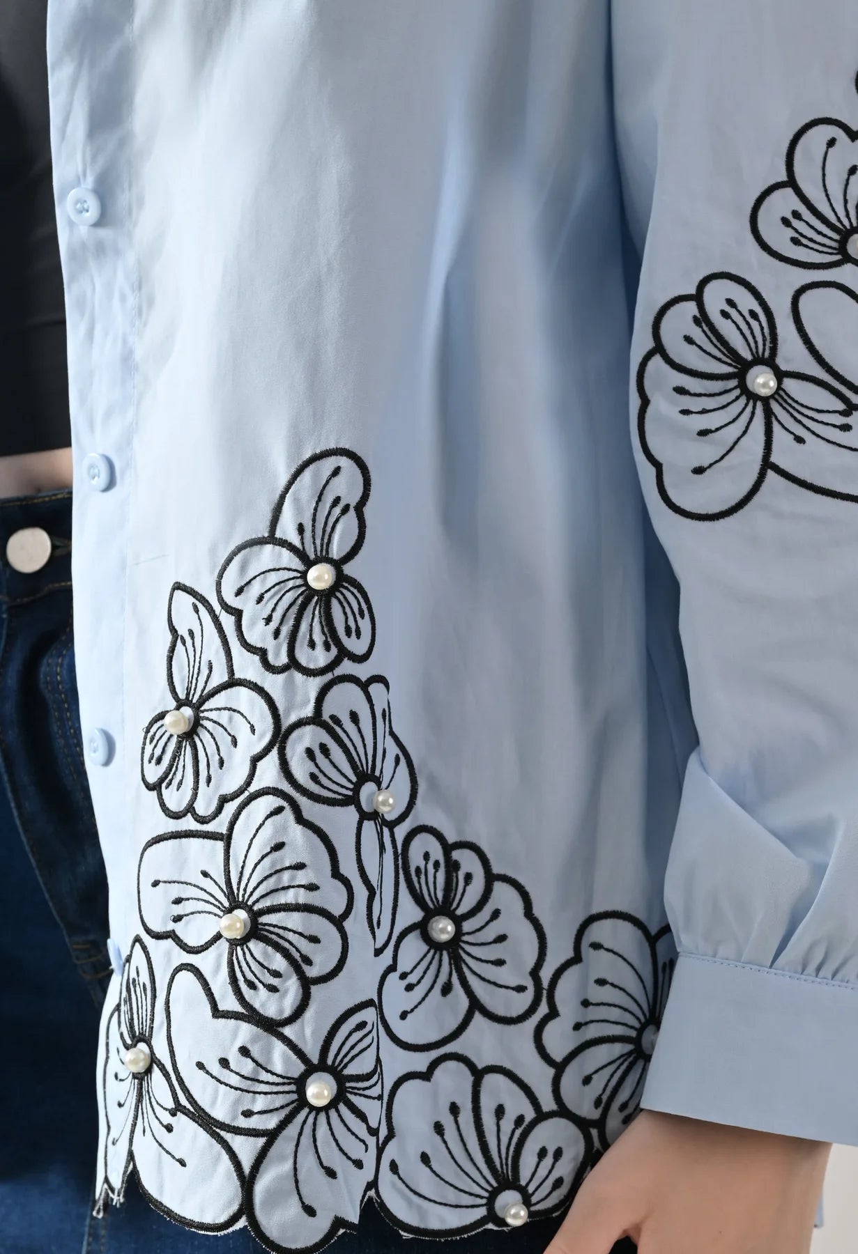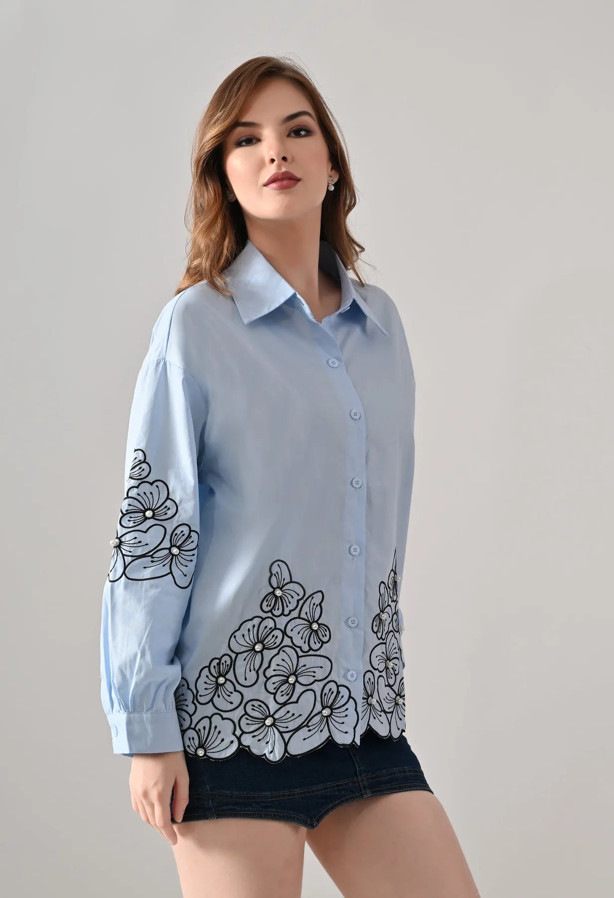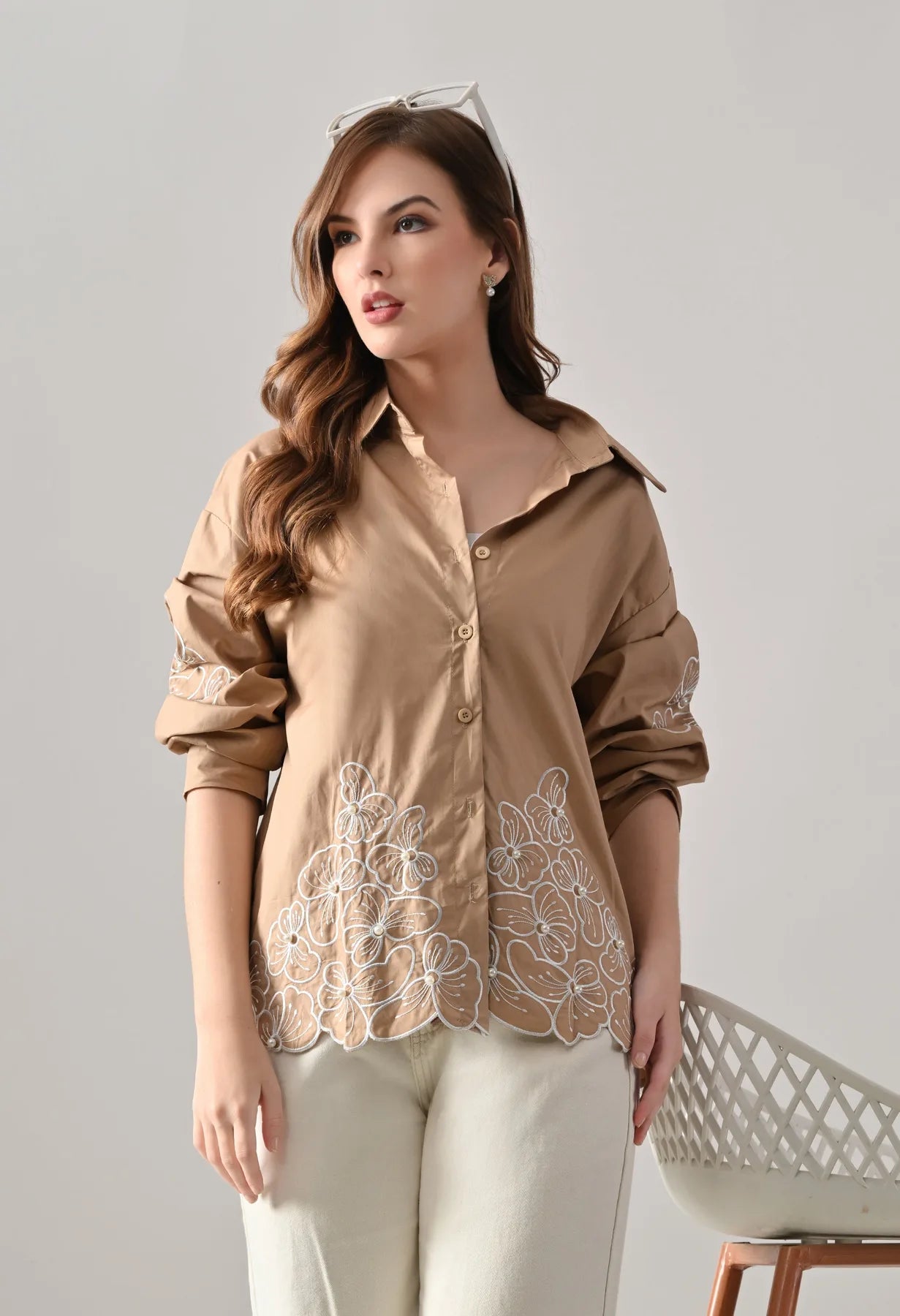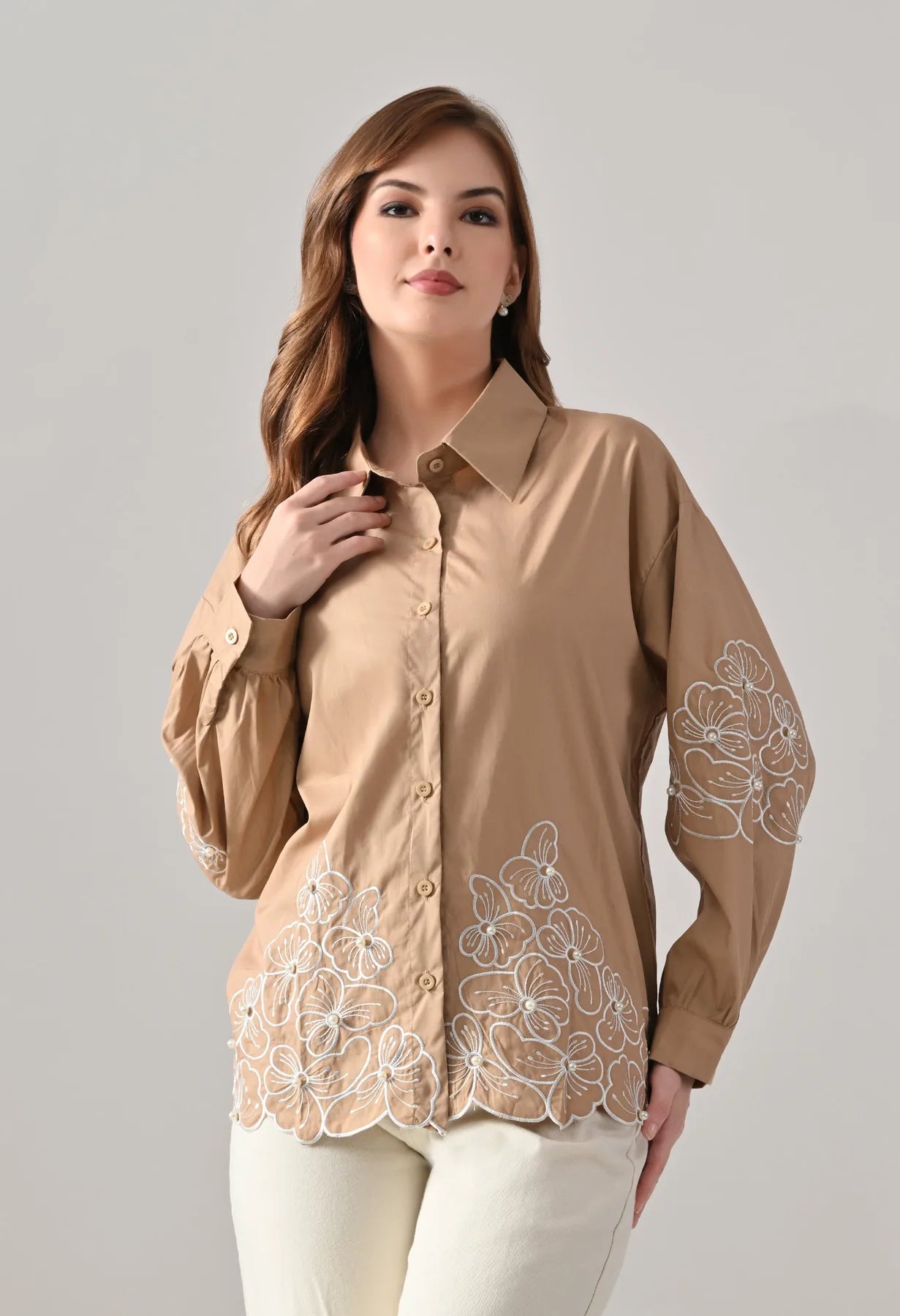 The Blush Bloom Embroidered Shirt brings feminine charm with its soft pink hue and bold floral embroidery along the hem and sleeves. Designed with a classic collar, front button closure, long sleeves with cuffs, and a relaxed silhouette, this shirt blends comfort with elegance. The scalloped edge and subtle pearl accents add a refined finish, making it perfect for day-to-night styling.