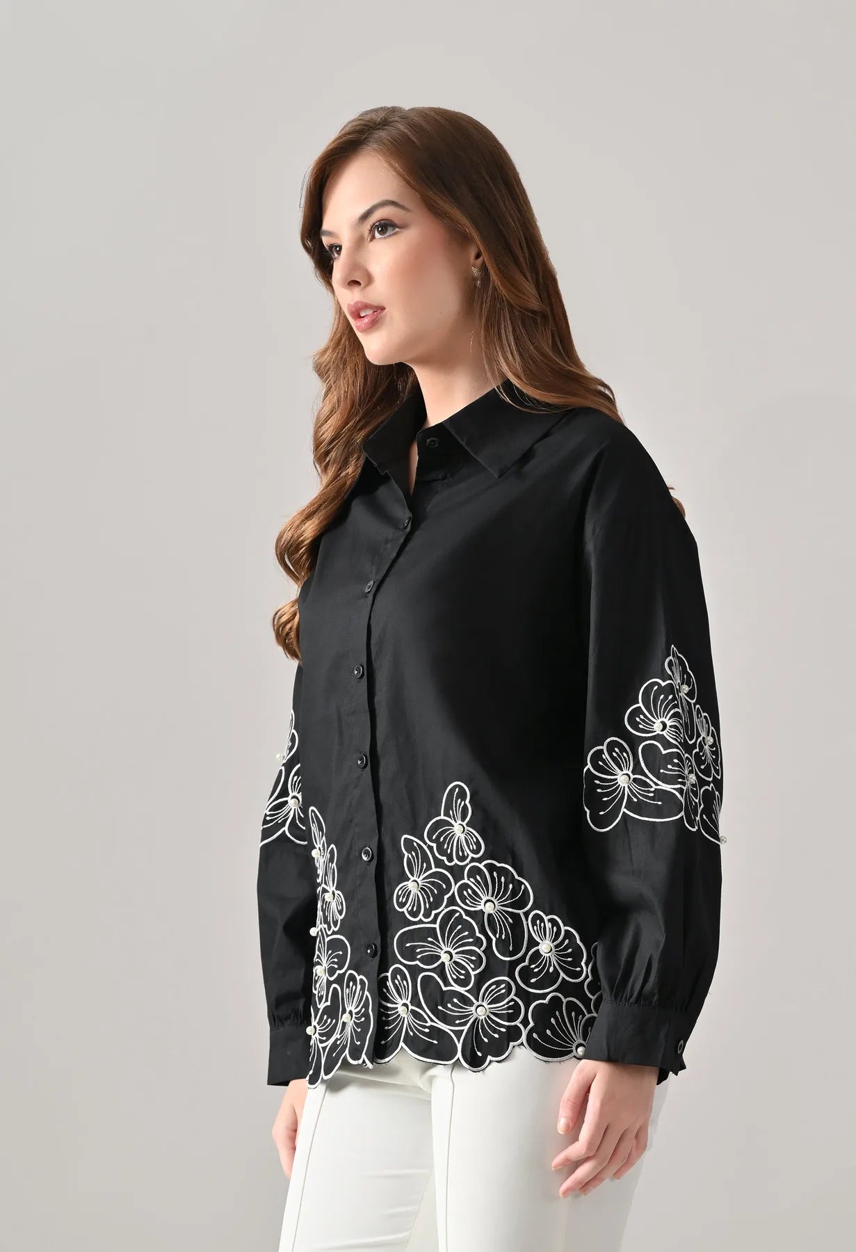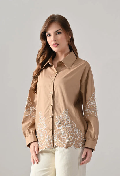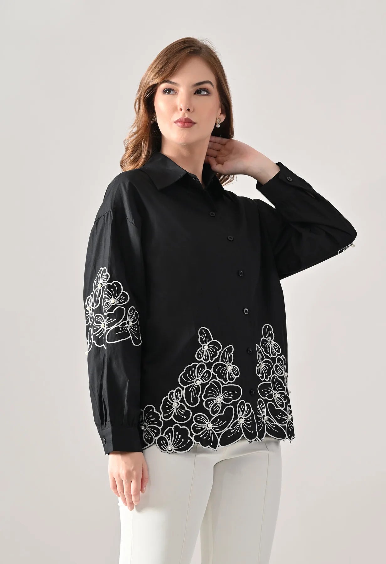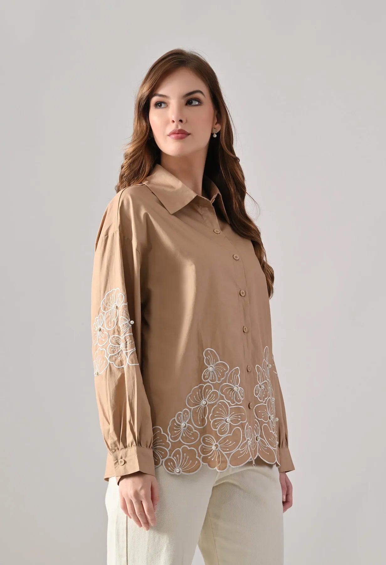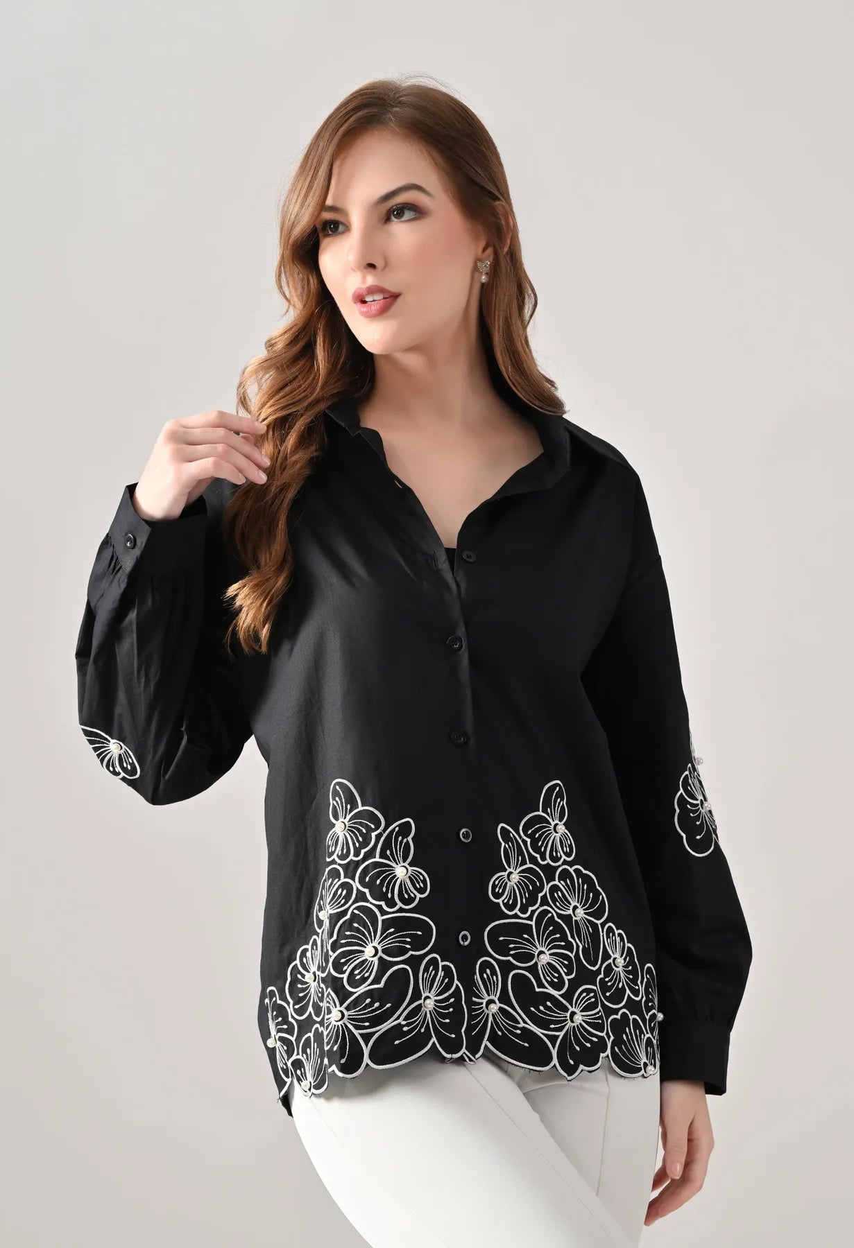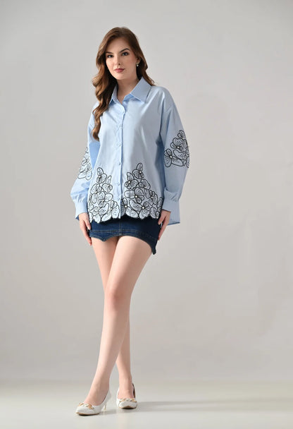 The Blush Bloom Embroidered Shirt brings feminine charm with its soft pink hue and bold floral embroidery along the hem and sleeves. Designed with a classic collar, front button closure, long sleeves with cuffs, and a relaxed silhouette, this shirt blends comfort with elegance. The scalloped edge and subtle pearl accents add a refined finish, making it perfect for day-to-night styling.