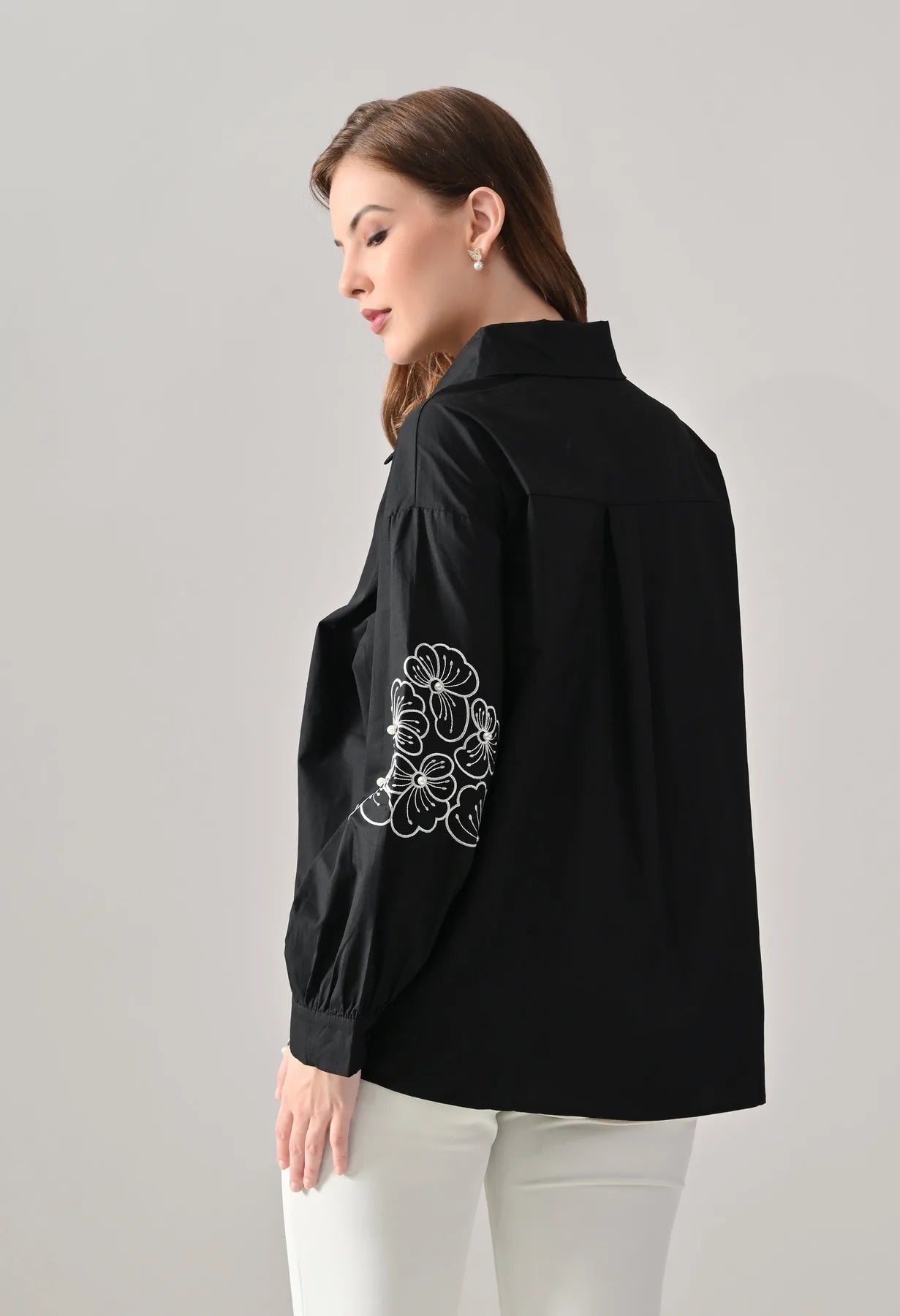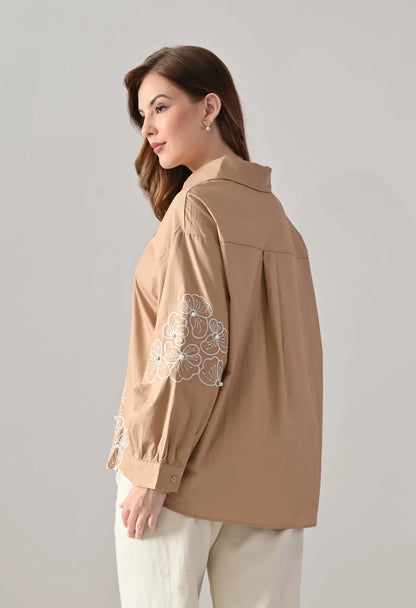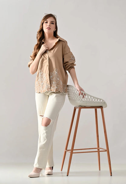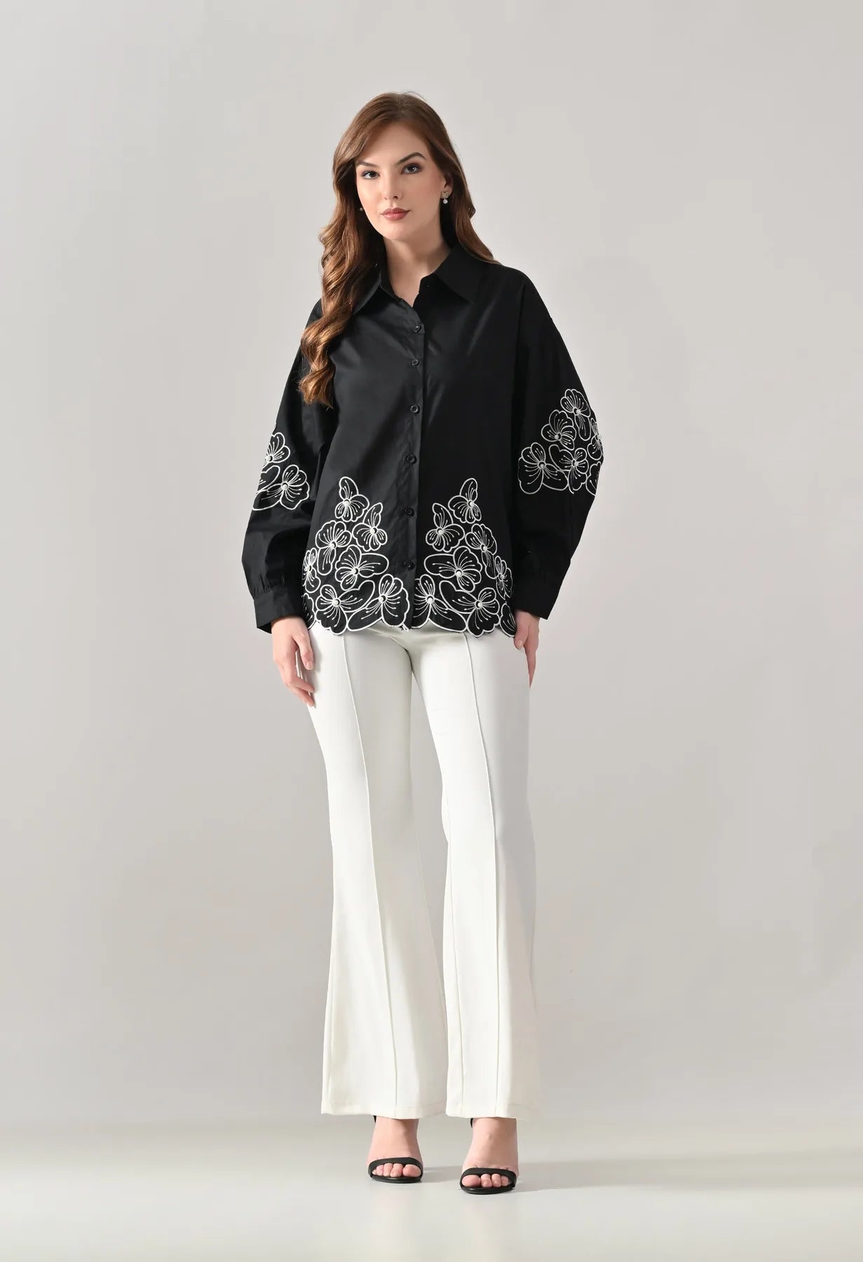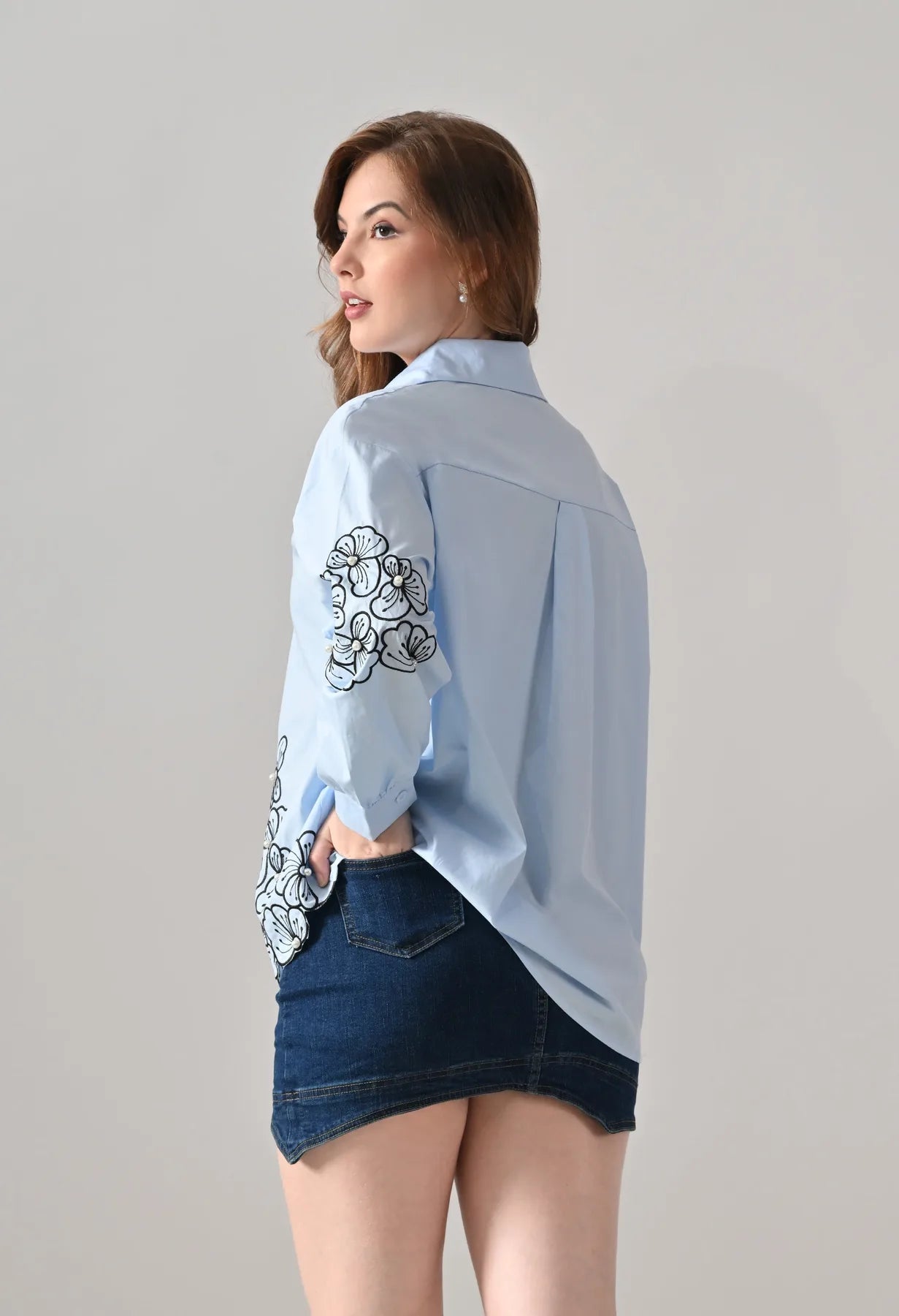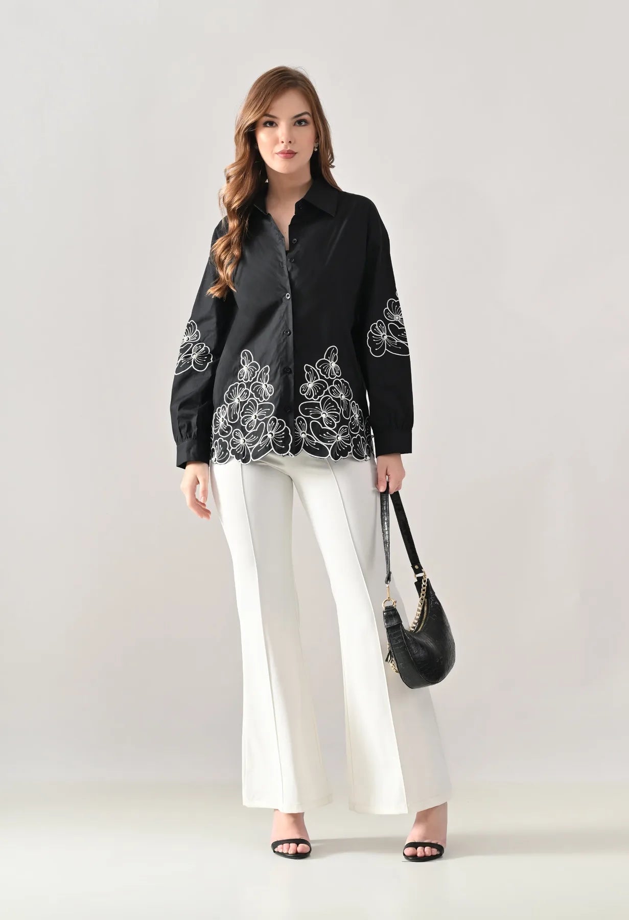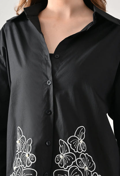 The Blush Bloom Embroidered Shirt brings feminine charm with its soft pink hue and bold floral embroidery along the hem and sleeves. Designed with a classic collar, front button closure, long sleeves with cuffs, and a relaxed silhouette, this shirt blends comfort with elegance. The scalloped edge and subtle pearl accents add a refined finish, making it perfect for day-to-night styling.