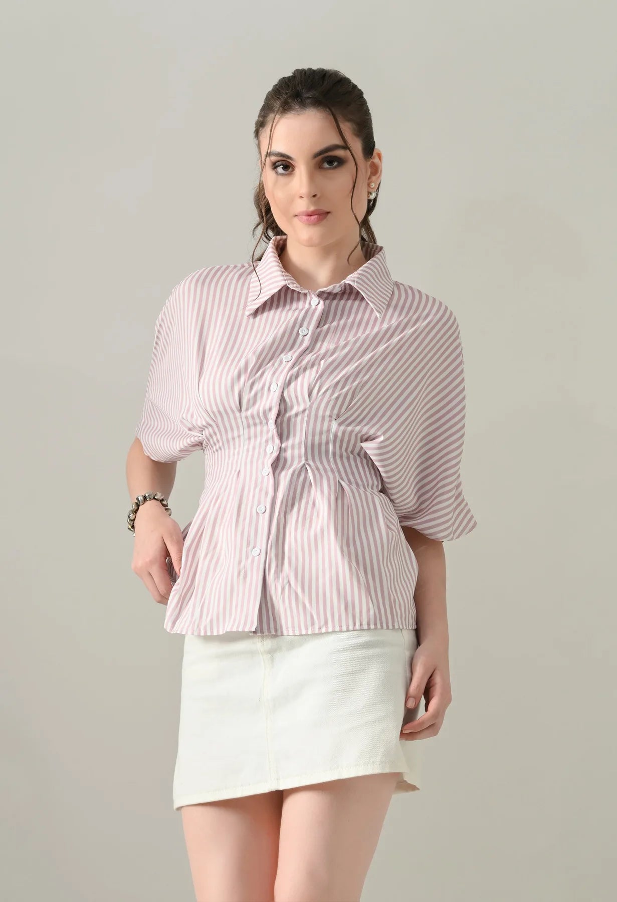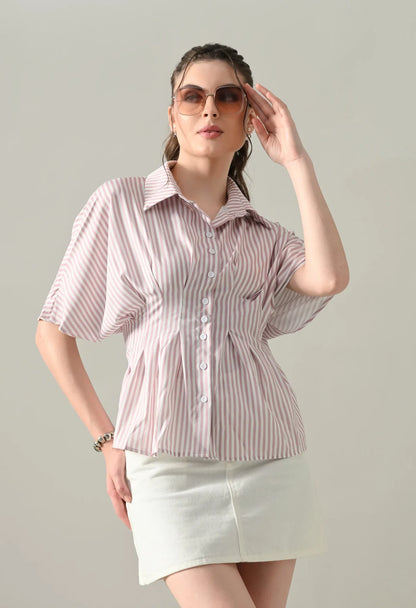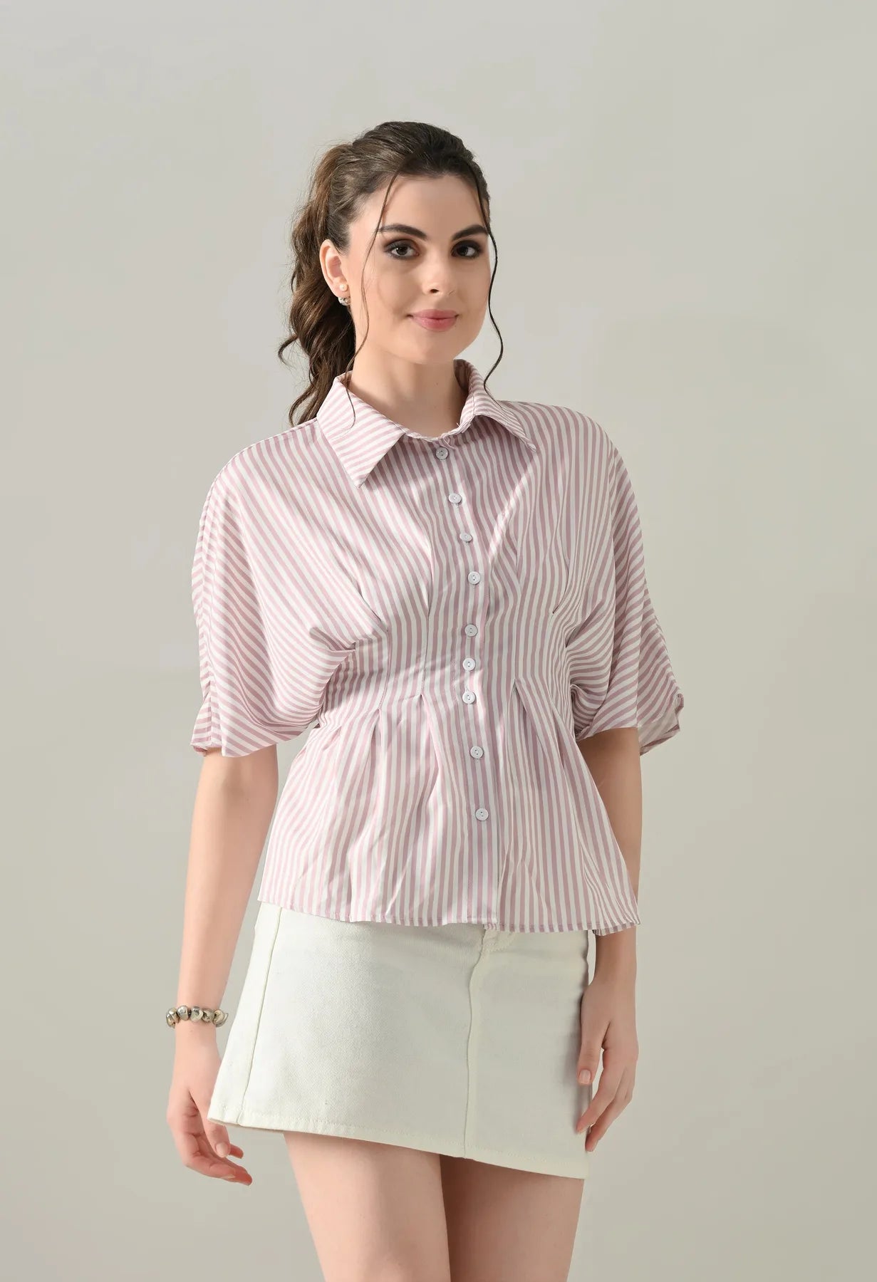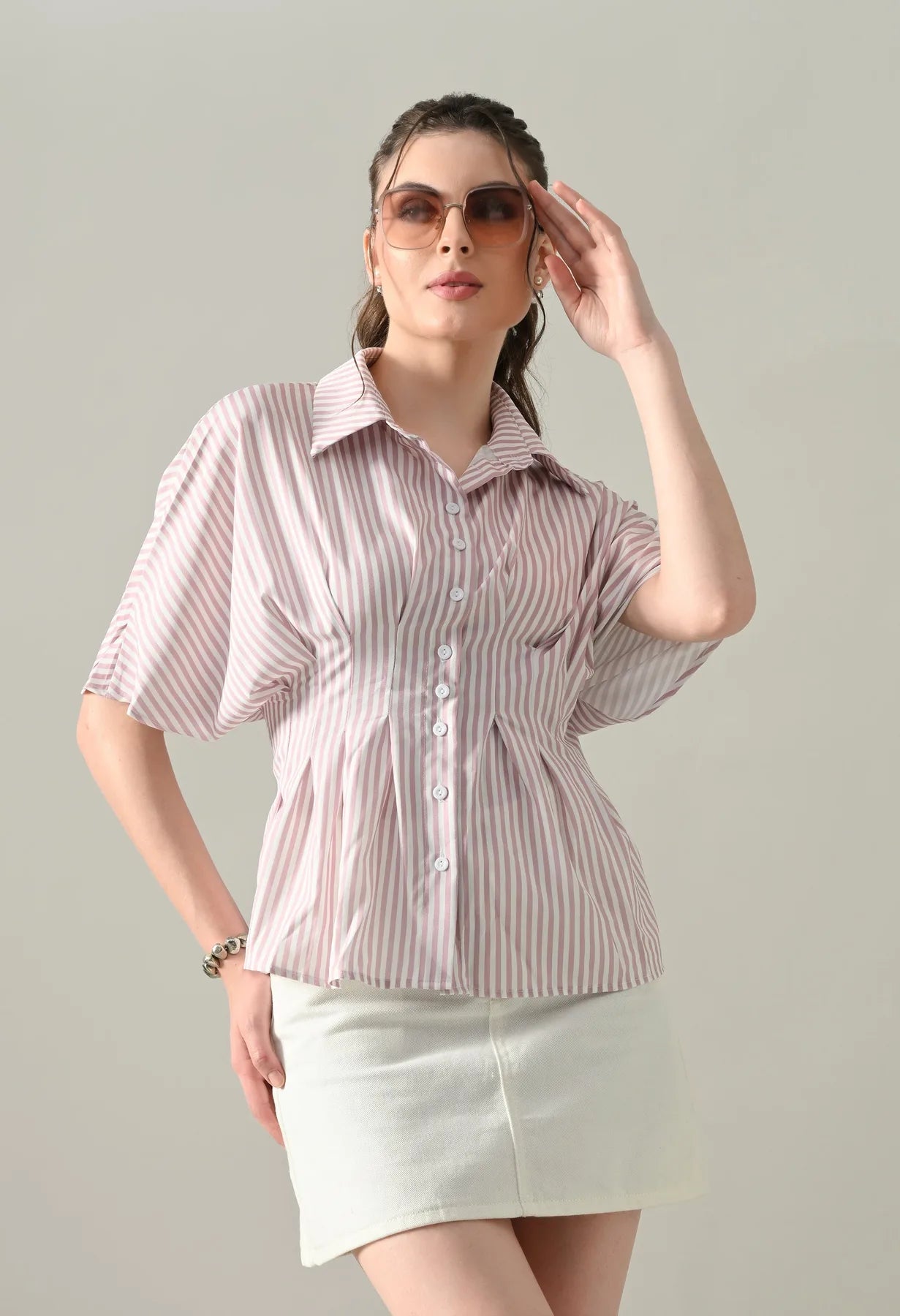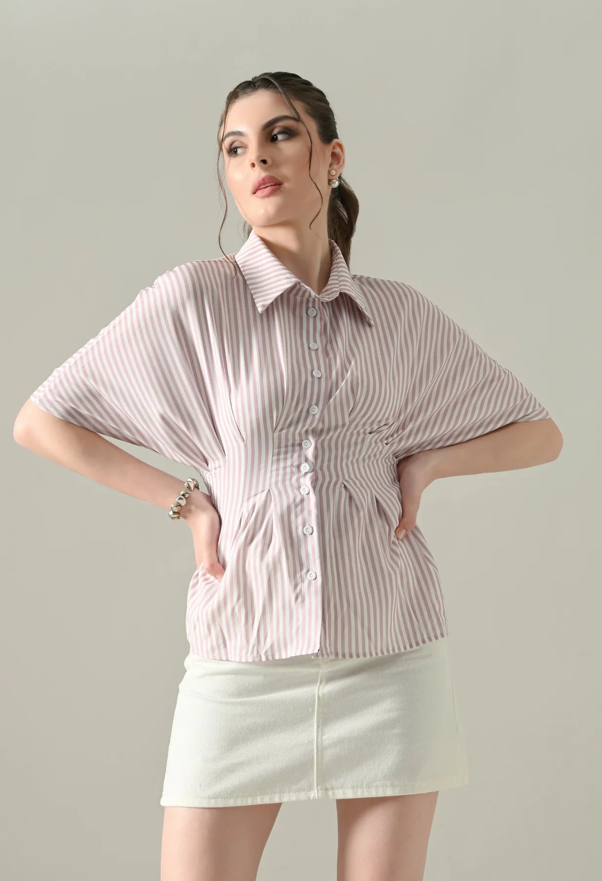 Effortless chic meets flattering structure in the Blush Stripe Cinched Shirt. Designed with soft blush-and-white pinstripes, this piece elevates the classic button-down with a feminine twist. The cinched waist creates a graceful silhouette, while relaxed dolman sleeves bring a touch of ease and modernity. Perfect for work-to-weekend dressing, it’s your go-to when you want polish with comfort.