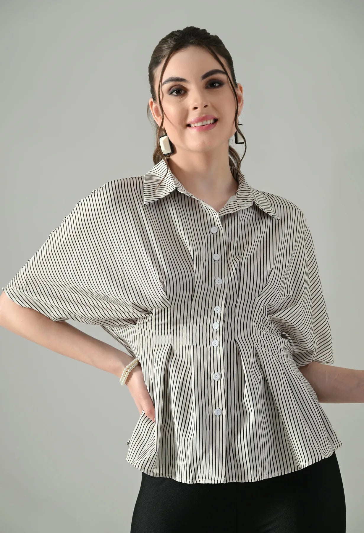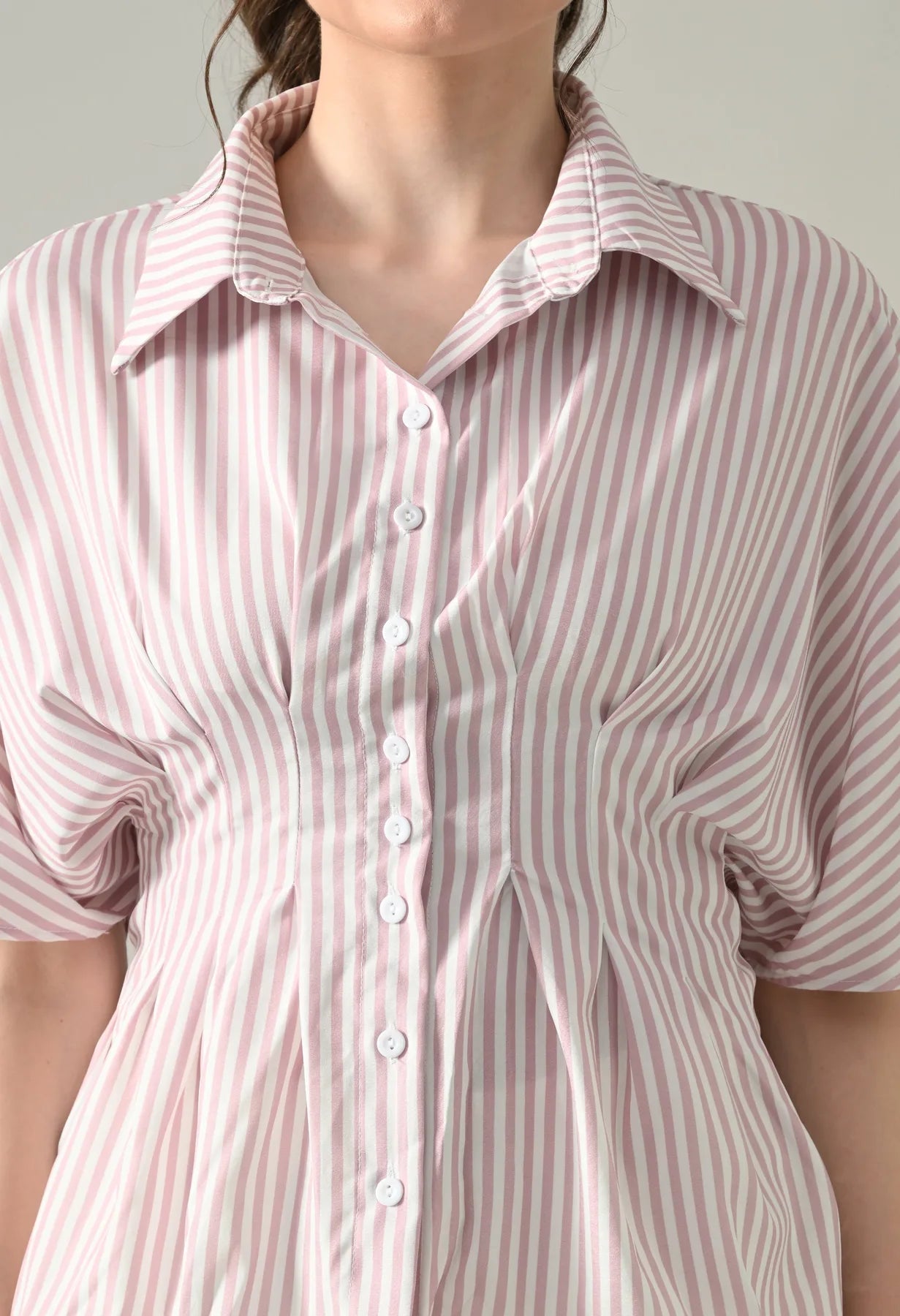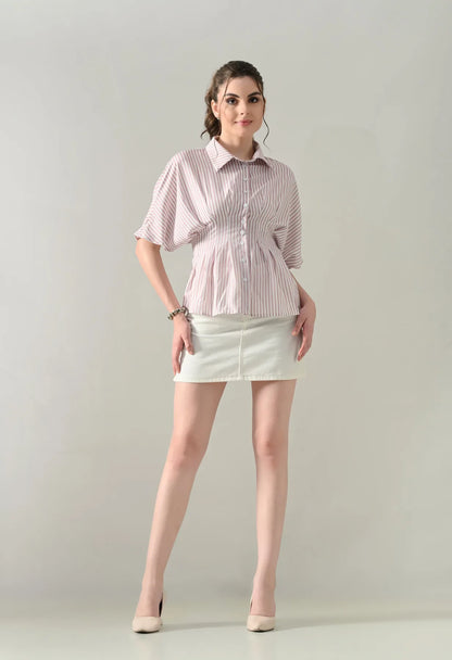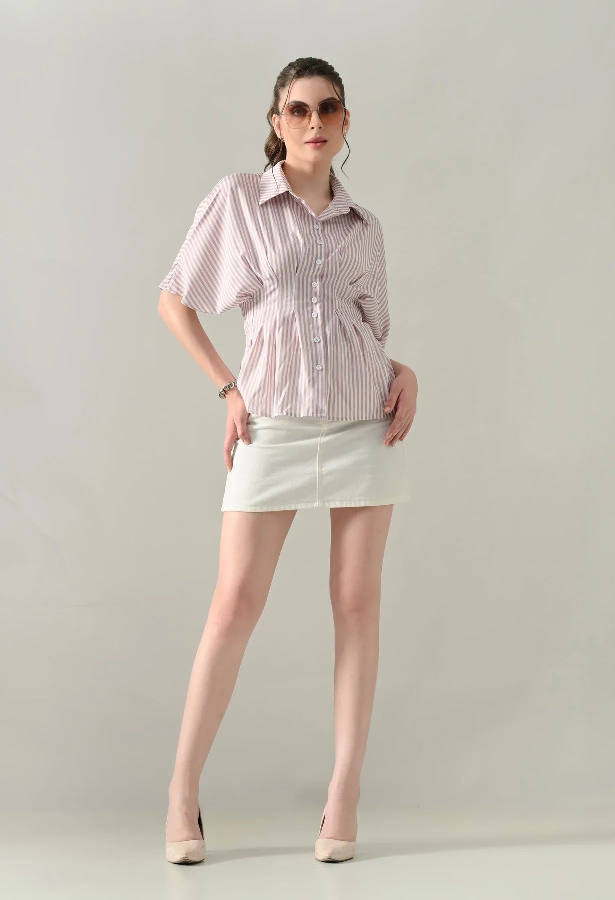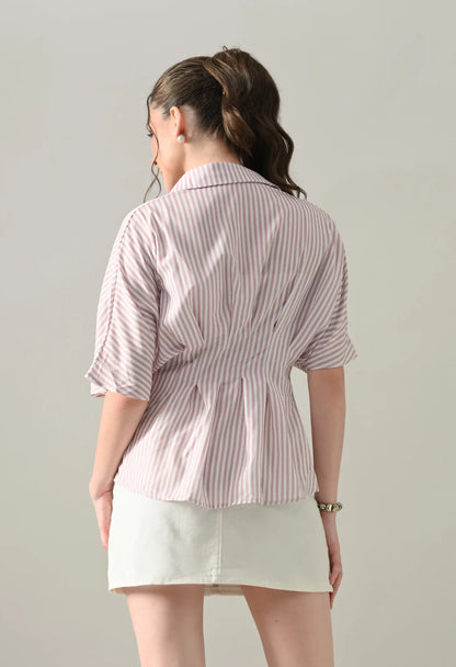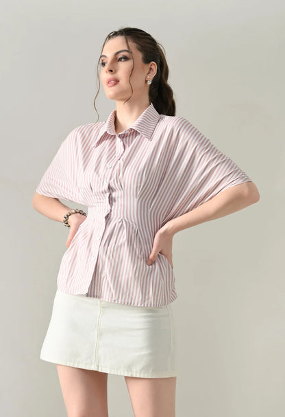 Effortless chic meets flattering structure in the Blush Stripe Cinched Shirt. Designed with soft blush-and-white pinstripes, this piece elevates the classic button-down with a feminine twist. The cinched waist creates a graceful silhouette, while relaxed dolman sleeves bring a touch of ease and modernity. Perfect for work-to-weekend dressing, it’s your go-to when you want polish with comfort.