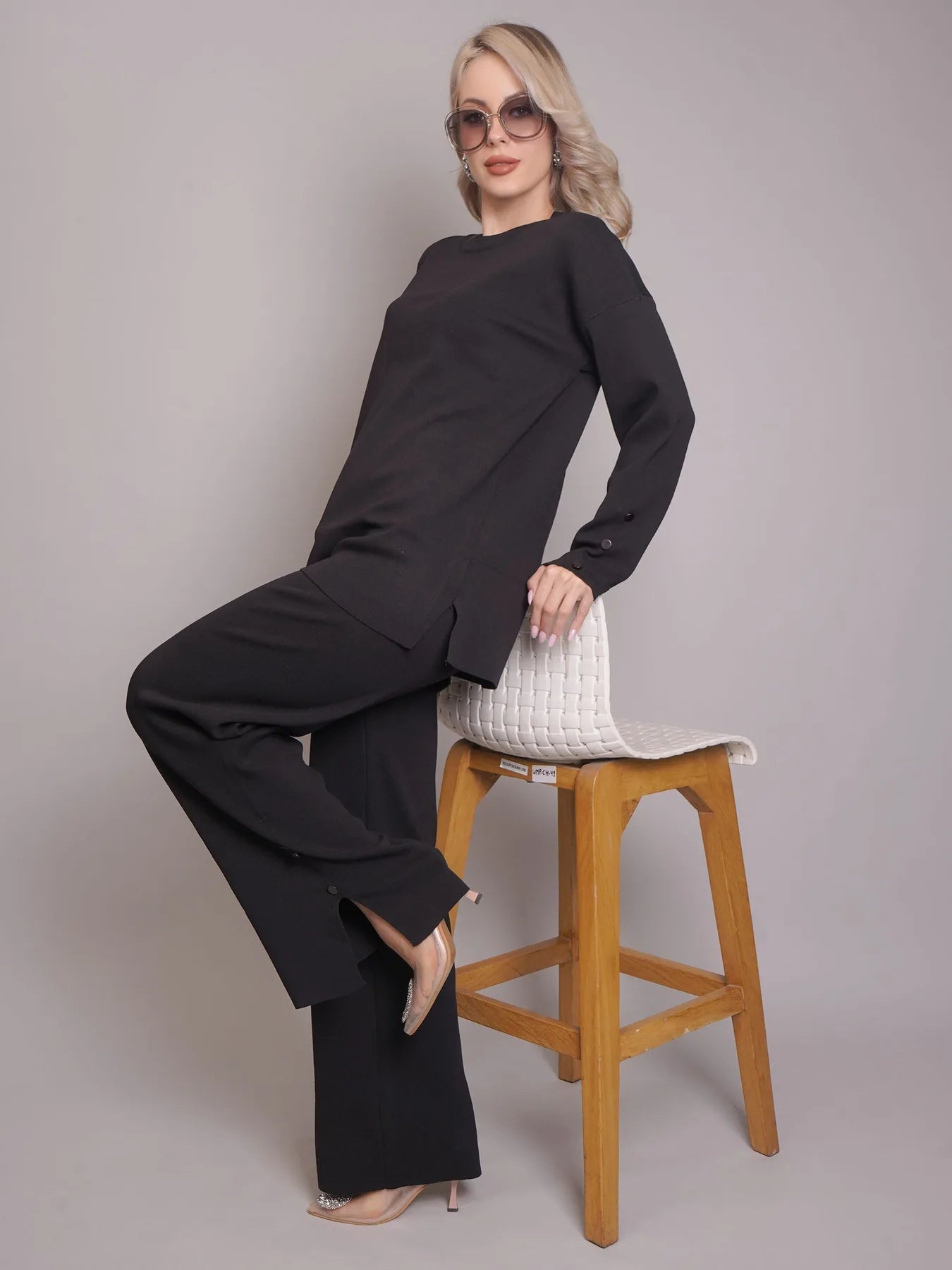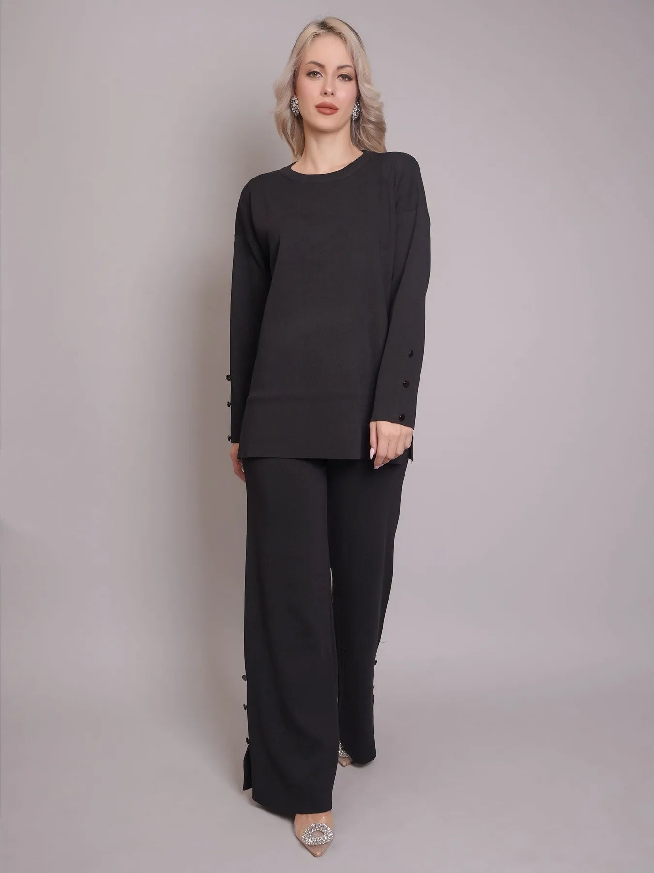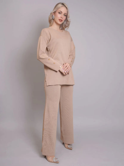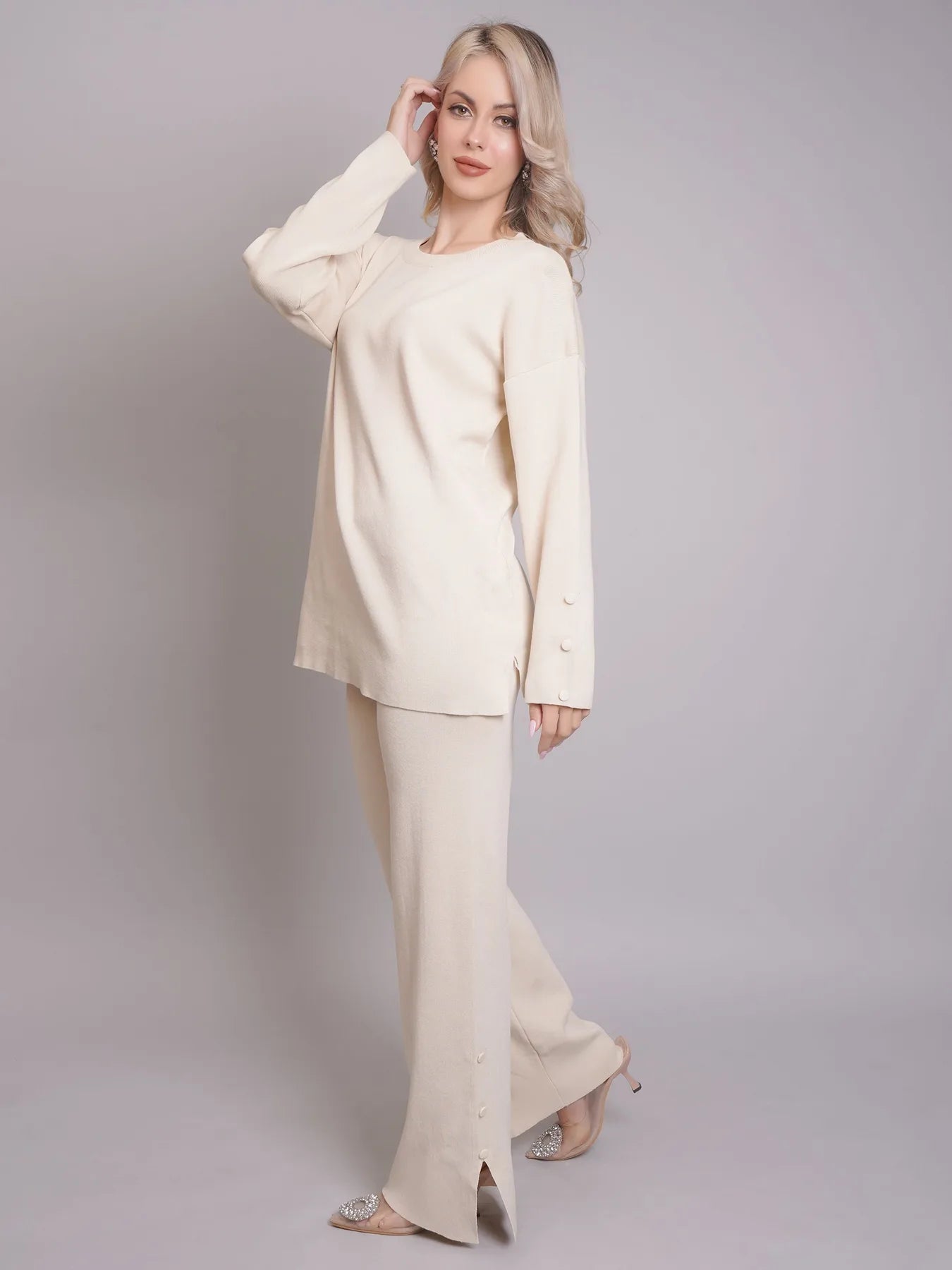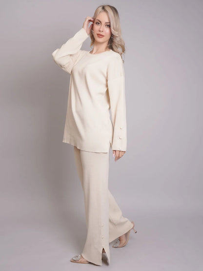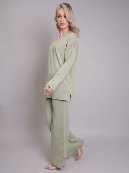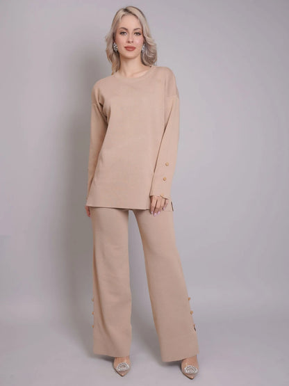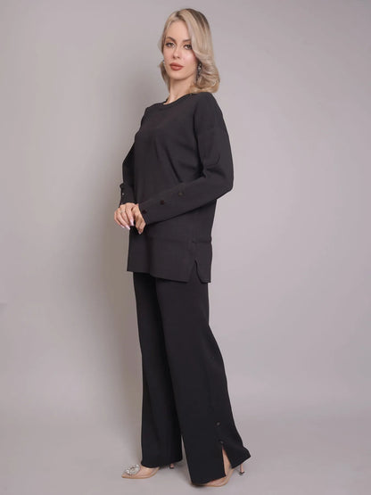 This Buttoned Two-Piece Set combines modern luxury with chic autumn and winter vibes, featuring a round neckline, full sleeves with button detailing, and a stylish side slit on the pants. Crafted from soft, stretchable fabric, it’s ideal for any occasion—from lounging to evening wear.