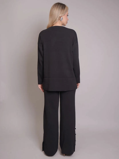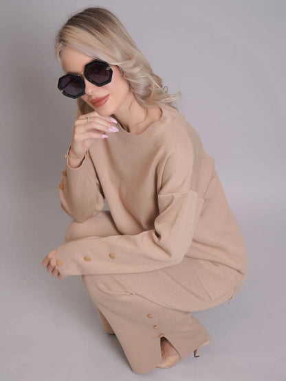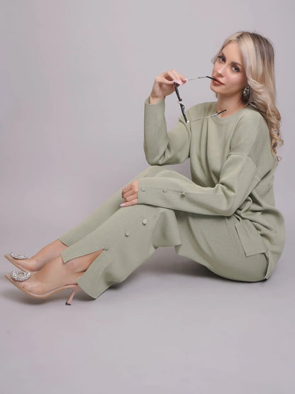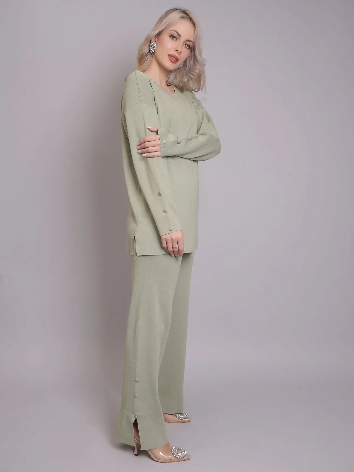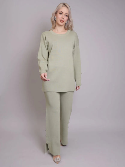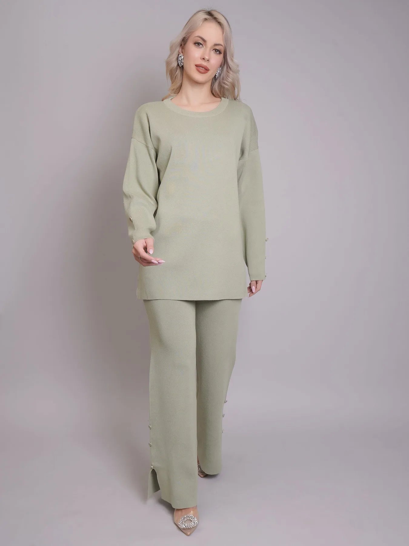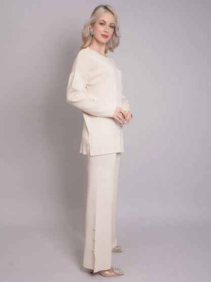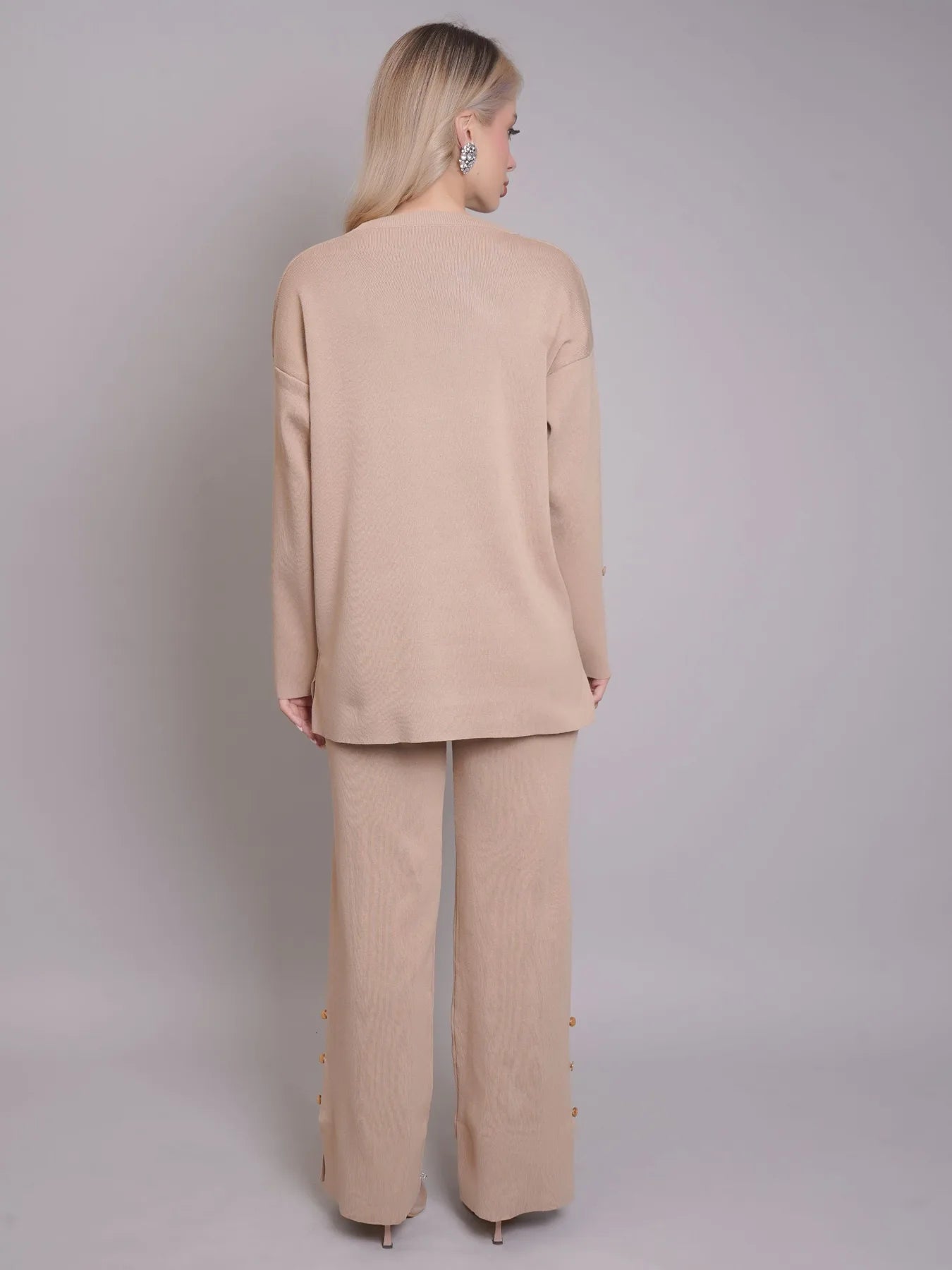 This Buttoned Two-Piece Set combines modern luxury with chic autumn and winter vibes, featuring a round neckline, full sleeves with button detailing, and a stylish side slit on the pants. Crafted from soft, stretchable fabric, it’s ideal for any occasion—from lounging to evening wear.