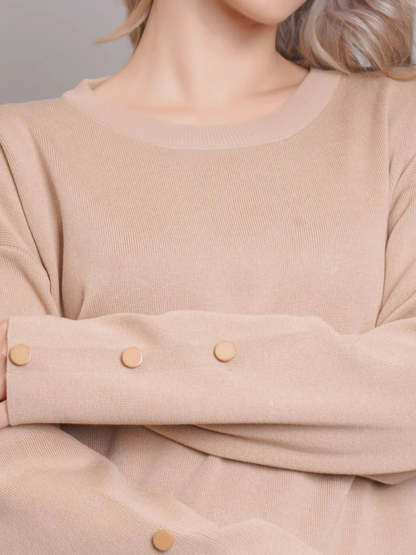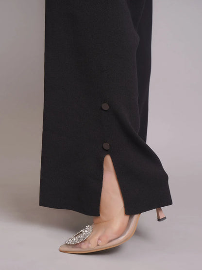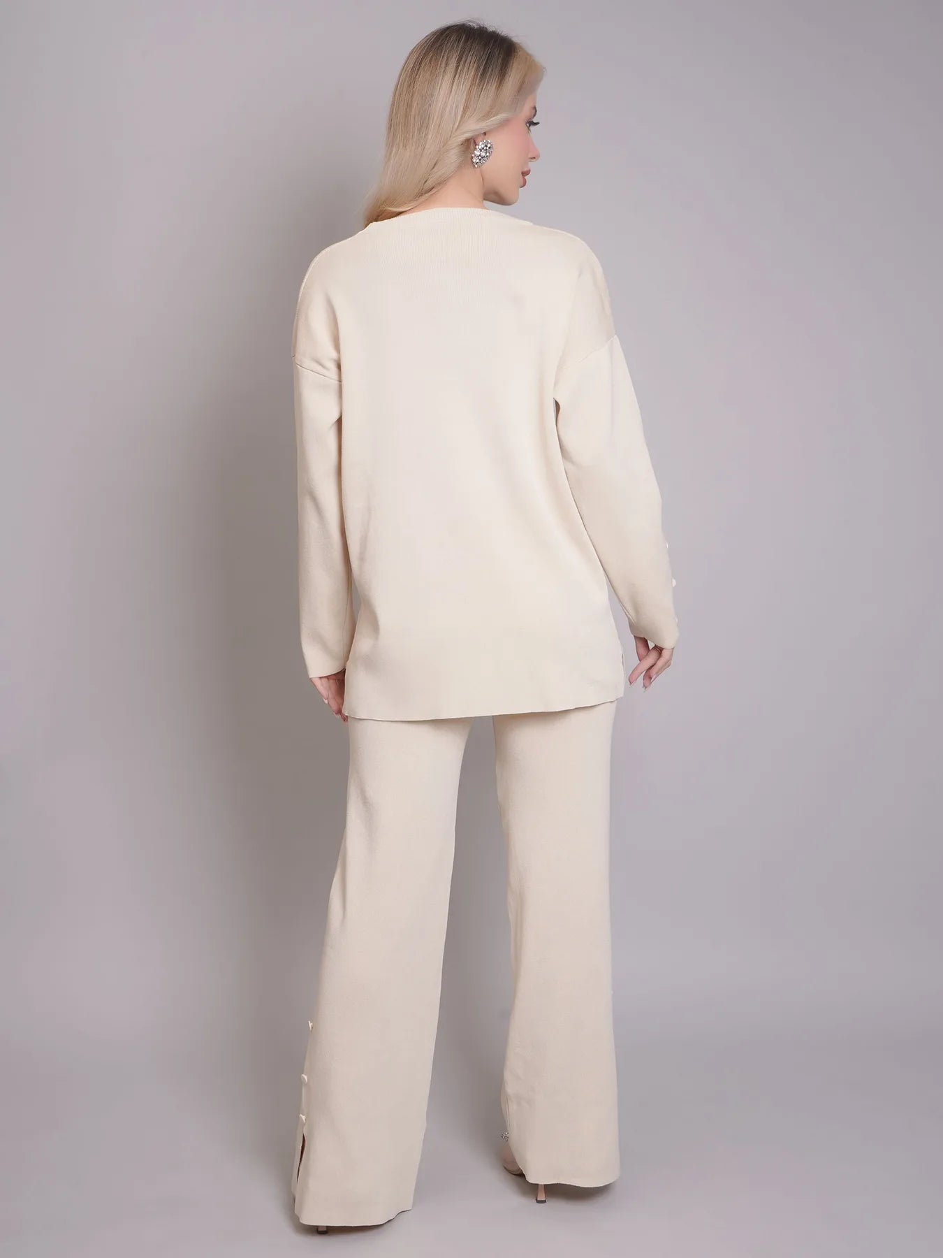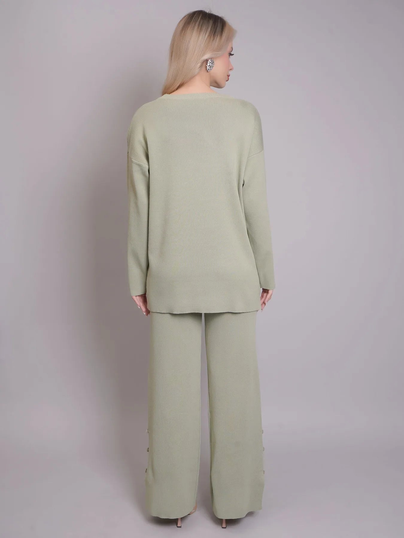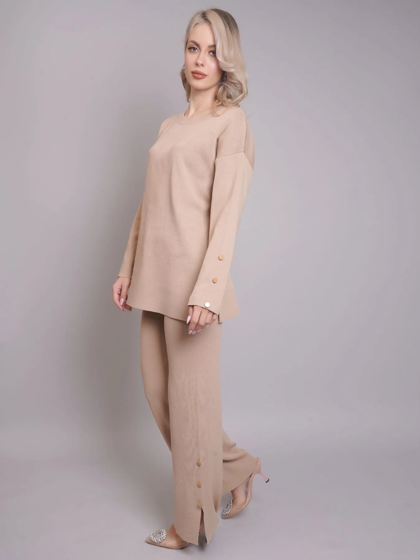 This Buttoned Two-Piece Set combines modern luxury with chic autumn and winter vibes, featuring a round neckline, full sleeves with button detailing, and a stylish side slit on the pants. Crafted from soft, stretchable fabric, it’s ideal for any occasion—from lounging to evening wear.
