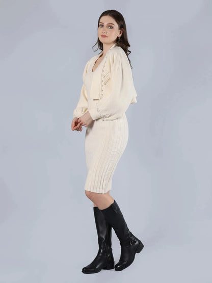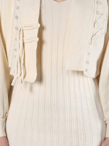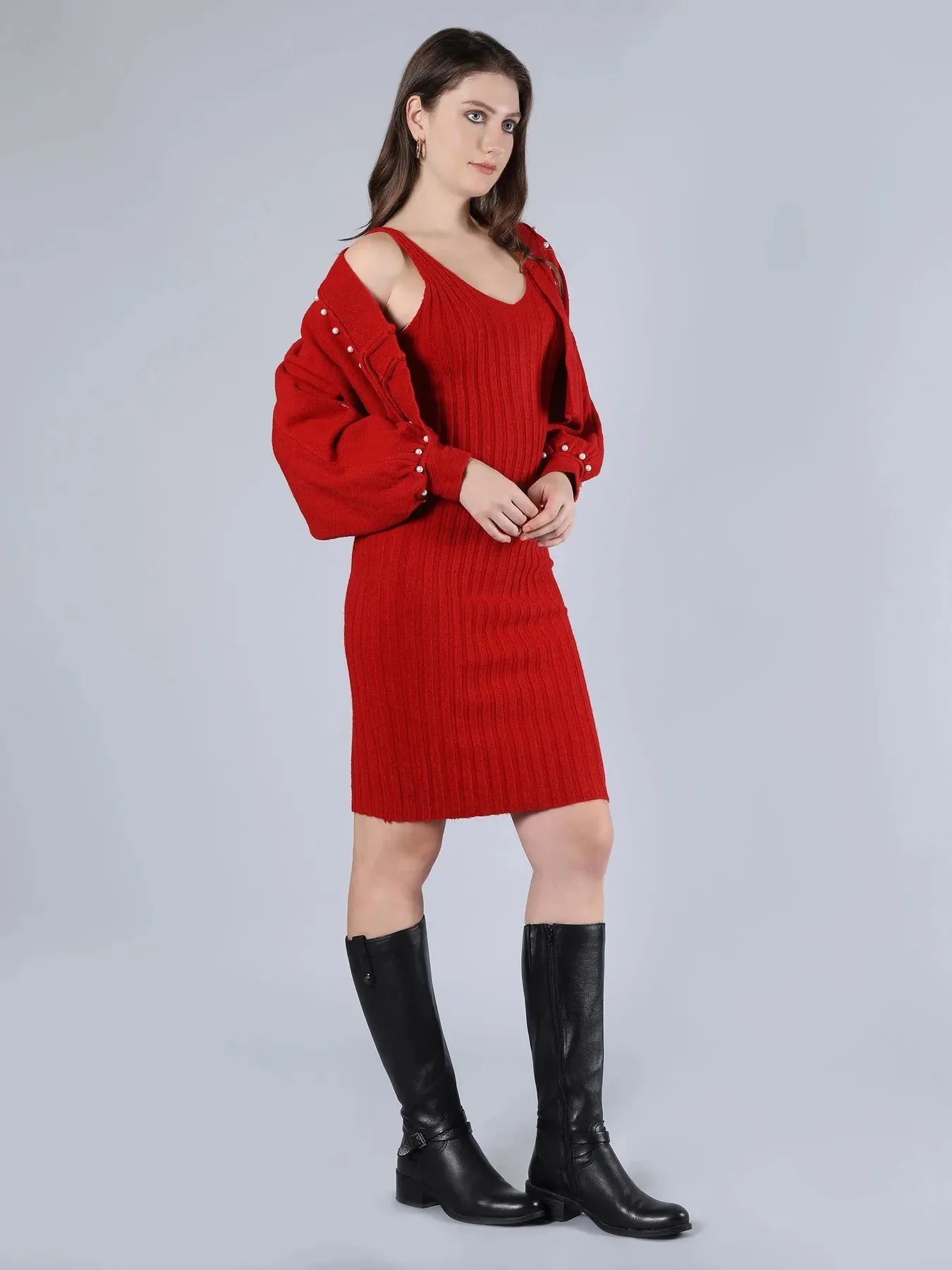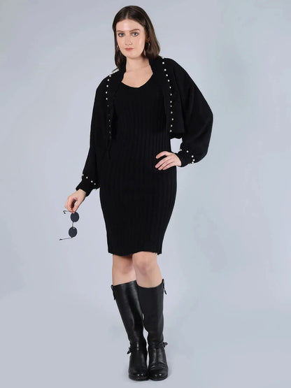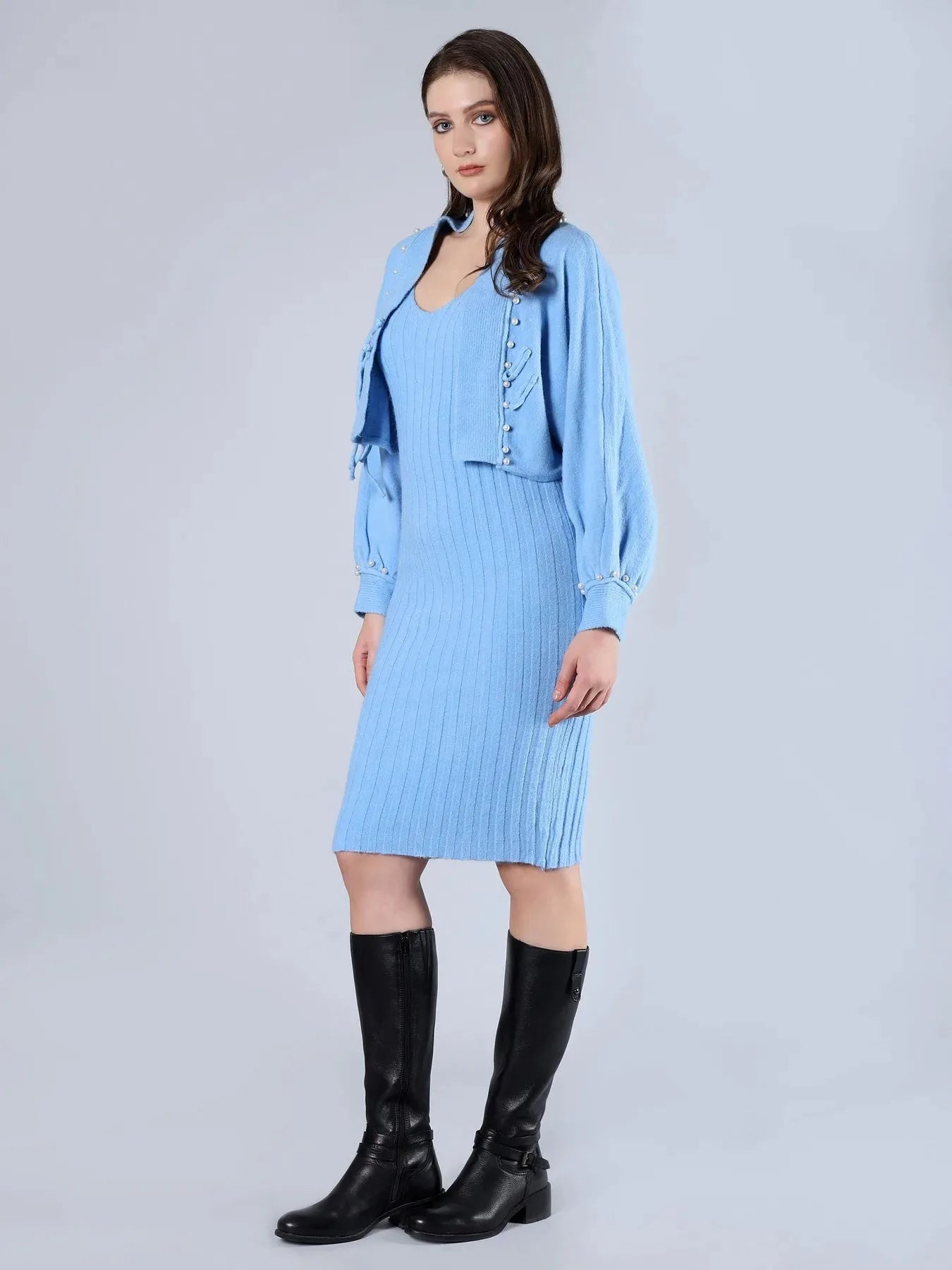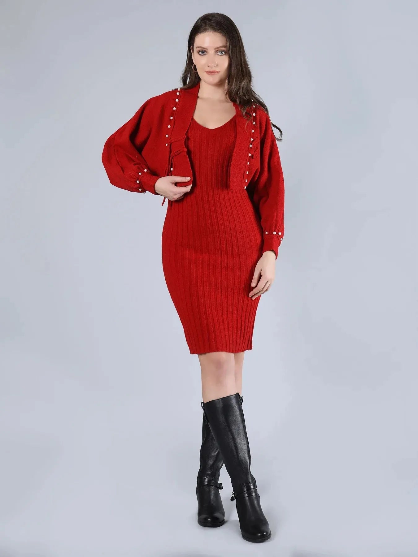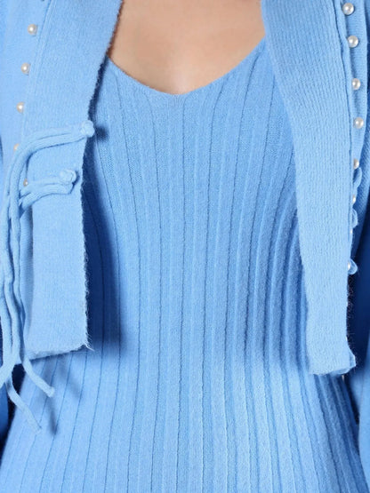 The Knitted Two-Piece Dress Set features a bodycon rib-knit midi dress with a front and back V-neckline, complemented by a sleeveless design and a loose crop cardigan. Made from stretchable fabric, it’s the perfect blend of chic, trendy, and sexy for autumn, winter, or holiday outings.