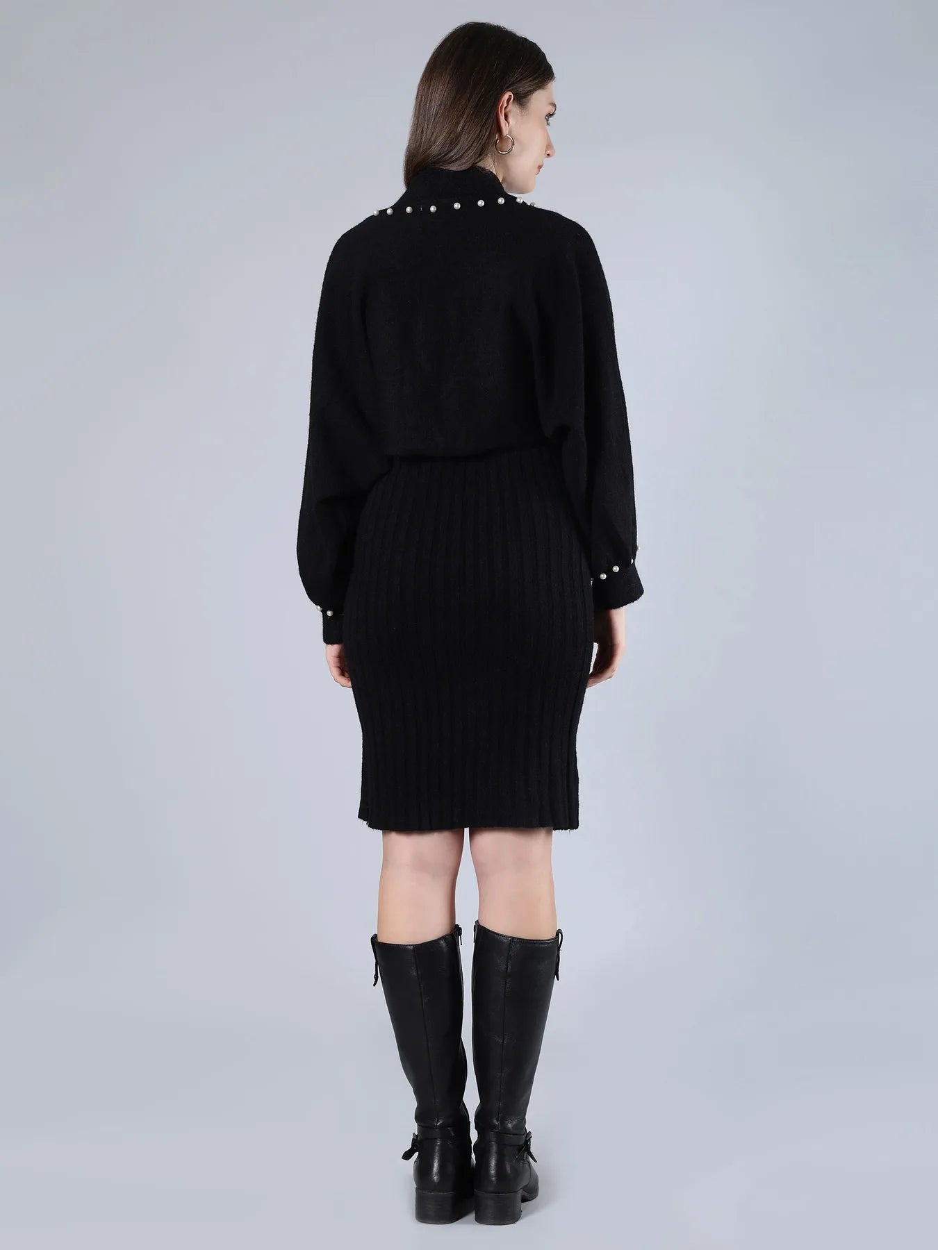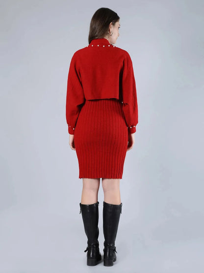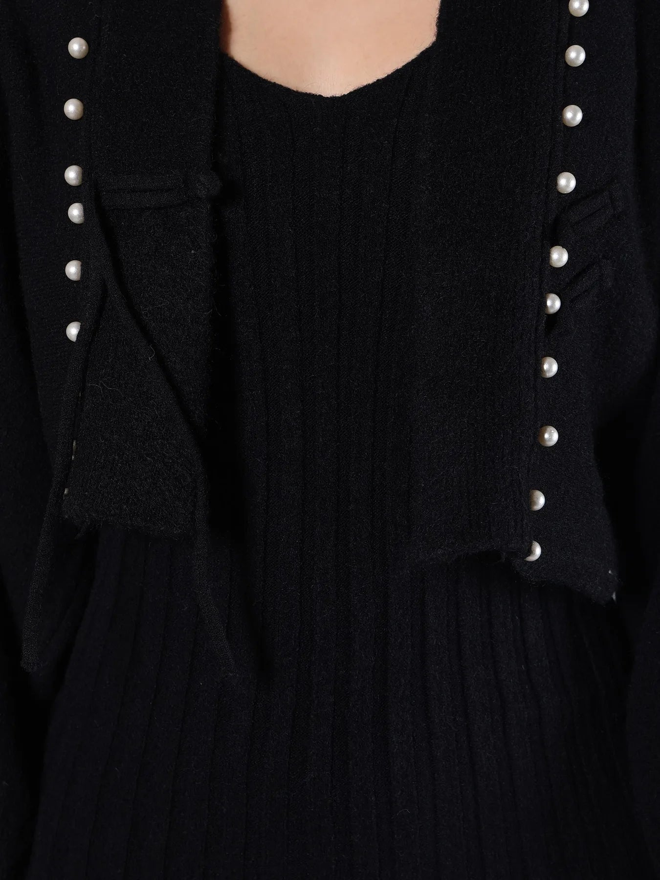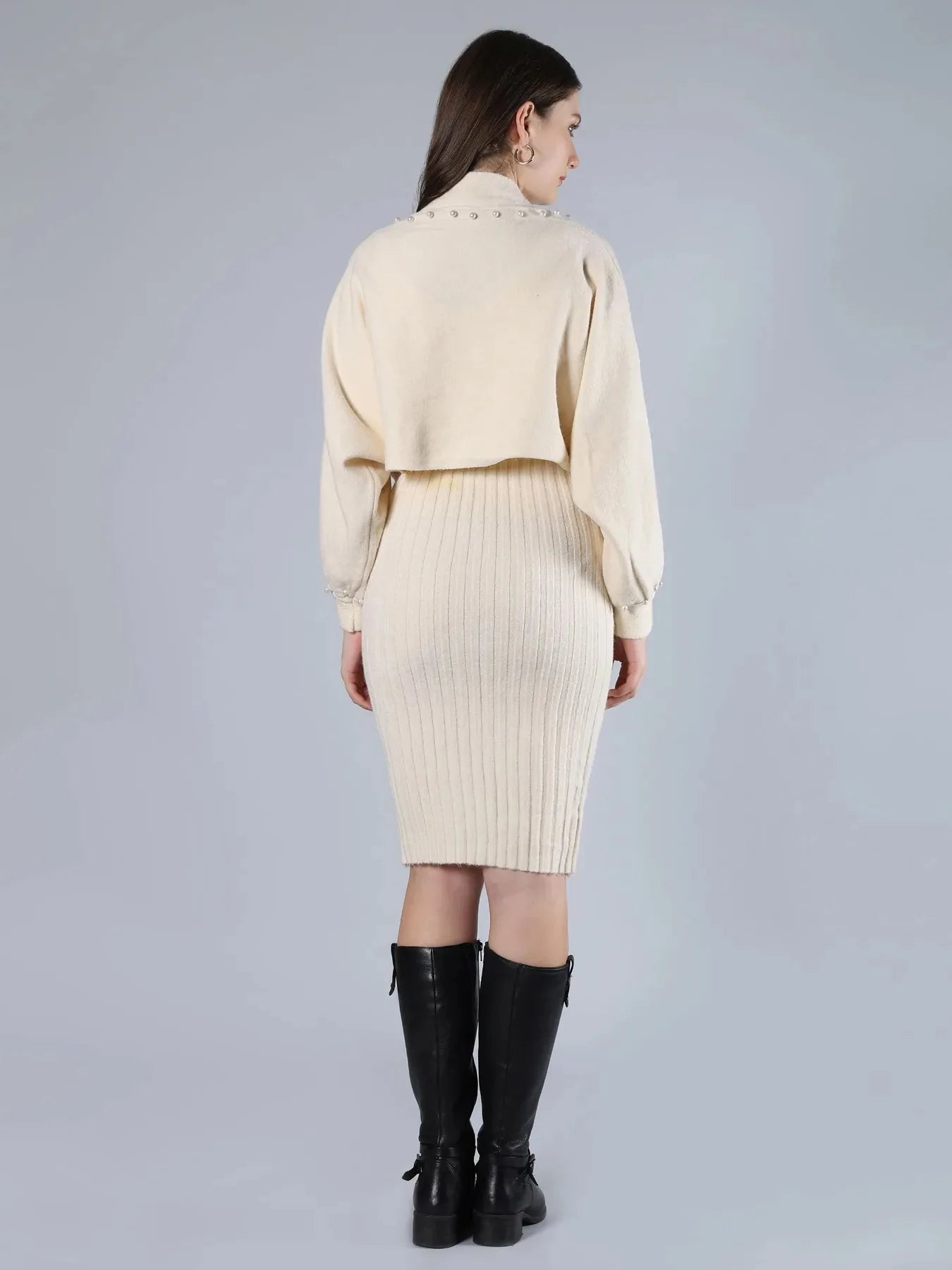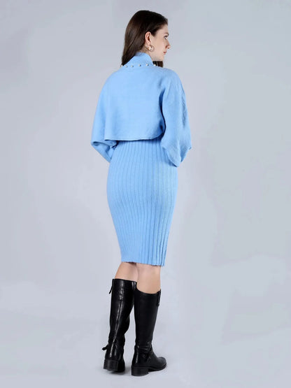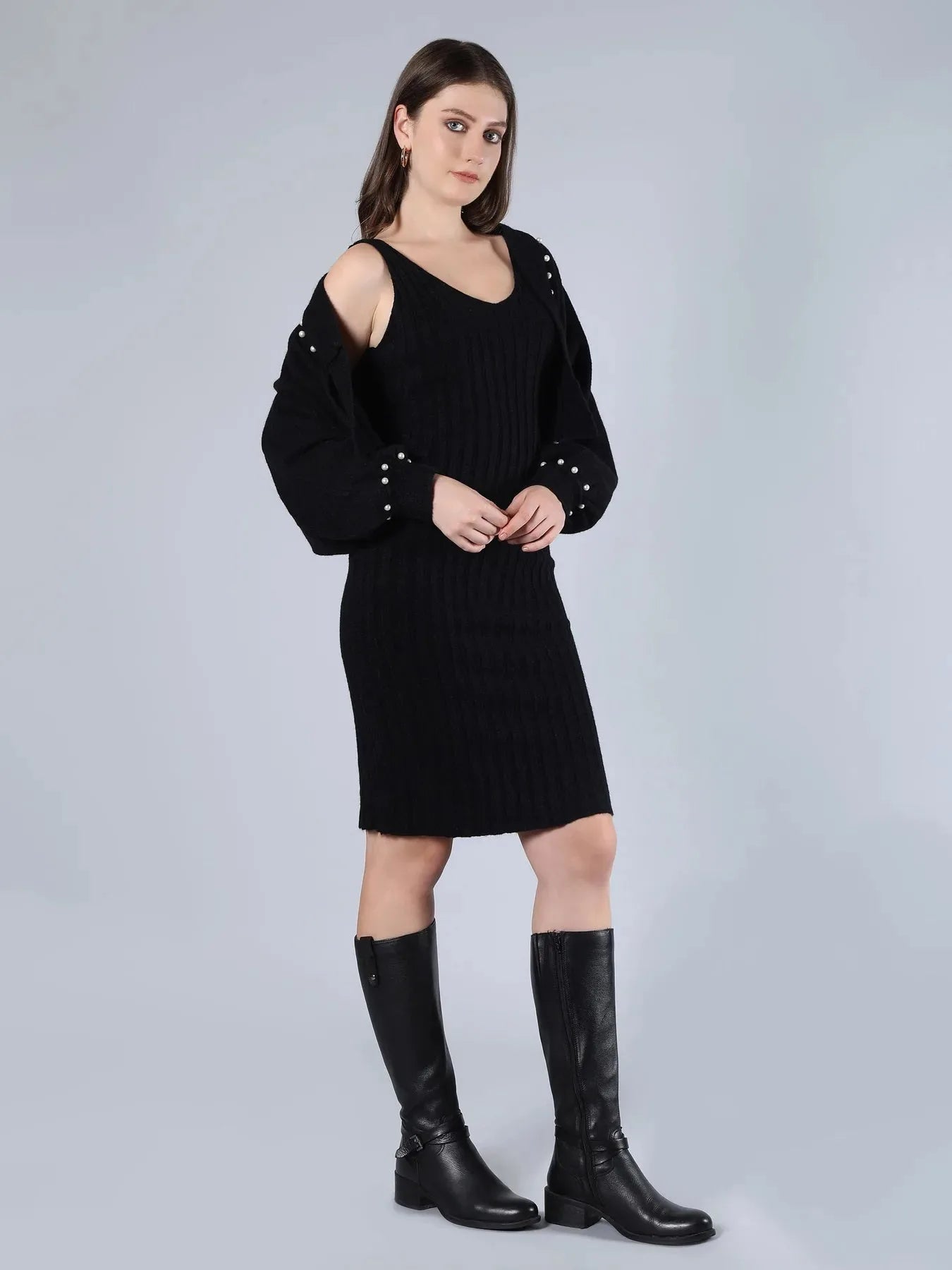 The Knitted Two-Piece Dress Set features a bodycon rib-knit midi dress with a front and back V-neckline, complemented by a sleeveless design and a loose crop cardigan. Made from stretchable fabric, it’s the perfect blend of chic, trendy, and sexy for autumn, winter, or holiday outings.