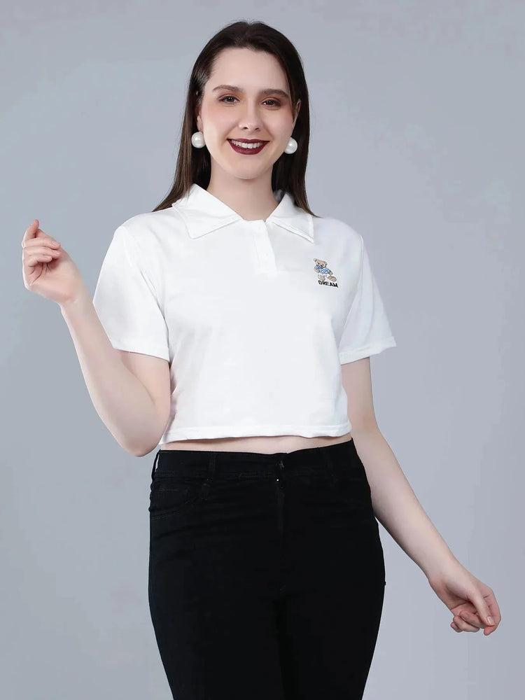 Bear Embroidered Cropped Polo Tee