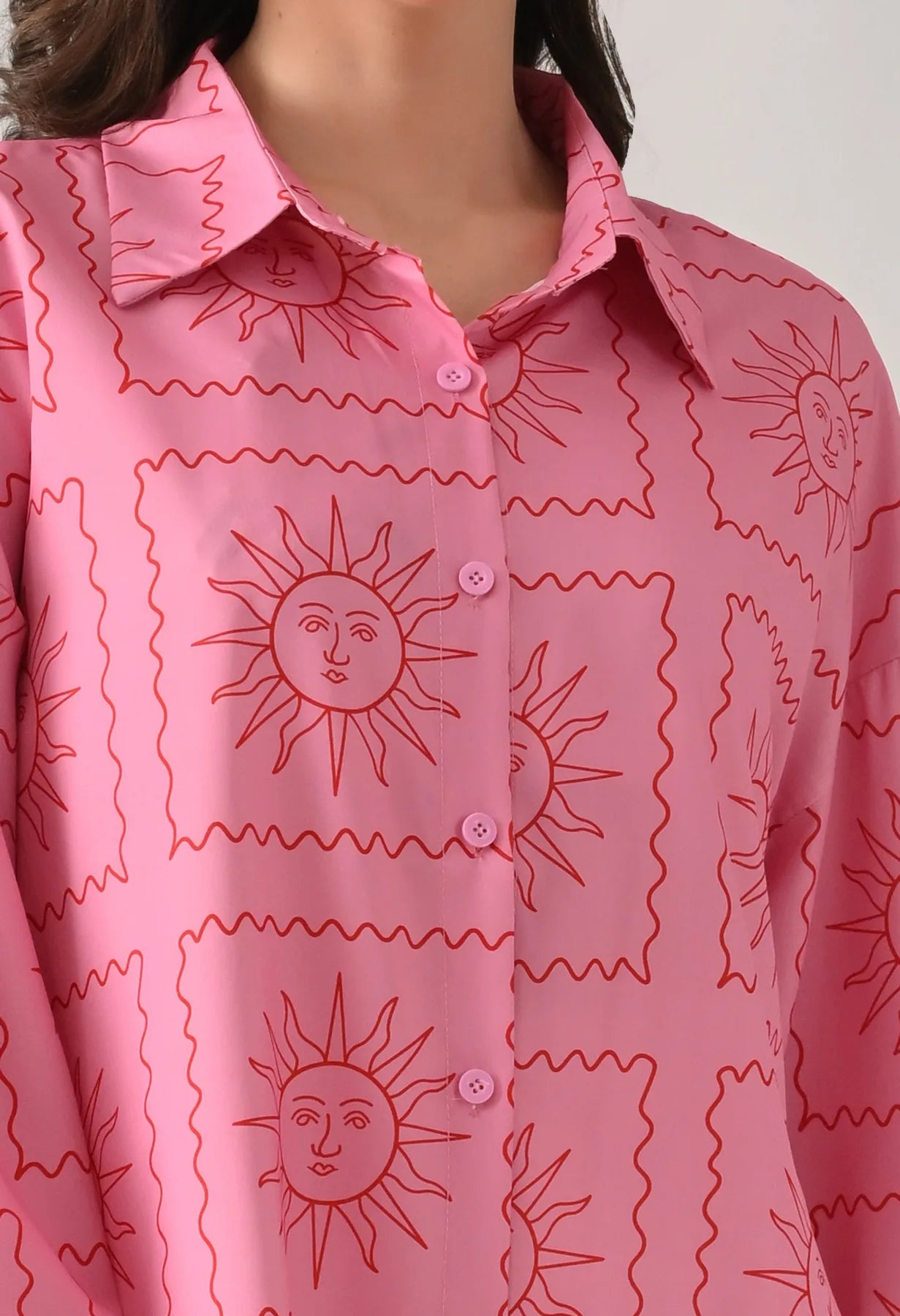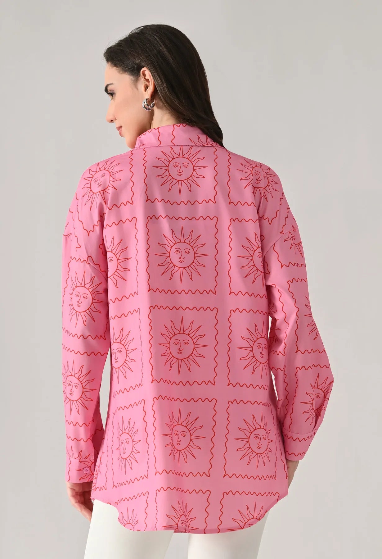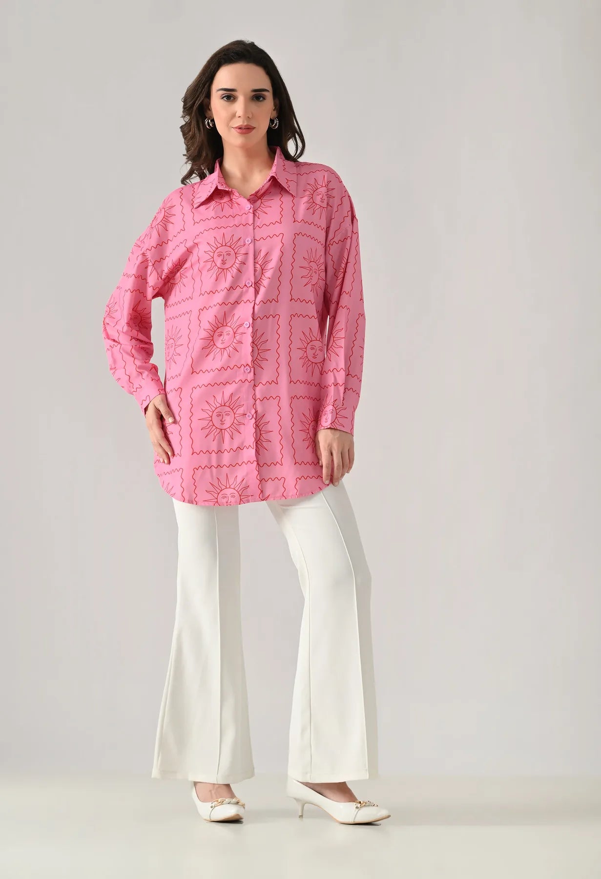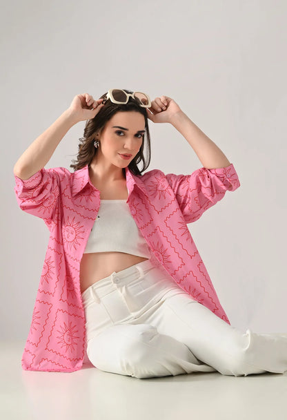 Easy, breezy, and bold—this oversized cotton tunic comes in a pink base with striking red sun-inspired prints. Featuring a collared neckline, button-up front, and scooped hemline that’s shorter on the sides, it blends comfort with statement style. The fabric and relaxed fit make it perfect for both layering and lounging.