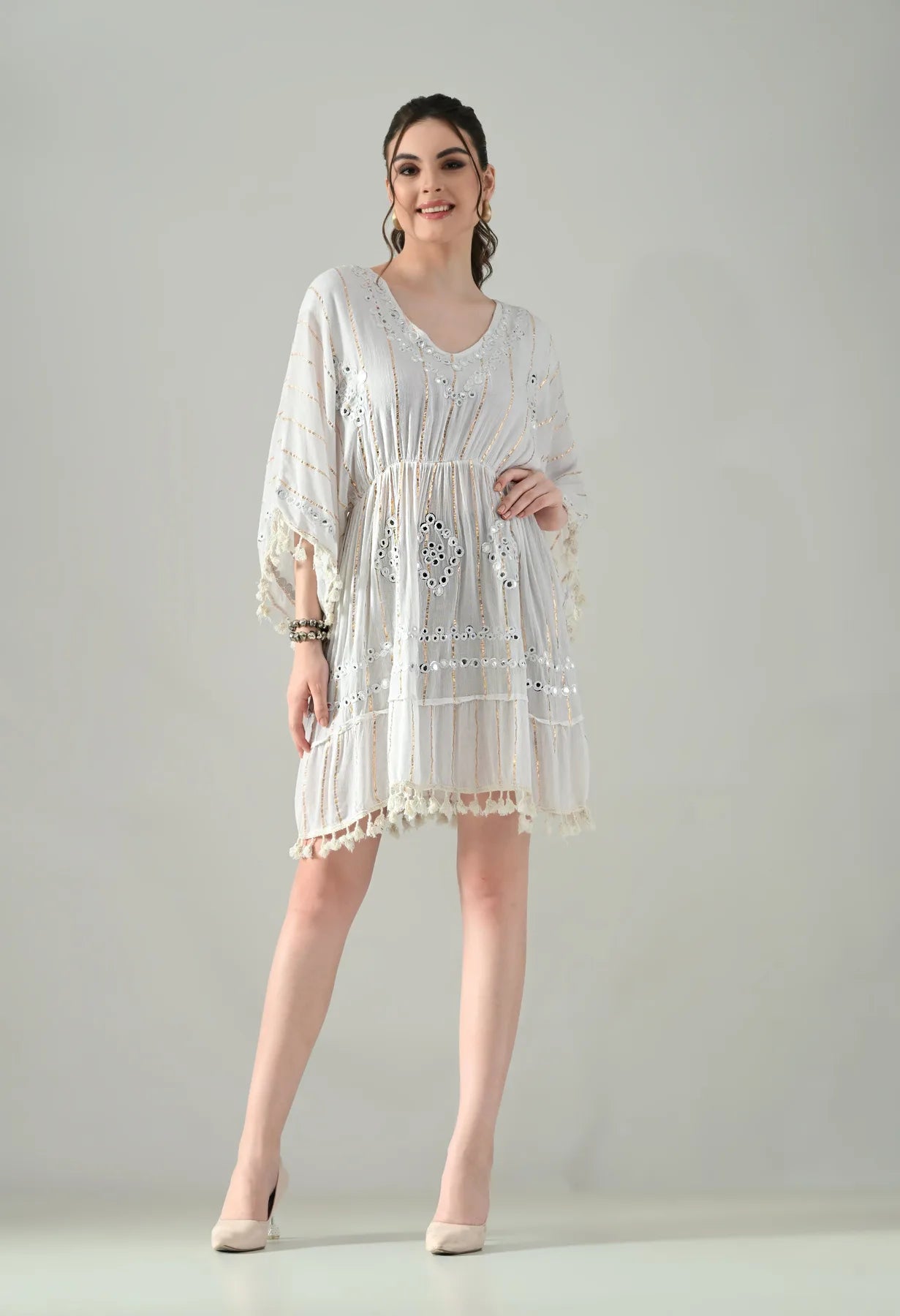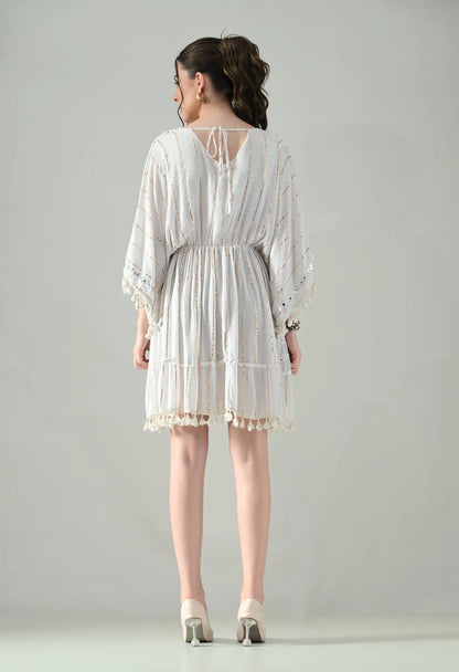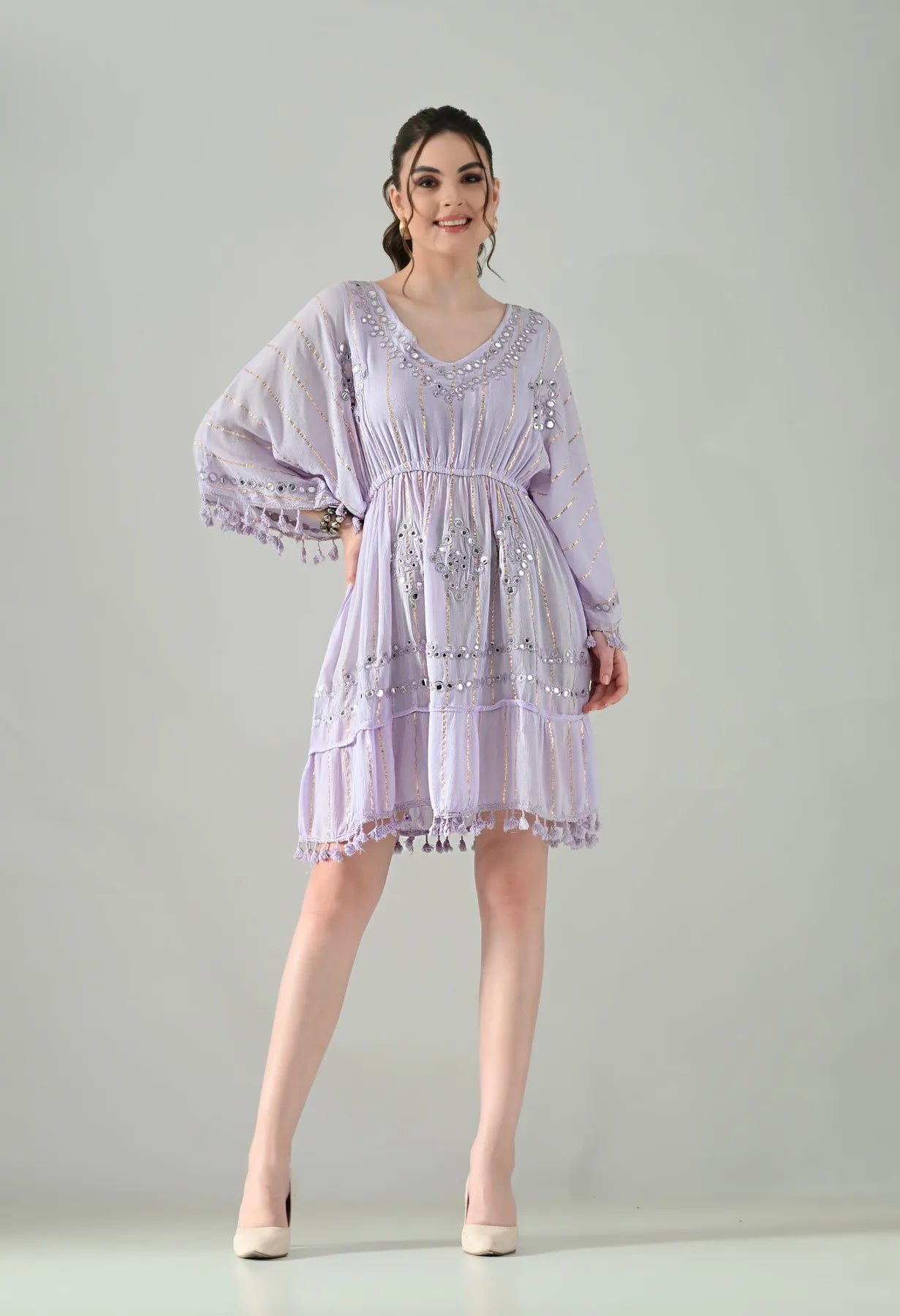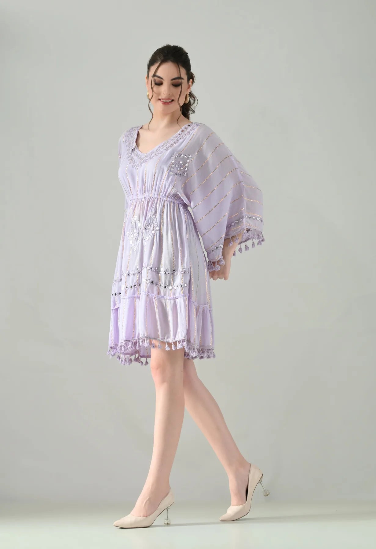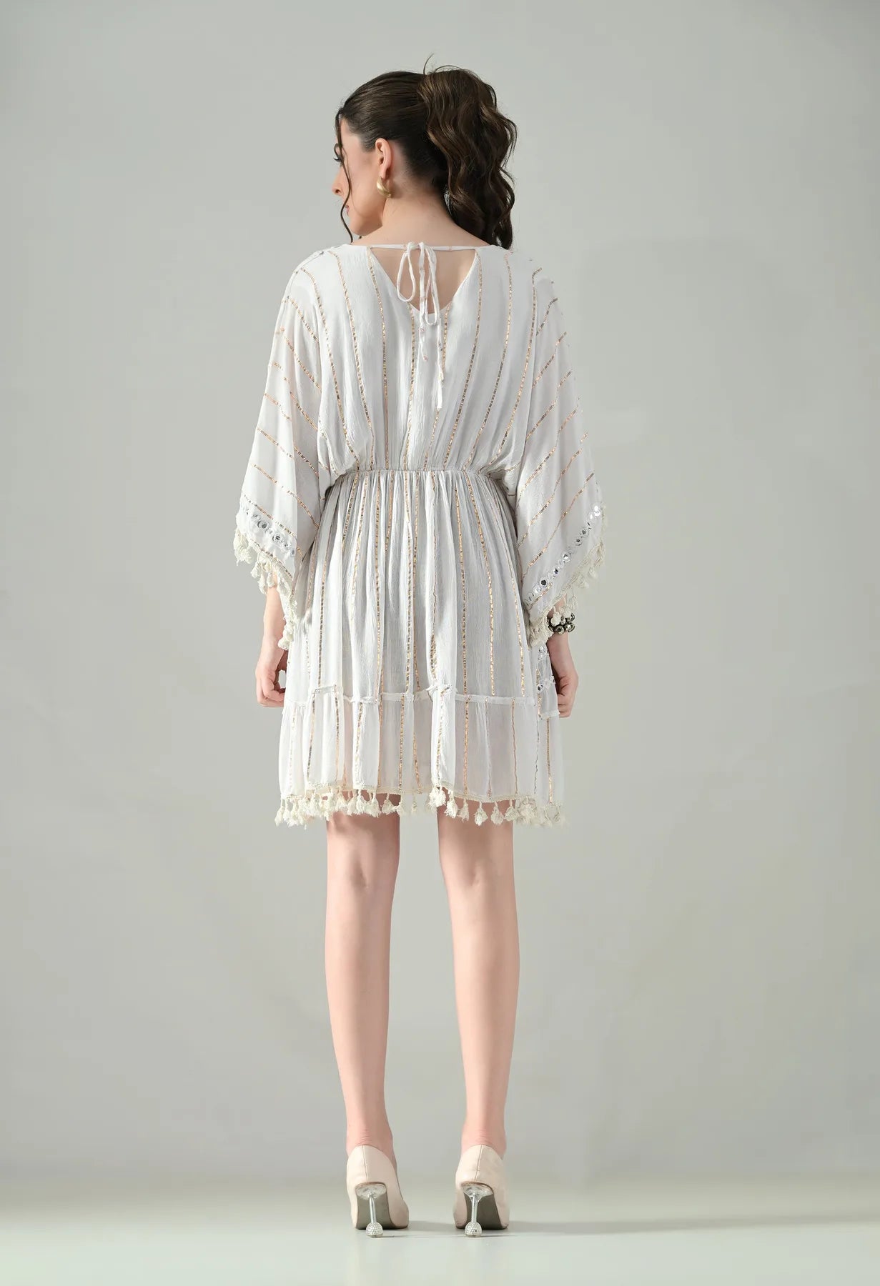 Step into effortless boho charm with this breezy short flared dress, crafted to shine with its intricate all-over mirror embroidery. Designed with a flattering V-neckline and adjustable back tie, it ensures a comfortable, personalized fit. The elasticated gathered waist adds definition, while the soft rayon gauze lining on the upper body ensures all-day ease. Featuring cut-and-sew panels for added movement, 3/4 kimono sleeves, and tassel lace detailing on the hem and cuffs, this dress blends festive sparkle with relaxed elegance. Perfect for day-to-night occasions where comfort meets glow.