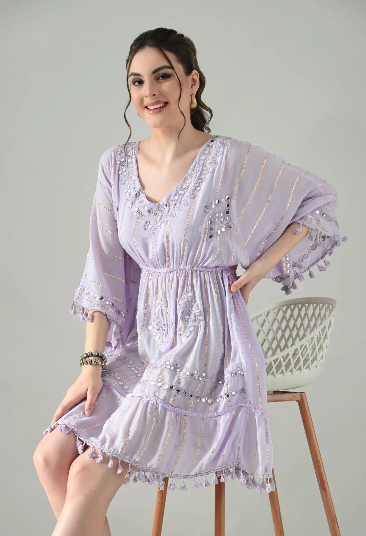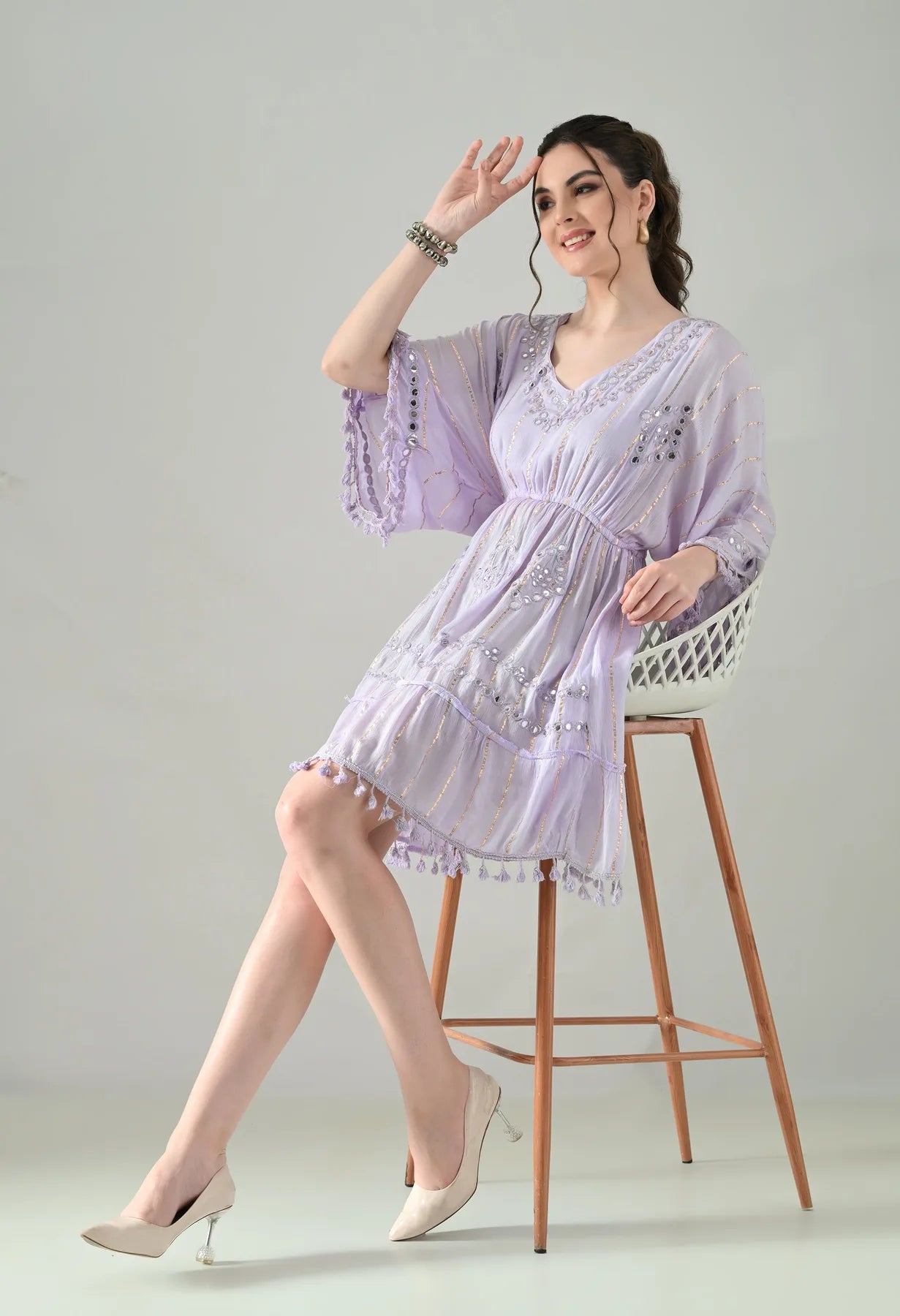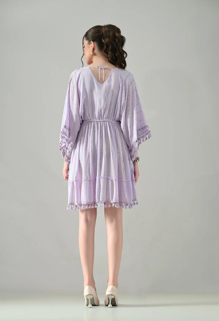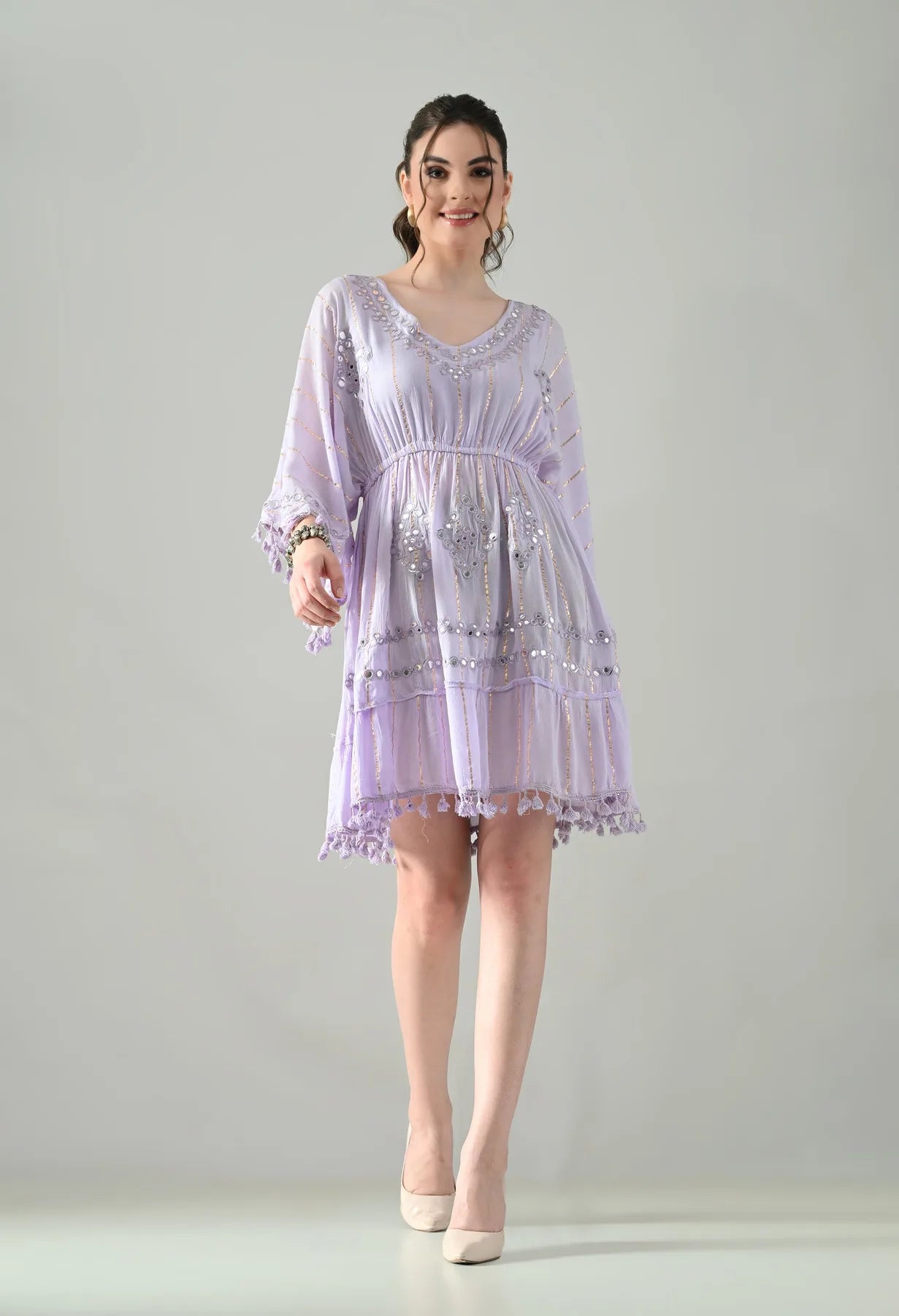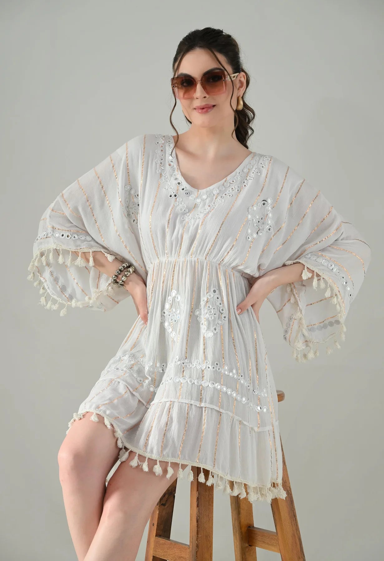 Step into effortless boho charm with this breezy short flared dress, crafted to shine with its intricate all-over mirror embroidery. Designed with a flattering V-neckline and adjustable back tie, it ensures a comfortable, personalized fit. The elasticated gathered waist adds definition, while the soft rayon gauze lining on the upper body ensures all-day ease. Featuring cut-and-sew panels for added movement, 3/4 kimono sleeves, and tassel lace detailing on the hem and cuffs, this dress blends festive sparkle with relaxed elegance. Perfect for day-to-night occasions where comfort meets glow.
