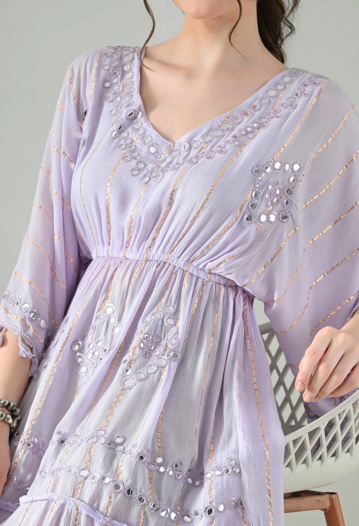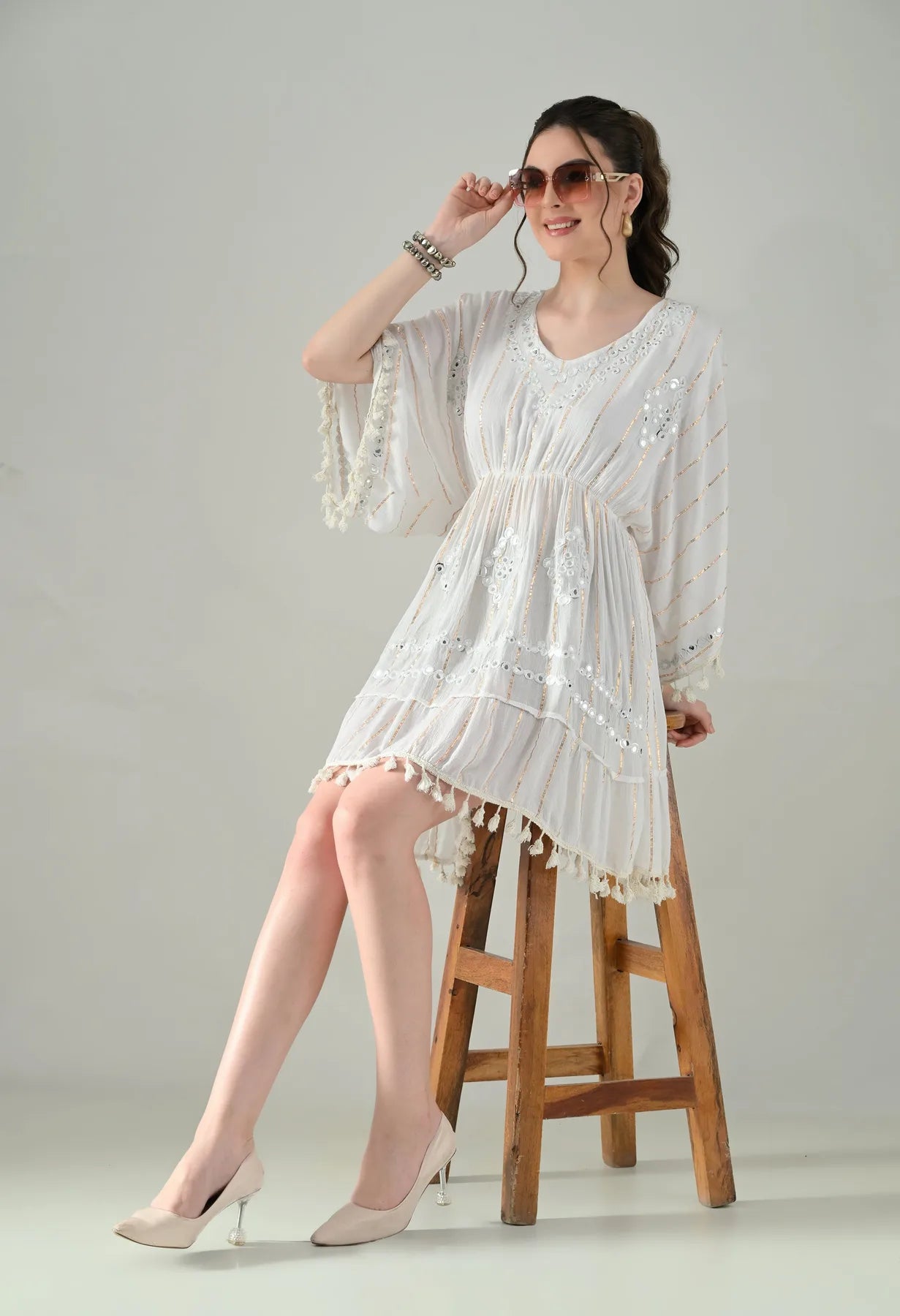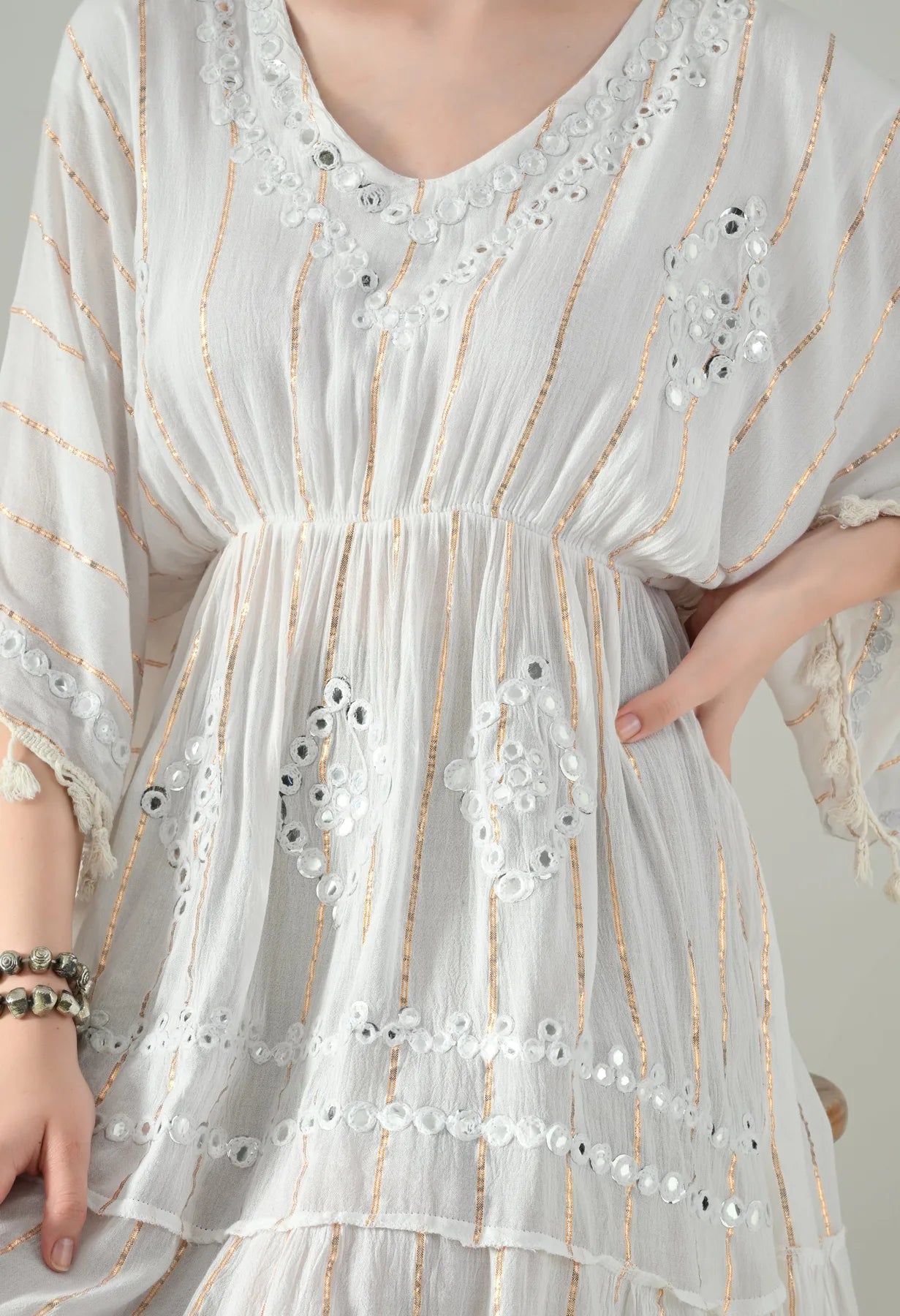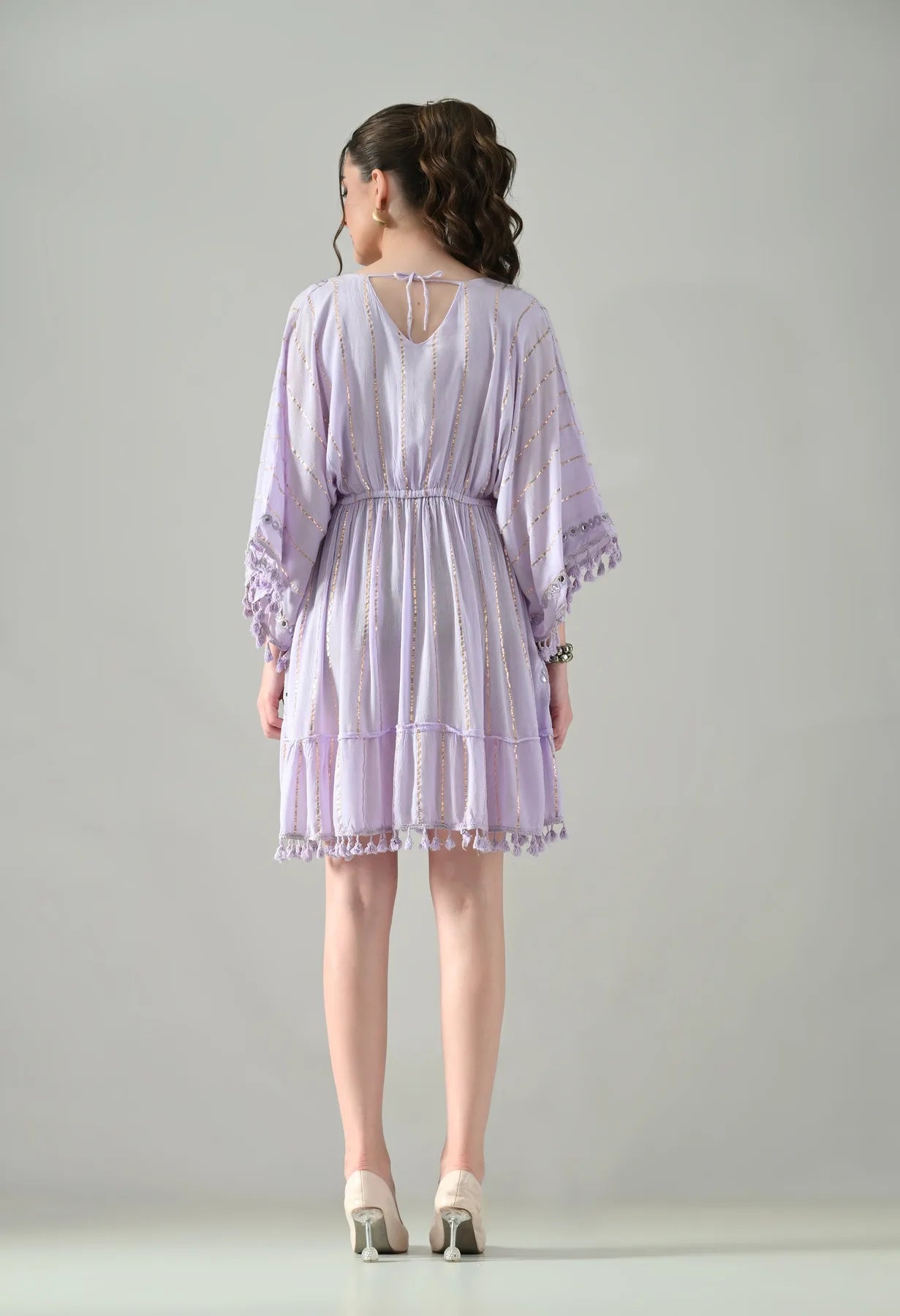 Step into effortless boho charm with this breezy short flared dress, crafted to shine with its intricate all-over mirror embroidery. Designed with a flattering V-neckline and adjustable back tie, it ensures a comfortable, personalized fit. The elasticated gathered waist adds definition, while the soft rayon gauze lining on the upper body ensures all-day ease. Featuring cut-and-sew panels for added movement, 3/4 kimono sleeves, and tassel lace detailing on the hem and cuffs, this dress blends festive sparkle with relaxed elegance. Perfect for day-to-night occasions where comfort meets glow.