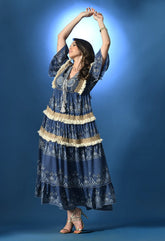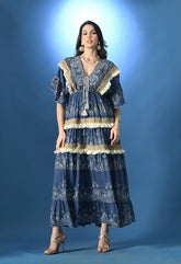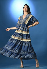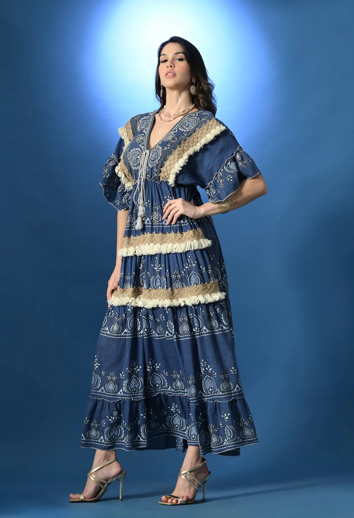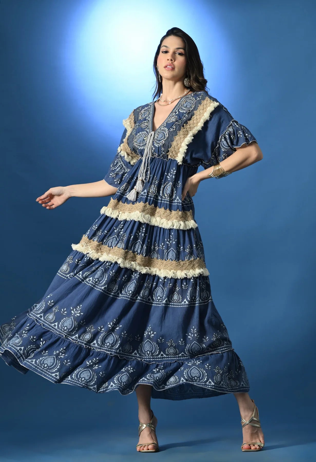 Elevate your style with this effortlessly chic printed maxi dress. Designed with a V-neckline and tassel ties, it features an elasticated waist, fringe lace with silver beadwork, and a flowy cut-and-sew panelled skirt for graceful movement. Finished with ½ ruffle sleeves and partial lining, this non-stretchable dress in soft, breathable fabric blends comfort with sophistication—perfect for festive occasions, casual gatherings, or relaxed evenings.
