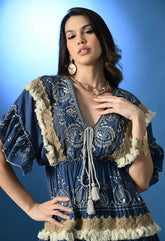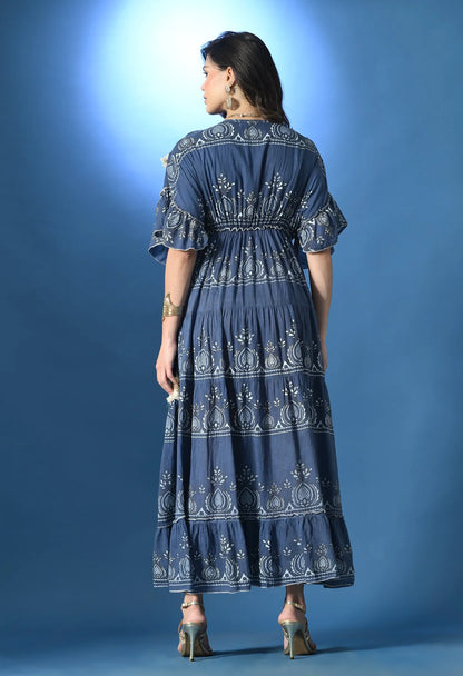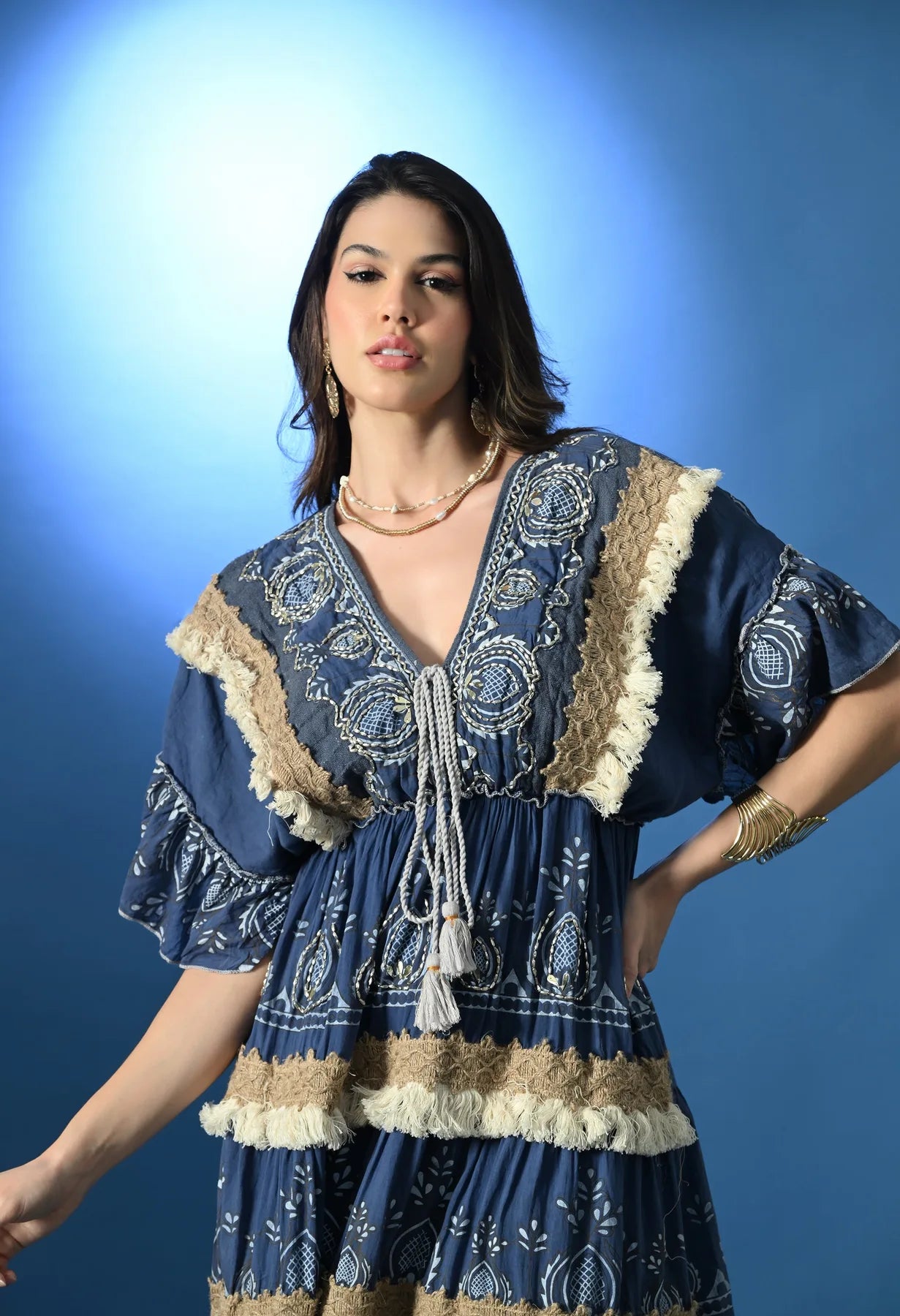 The Royal Bloom Maxi Dress in a cascade of ocean blue is a designer's ode to the woman whose aura commands every gaze. Woven in soft cotton cambric fabric, this dress inspires effortless confidence. The ensemble comes together with accented tassel ties and intricate silver bead embellishments.