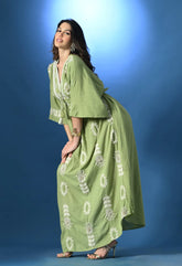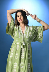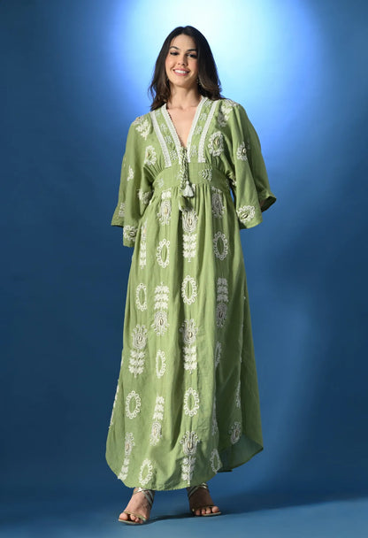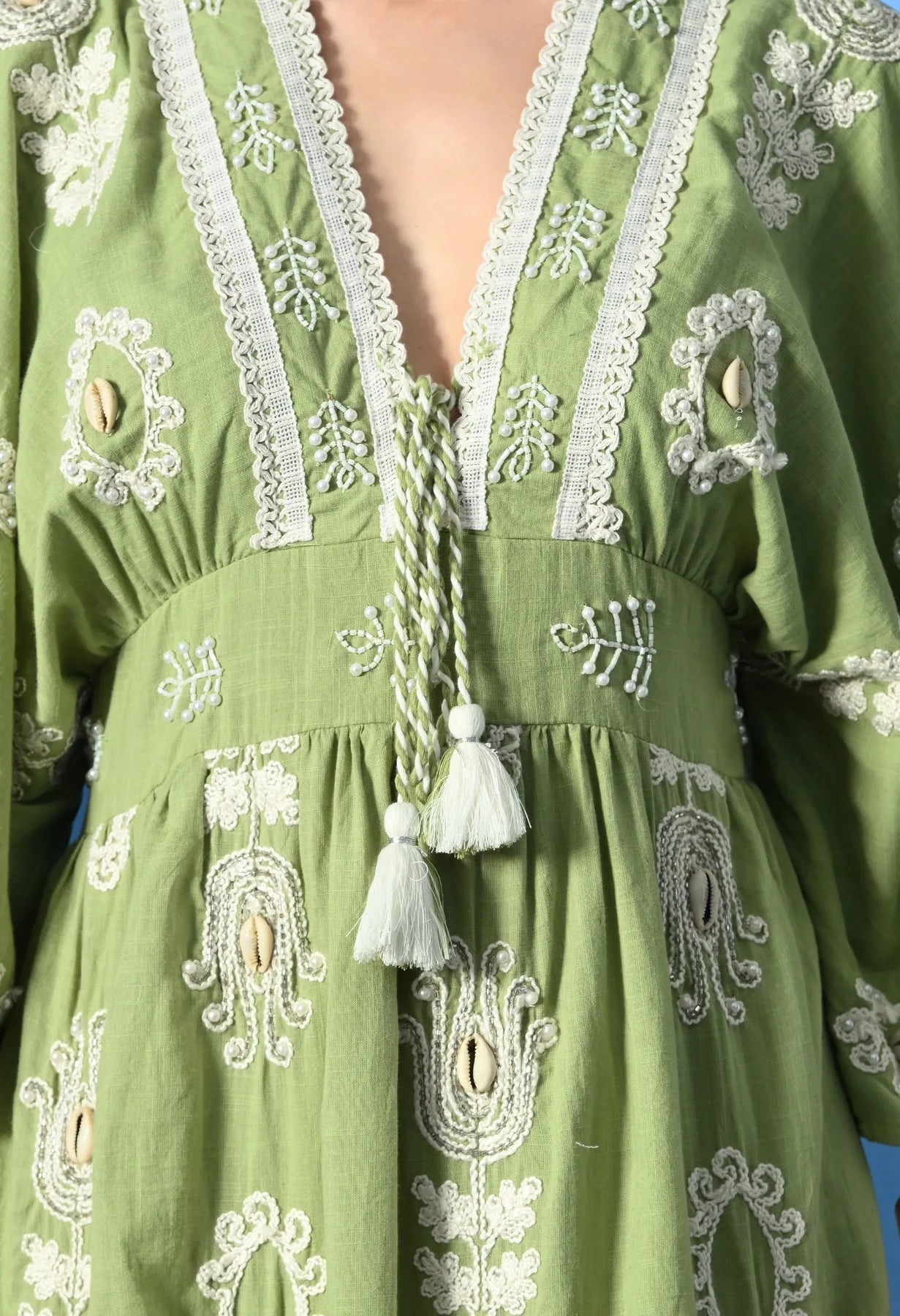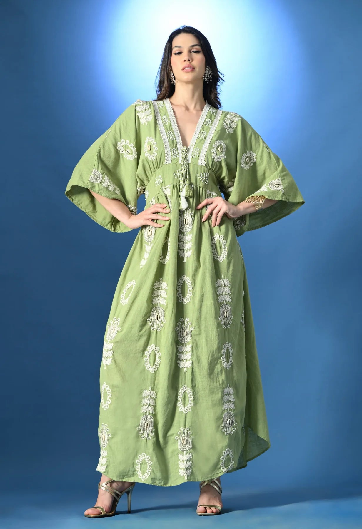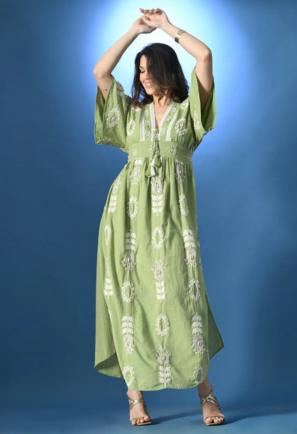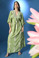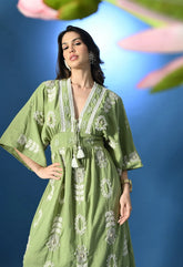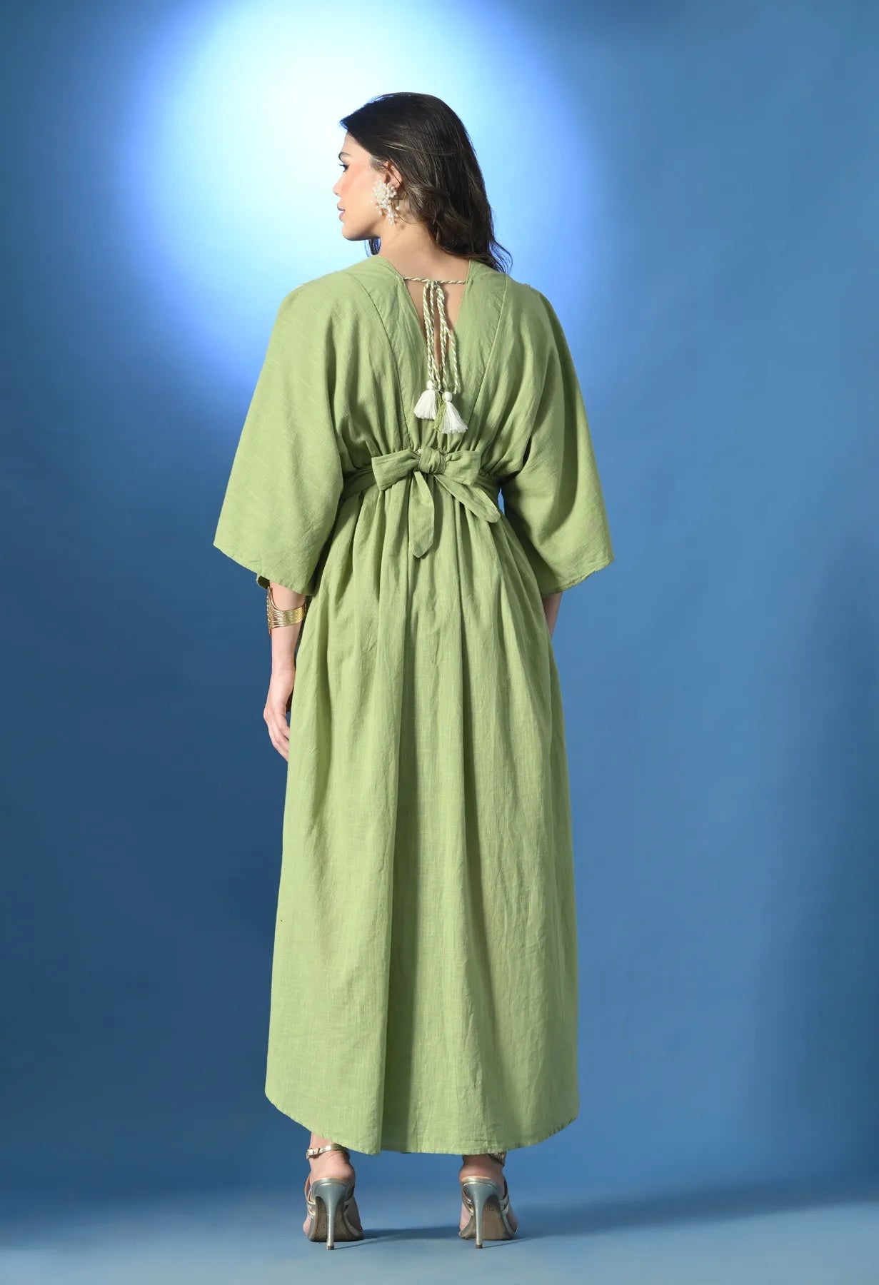 Step into effortless elegance with this maxi dress featuring a V-neckline with lace, dual-color tassel ties at front and back V neckline with tieable string, cinched band waistline in front with elasticated back waistline. Gathers ensure a flattering fit, while front embroidery with beadwork adds artisanal charm. Designed with tieable belt, ¾ kimono sleeves, and side slits with slight U-shaped hem, this partially lined, soft, and breezy non-stretchable dress offers both comfort and style.