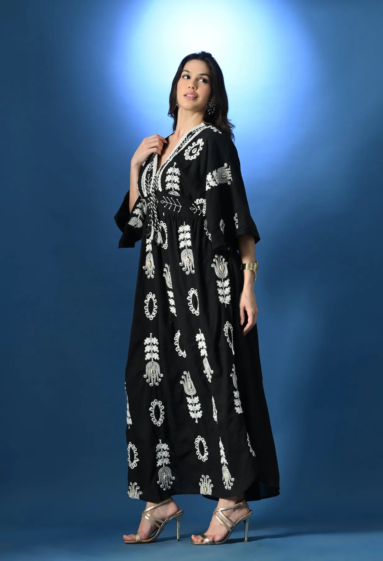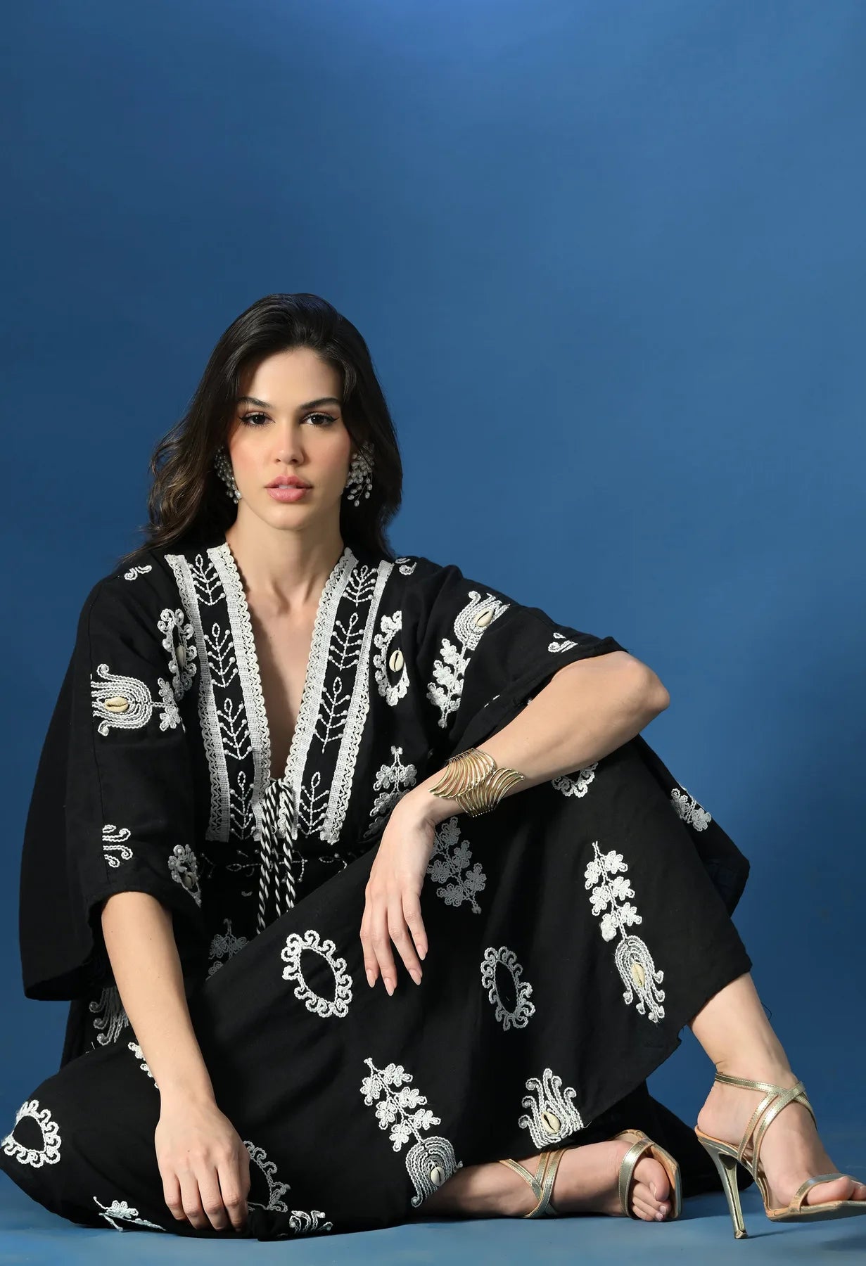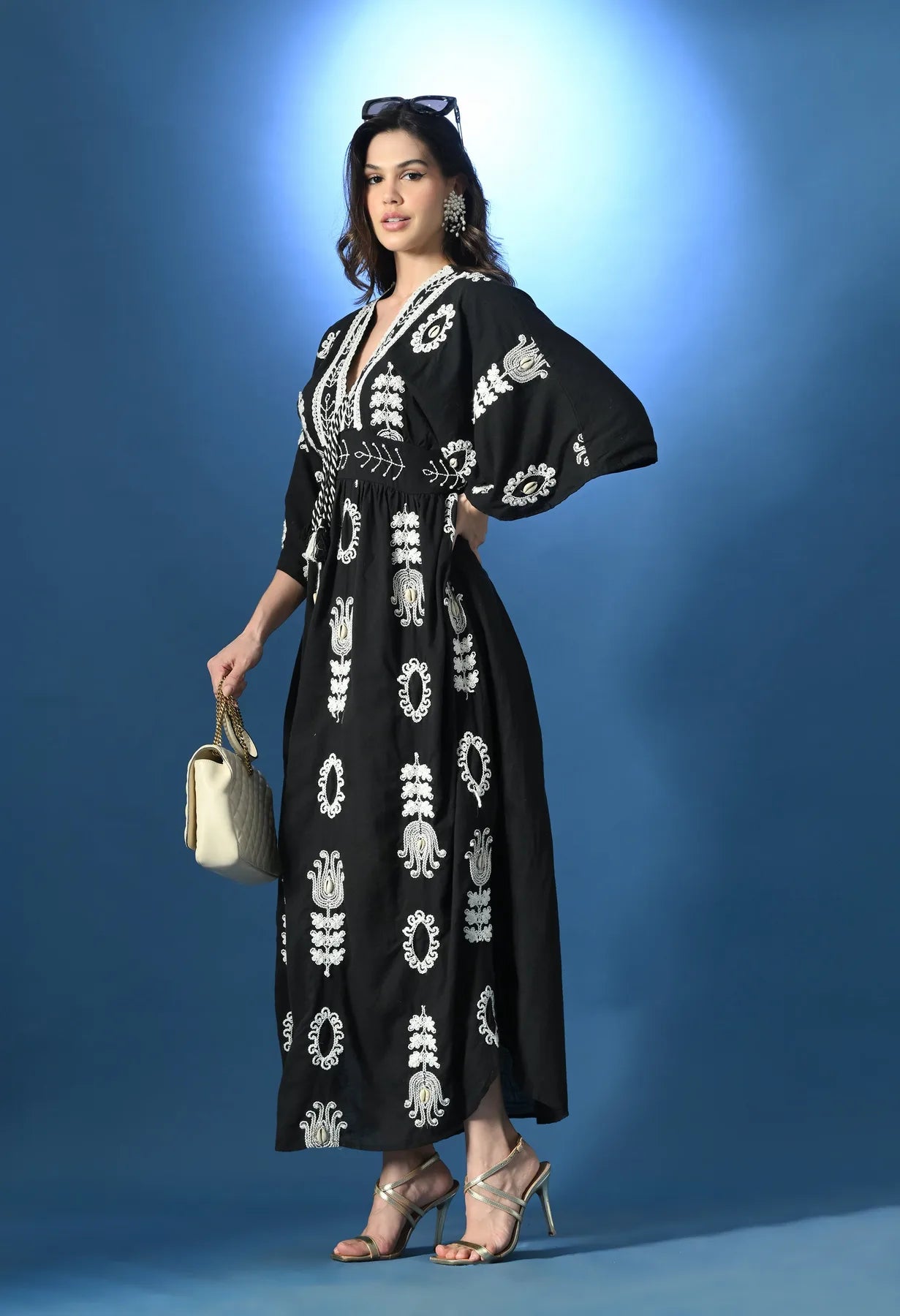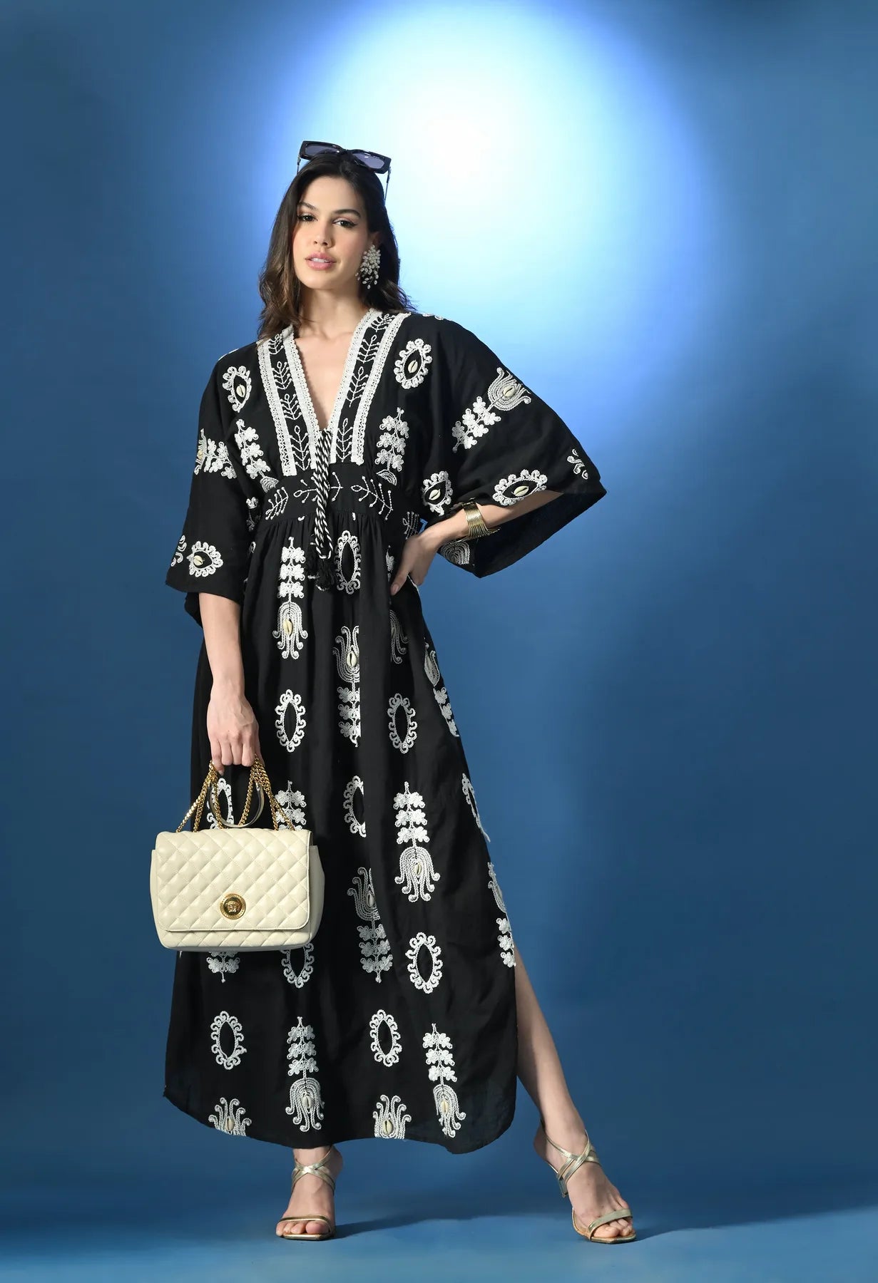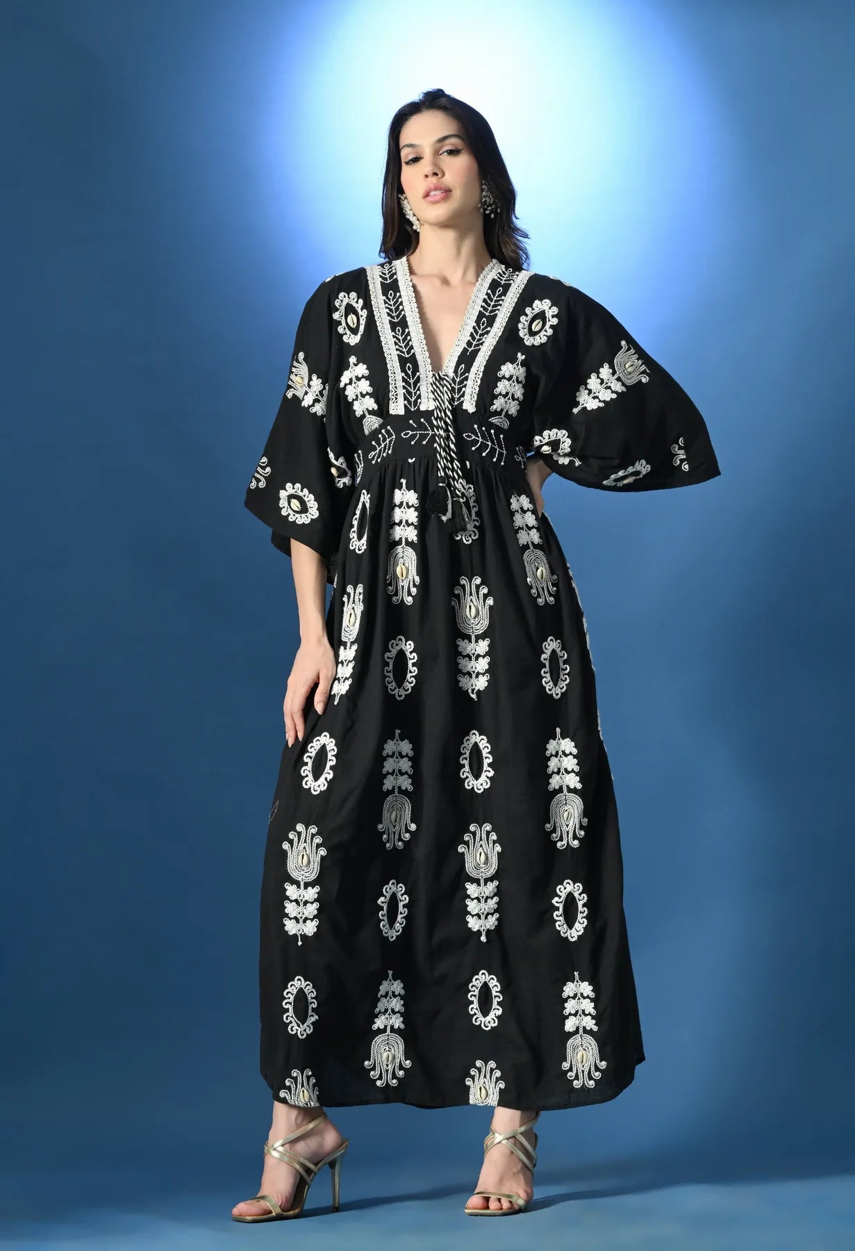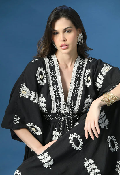 Step into effortless elegance with this maxi dress featuring a V-neckline with lace, dual-color tassel ties at front and back V neckline with tieable string, cinched band waistline in front with elasticated back waistline. Gathers ensure a flattering fit, while front embroidery with beadwork adds artisanal charm. Designed with tieable belt, ¾ kimono sleeves, and side slits with slight U-shaped hem, this partially lined, soft, and breezy non-stretchable dress offers both comfort and style.