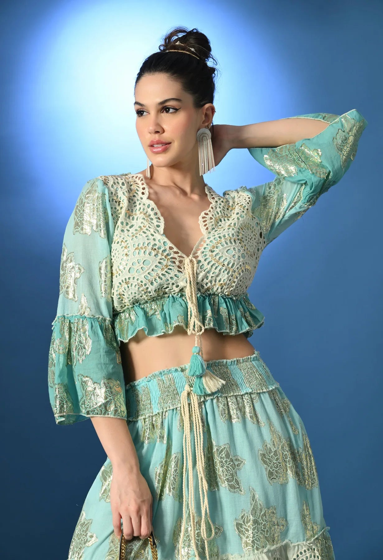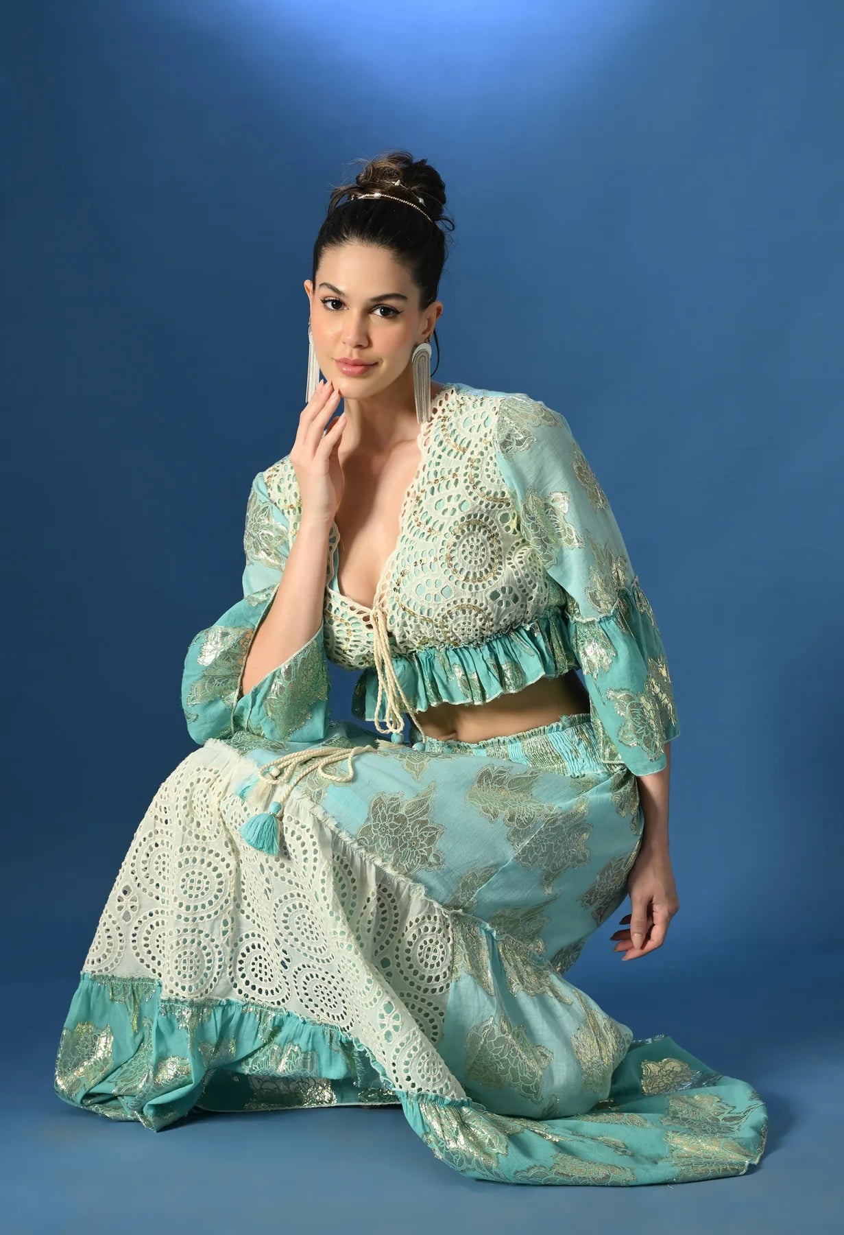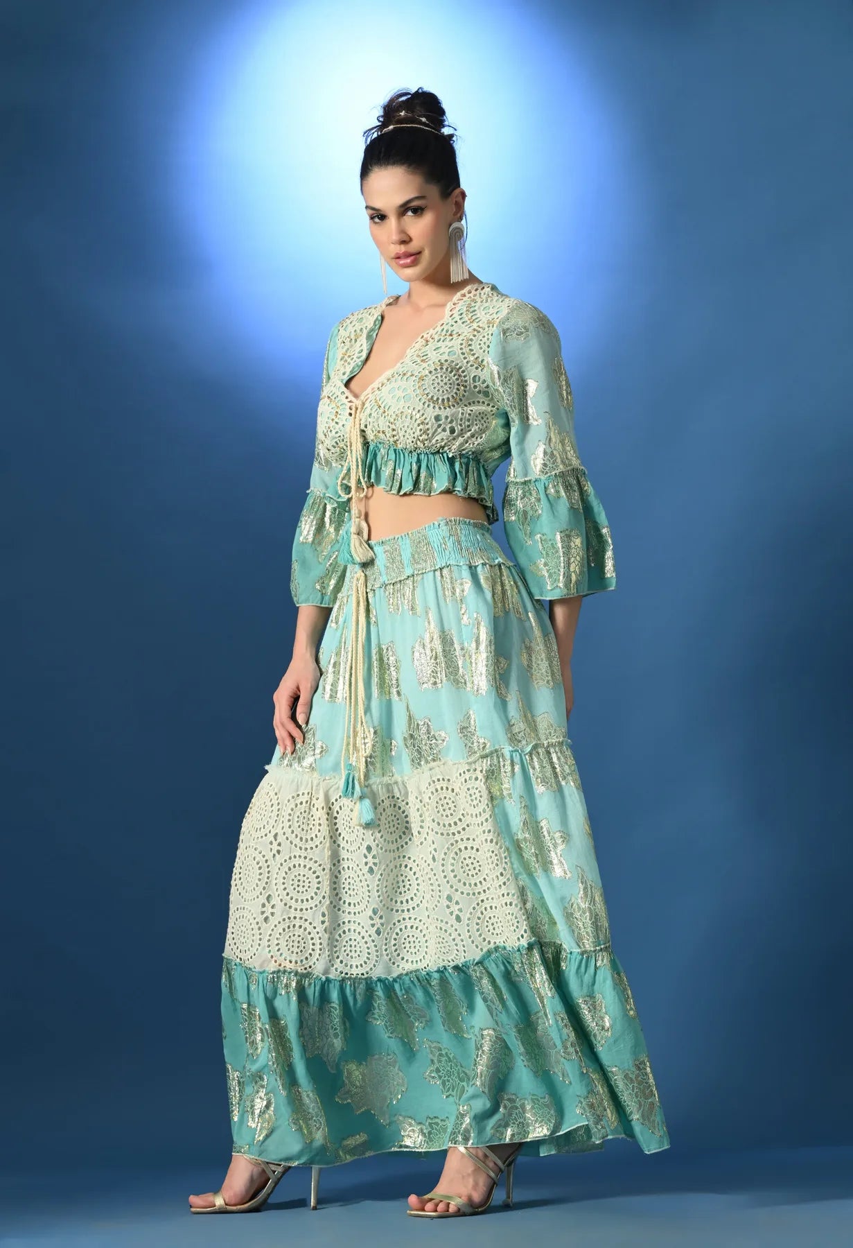 Elegant cordset features a scalloped V-neckline with a string tie and multicolor tassels, paired with a schiffli front panel highlighted with delicate sequin work. The elasticated waist with gathers flatters the silhouette, while the ¾ sleeves with ruffle openings in lurex fabric add a chic touch. A lurex ruffle hem and schiffli cut & sew panel at the center front enhance the crafted look. The long flared lurex skirt, complete with a smocked waist and tassel tie, flows beautifully with every step. Soft, and comfortable, this non-stretchable piece is designed for elegance and ease, making it perfect for festive and special occasions.