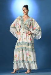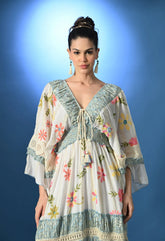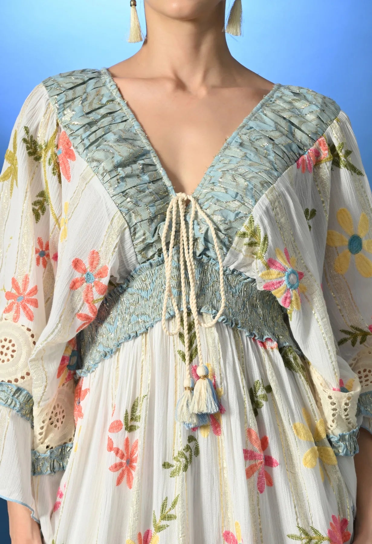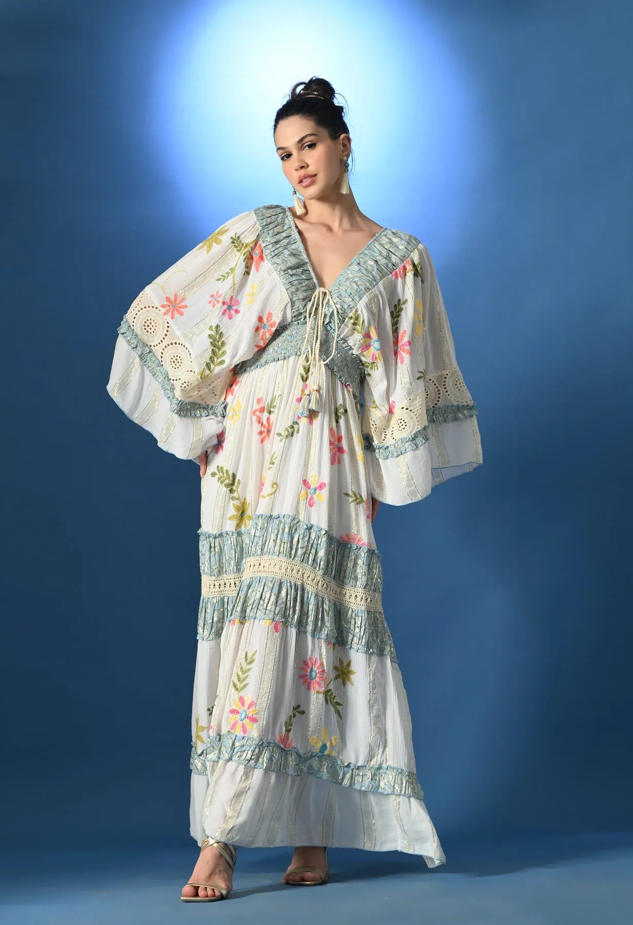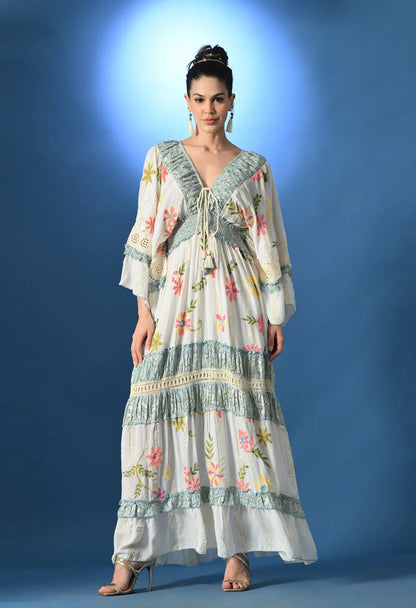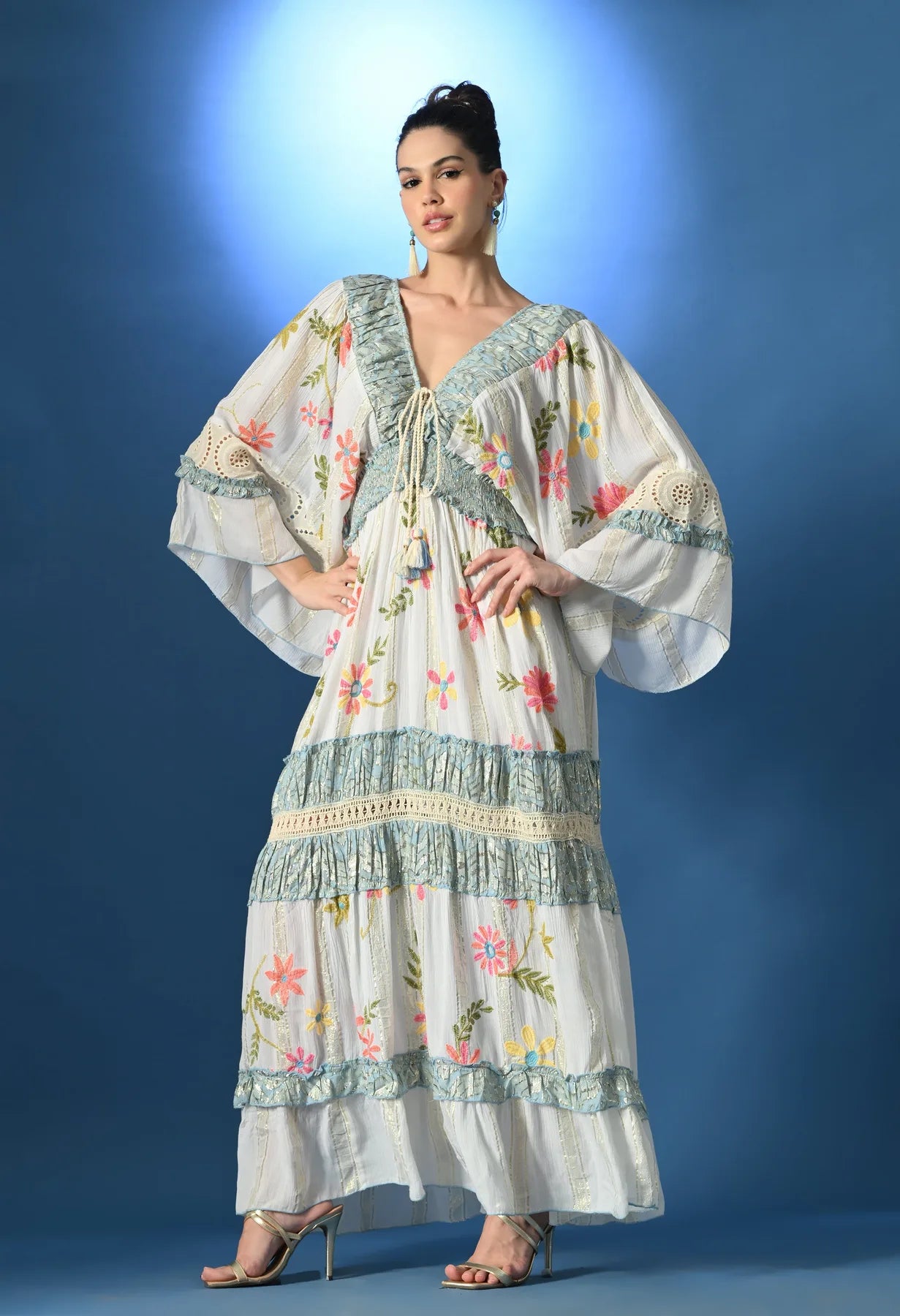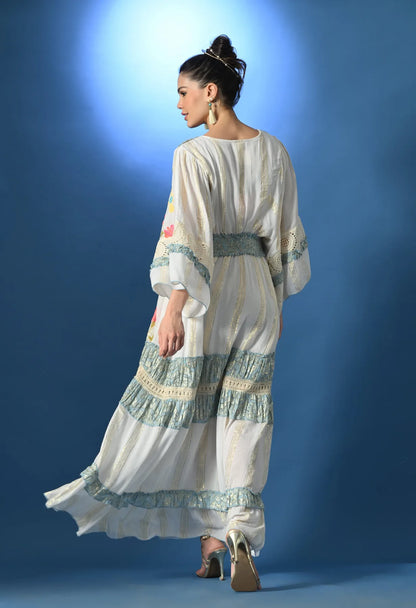 Shine in this Lurex stripe maxi dress featuring a V-neckline with a string and two-color tassel tie. The dress is crafted in blue lurex fabric all over, with a smocked lurex panel at the center front, thread embroidery in front, and a crochet lace detail for added elegance. A gathered elastic waist ensures a flattering silhouette, while ¾ kimono sleeves with ruffle openings and schiffli panels offer a graceful, airy look. Half lined for comfort, this dress is made from soft, breezy, non-stretchable fabric, making it perfect for festive occasions, parties, or special gatherings.