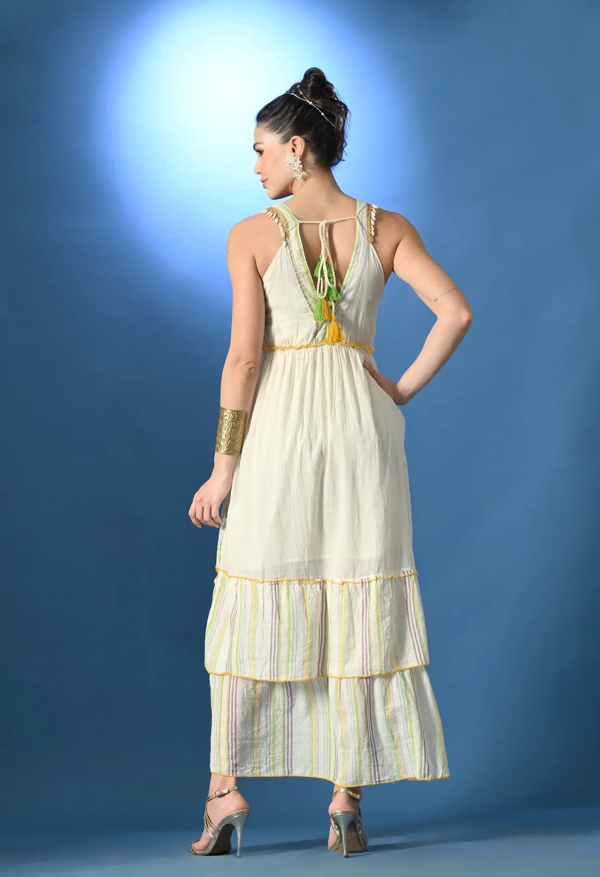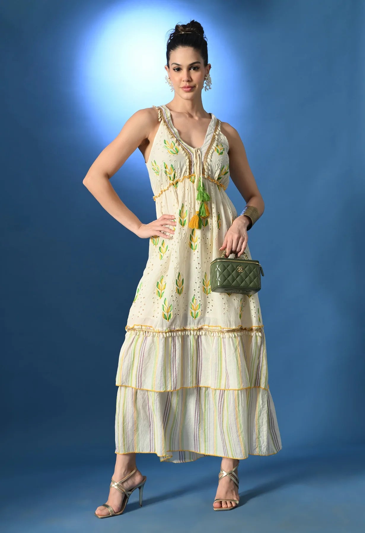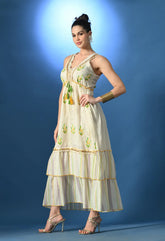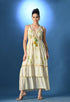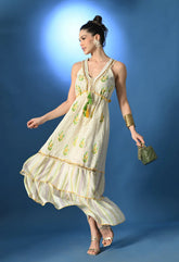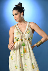 Schiffli Maxi Dress featuring a V neckline and sleeveless design with string ties and dual-color tassels at the front and back. Embellished with golden lace and pearl beads at the neckline and hem, and detailed with leaf embroidery across the front. Designed with an elasticated gathered waist, two-stripe cut panel bottom, and yellow thread baby overlock finish. Made from soft, breezy, non-stretchable fabric, half lined for comfort and elegance.