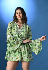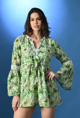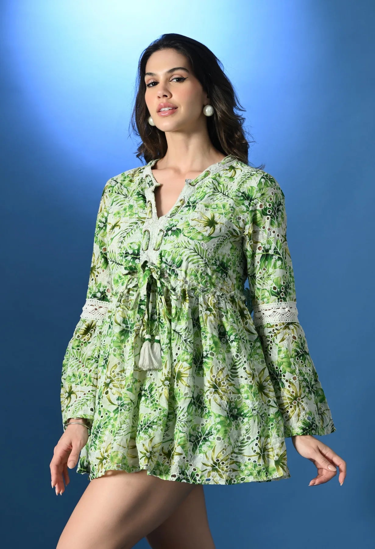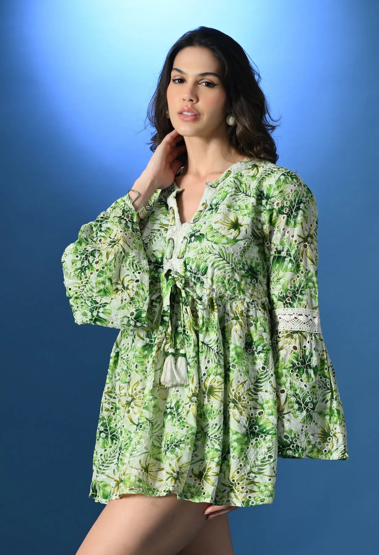 A chic tropical Schiffli Micro Mini Dress designed with a flattering V-neckline, brass eyelets, and a delicate string. The front is adorned with intricate crochet lace, while gathers at the waist create a feminine silhouette. Featuring bell sleeves and a lace patch at the back, this lined dress combines breezy comfort with stylish detailing. Crafted from soft, lightweight, non-stretchable fabric, it’s perfect for sunny days and effortless elegance.