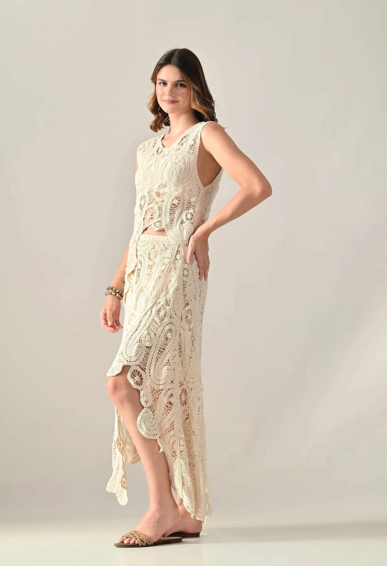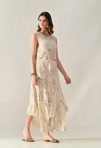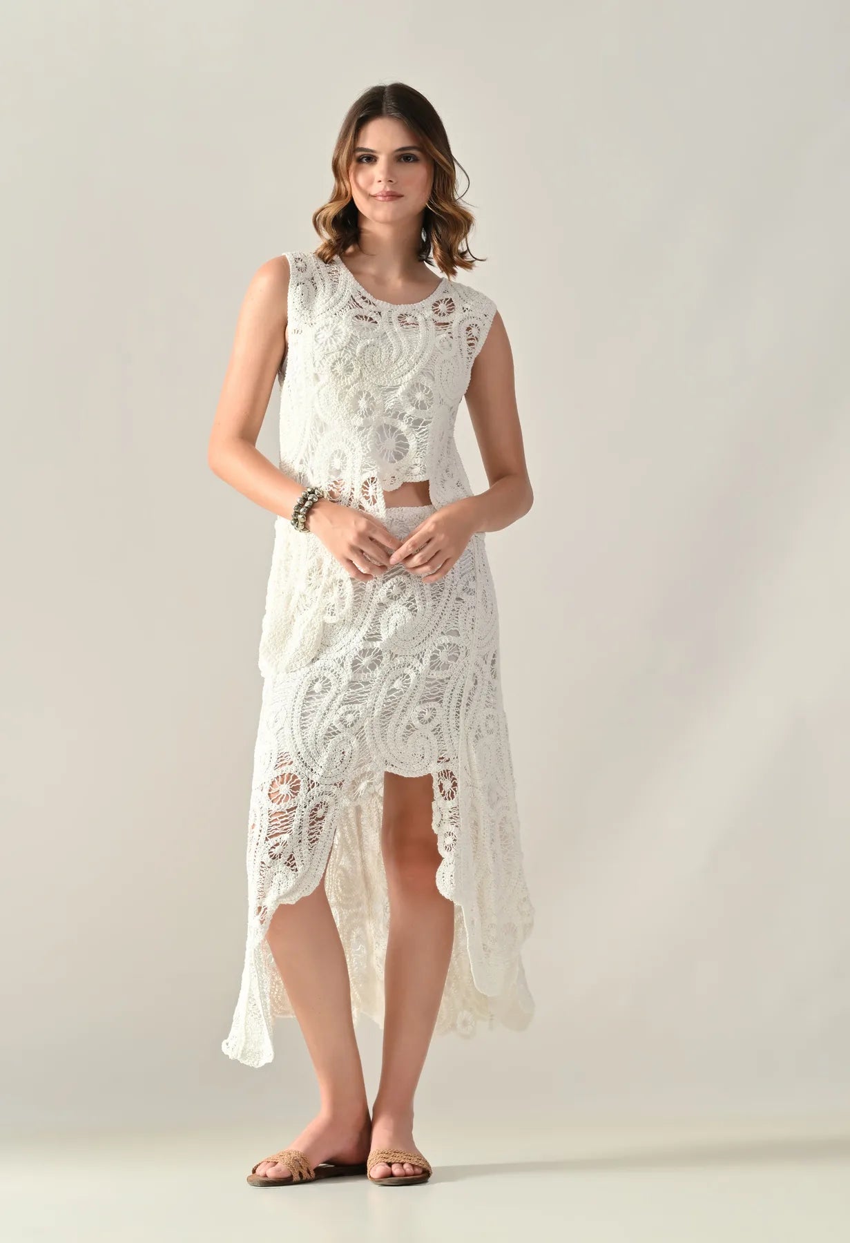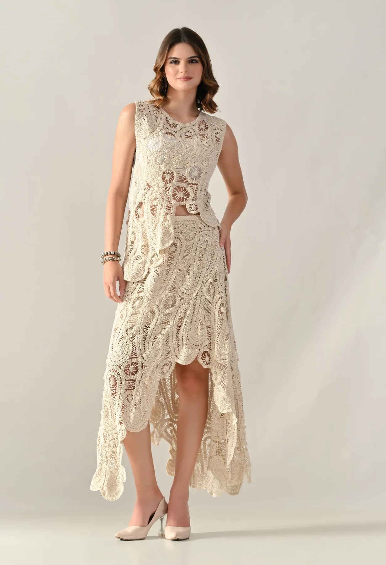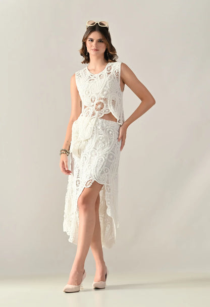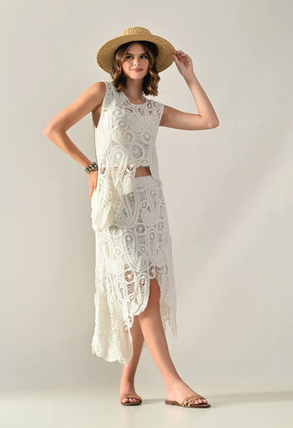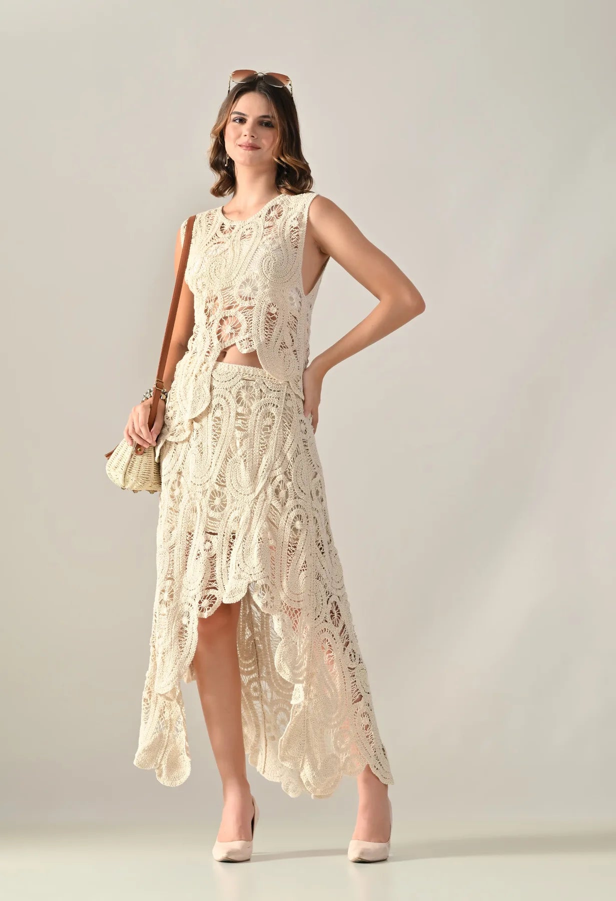 Crochet lace co-ord set featuring a sleeveless top with round neckline and asymmetrical hem. The matching skirt includes an elasticated waistband, soft inner lining, and asymmetrical hem for a chic, feminine finish.