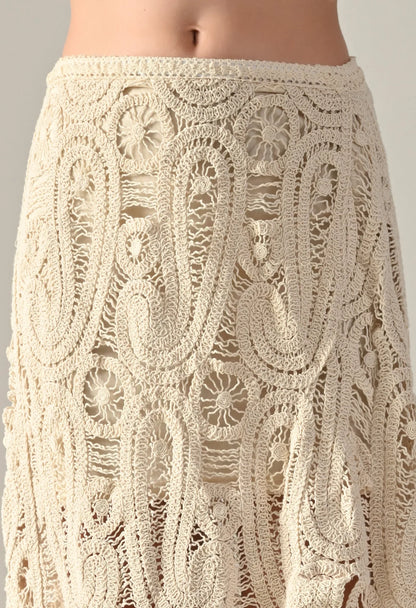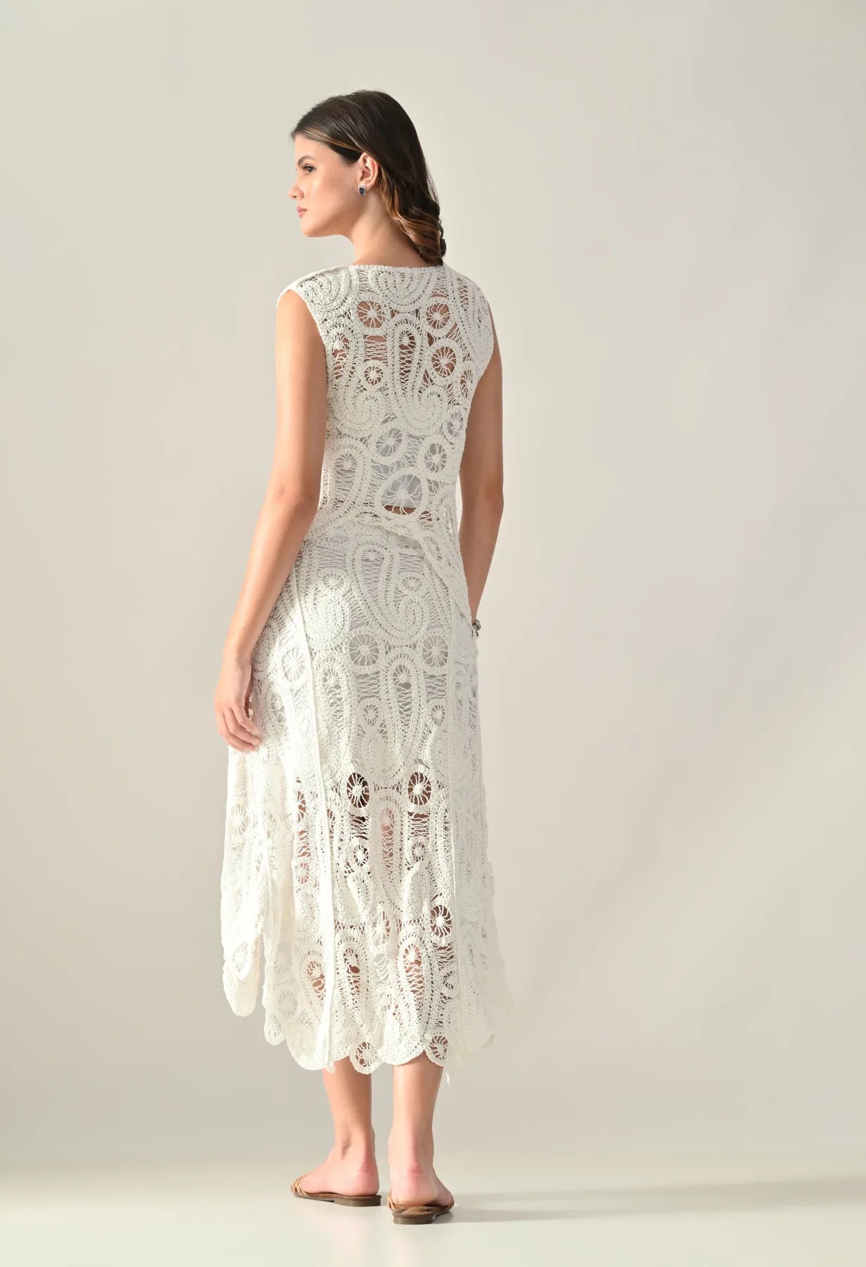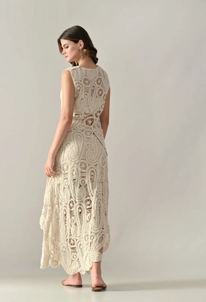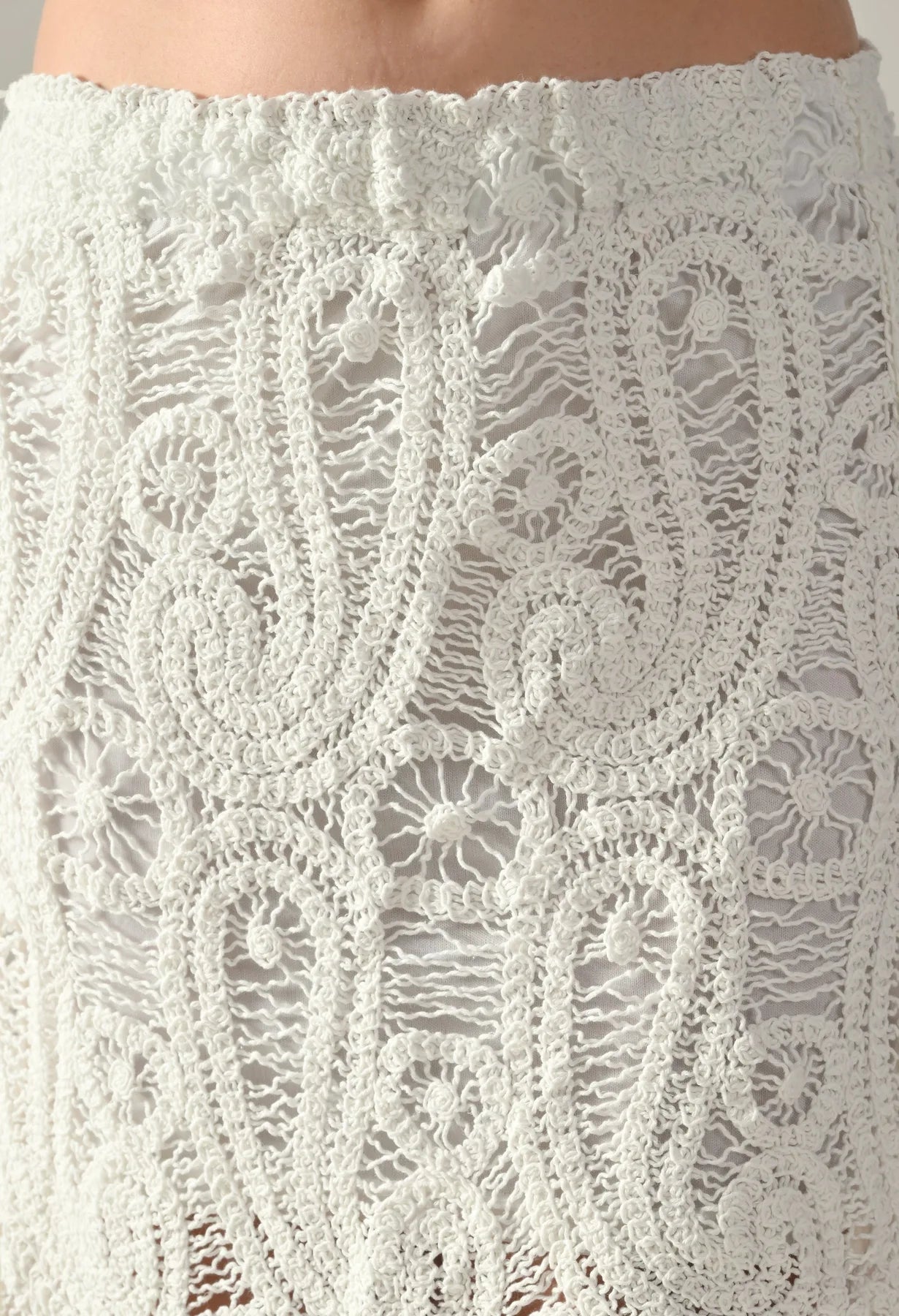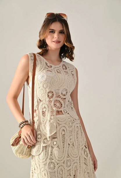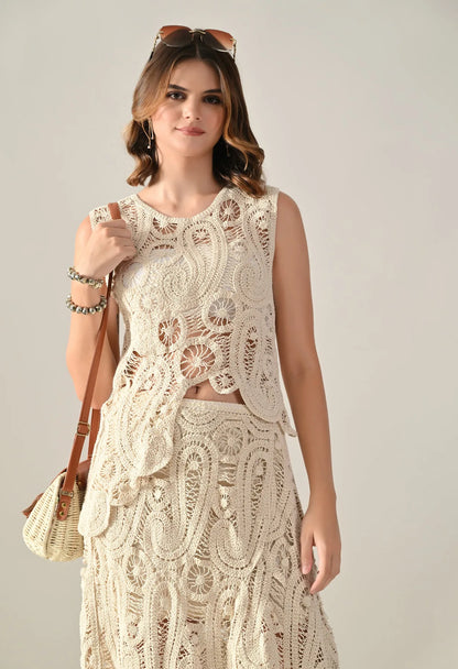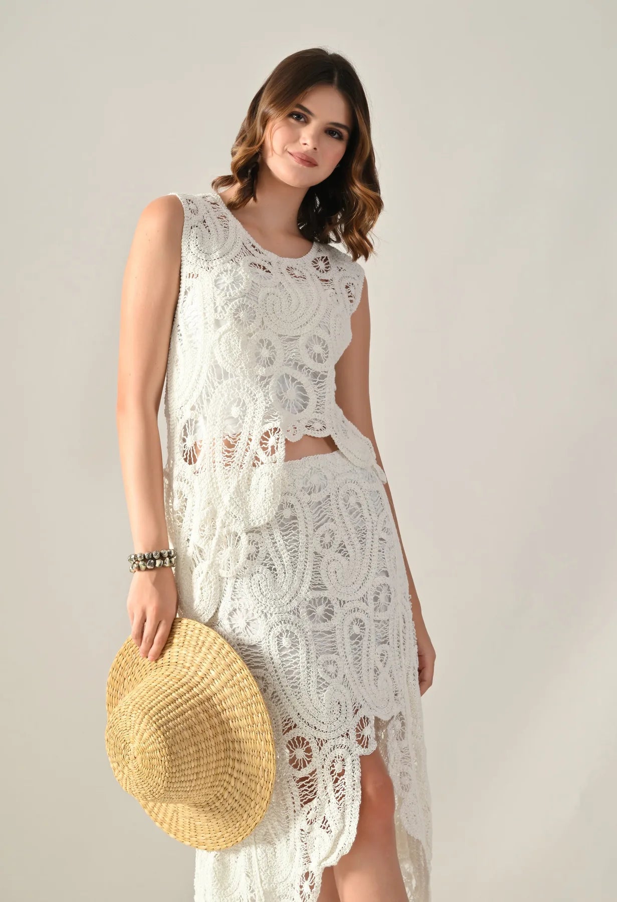 Crochet lace co-ord set featuring a sleeveless top with round neckline and asymmetrical hem. The matching skirt includes an elasticated waistband, soft inner lining, and asymmetrical hem for a chic, feminine finish.