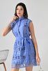 A timeless blend of charm and craftsmanship, this blue sleeveless dress features intricate cut-out detailing, a structured high neck, and delicate front buttons. The belted waist cinches you in just right, while the cotton fabric keeps it breathable and luxe. A summer-ready mini that’s polished, playful, and perfect for brunches to beachside strolls.