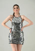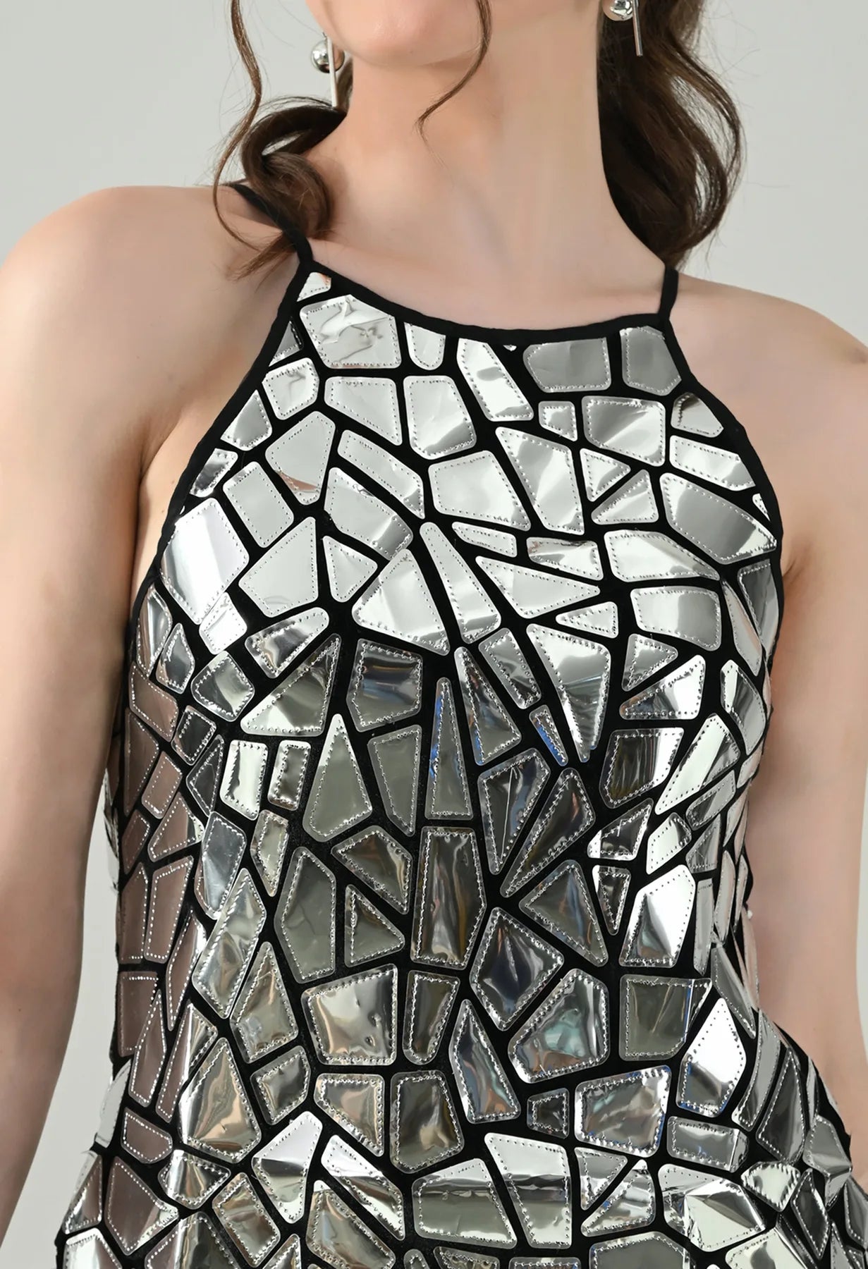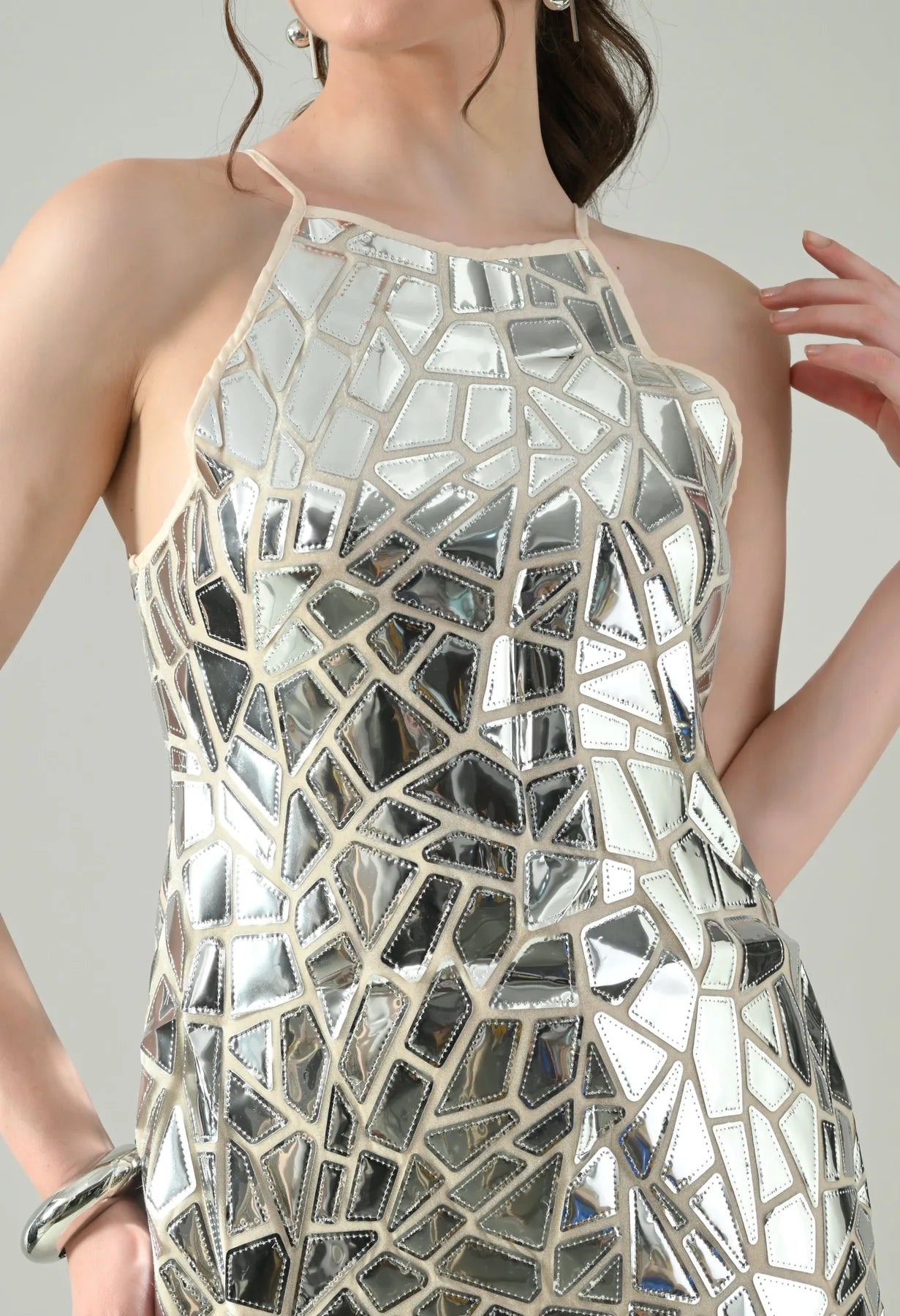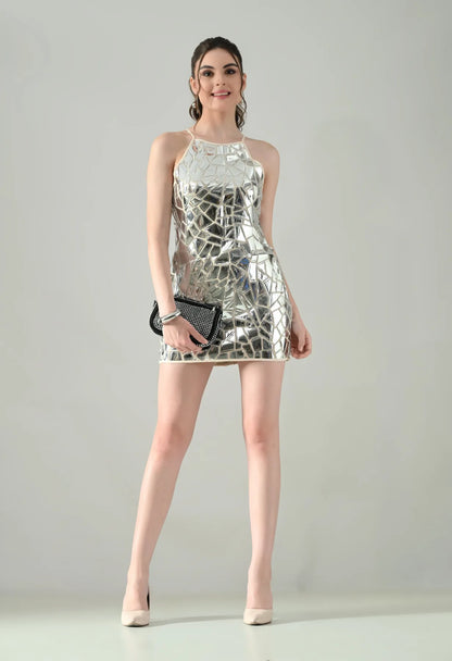 Shine the spotlight in this Patent Foil Bodycon Dress, featuring a bold geometric foil pattern that creates a mirror-like effect. Designed with an apron neckline, sleeveless cut, and a flattering mini length, it comes fully lined with a soft stretchable fabric and a back zip closure for comfort and ease—perfect for statement party looks.