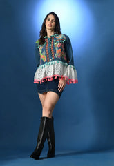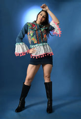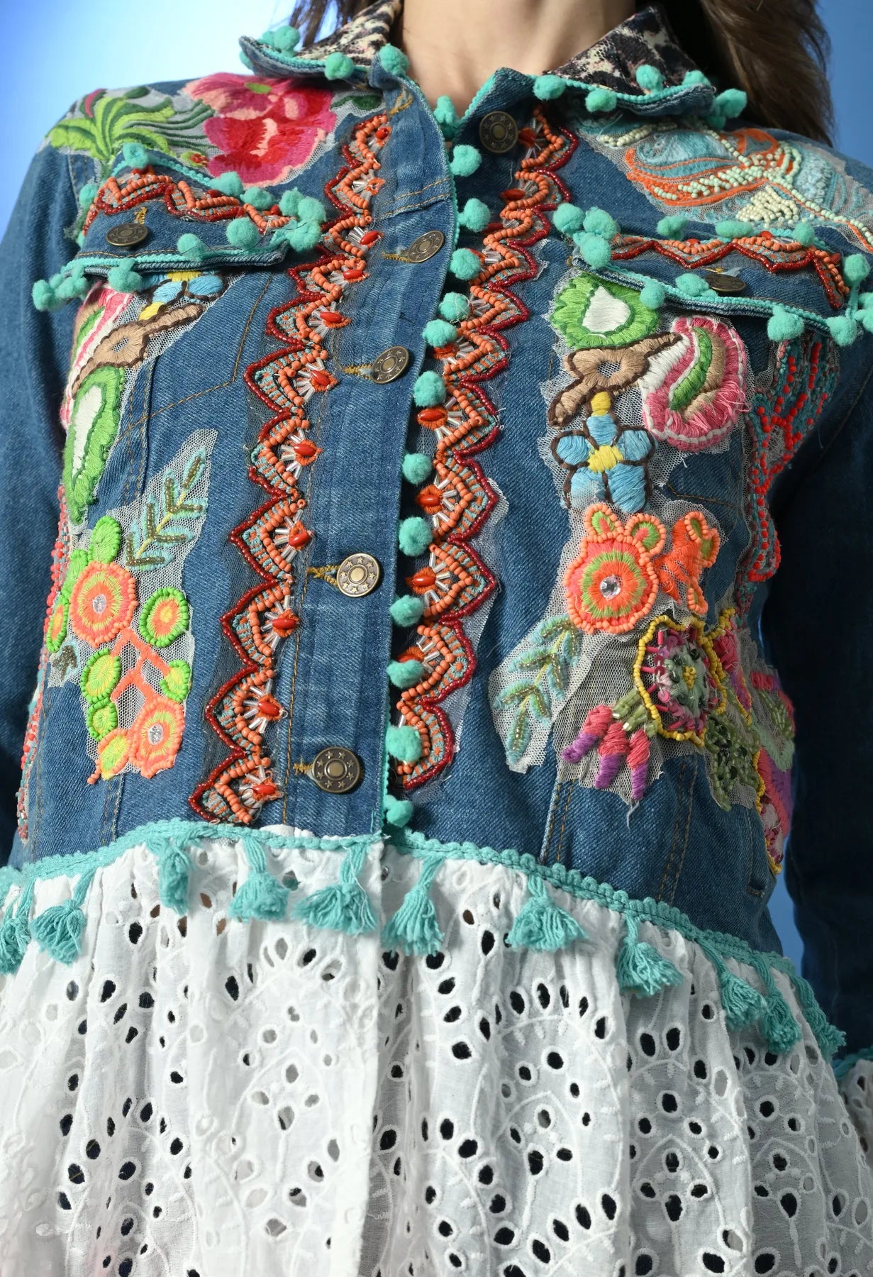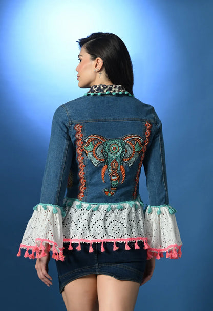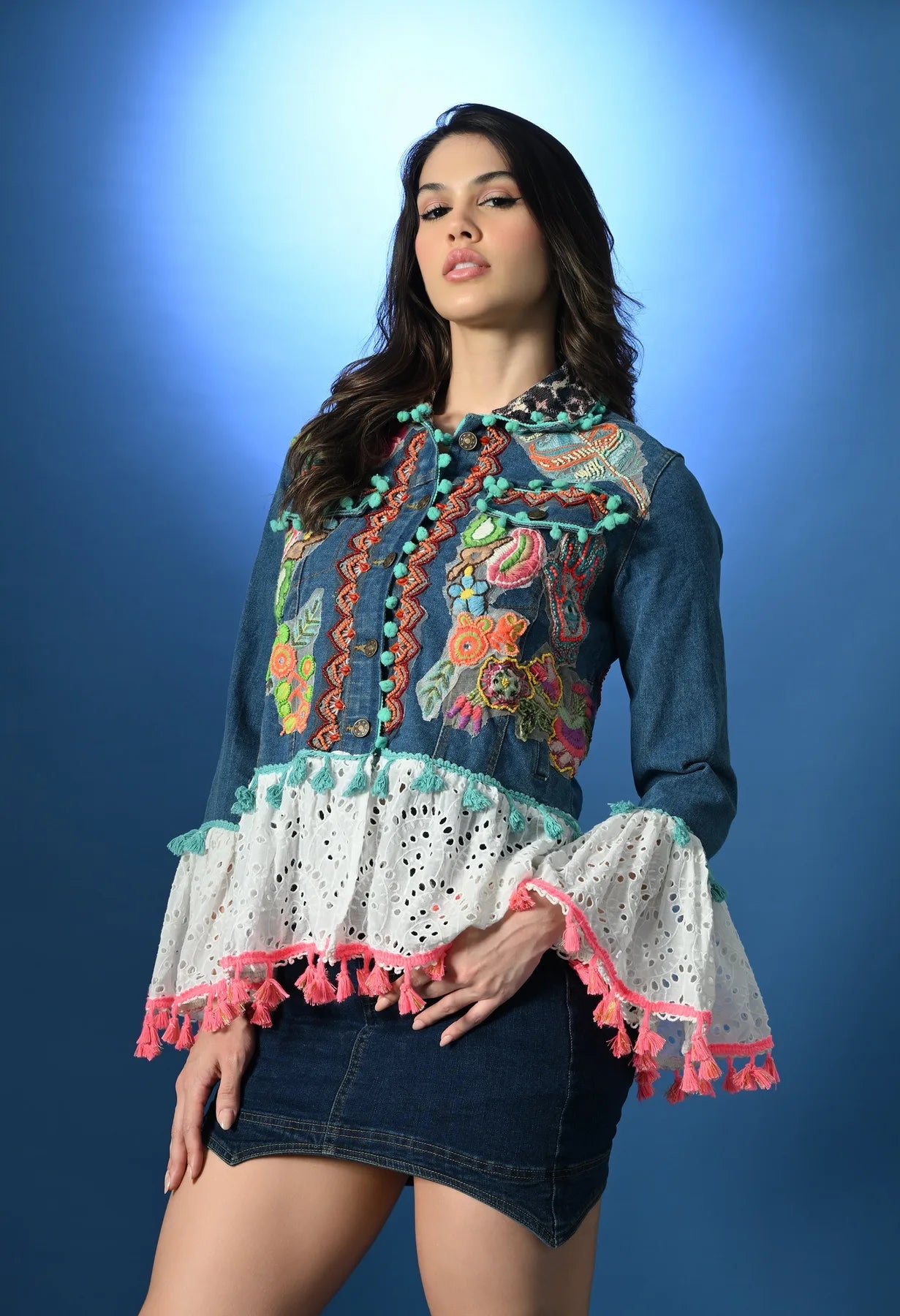 Add a playful twist to your wardrobe with this enzyme-washed denim jacket, designed to blend comfort with statement style. Featuring a regular collar, brass shank buttons, and front flap pockets, this jacket is elevated with floral patch embroidery, pom-pom lace, and neon tassel accents. The Schiffli fabric trims and lace lining lend it a touch of feminine charm, while the soft, stretchable denim ensures effortless comfort.