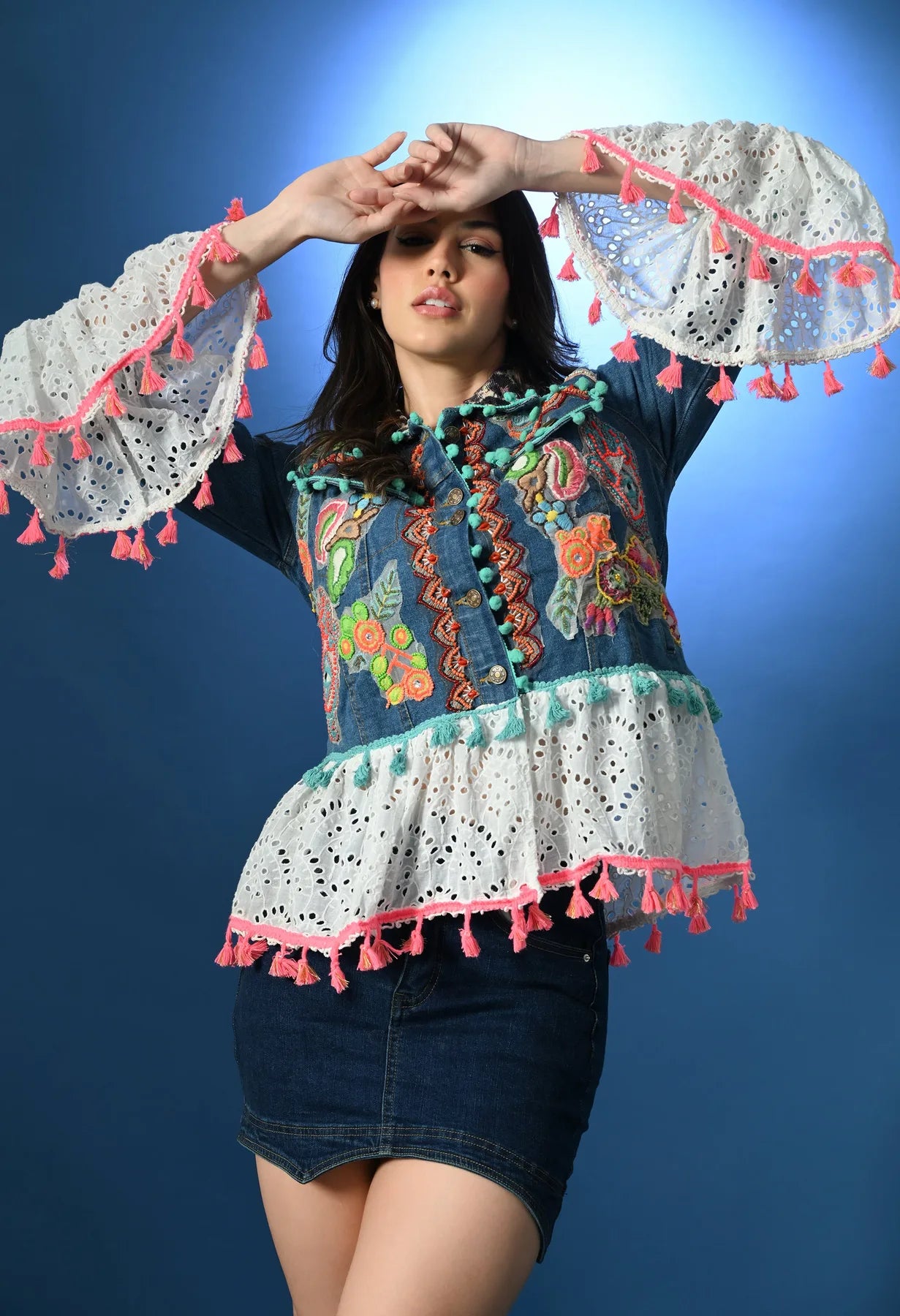Half-denim, half-Schiffli full sleeves with bell openings and tassel accents