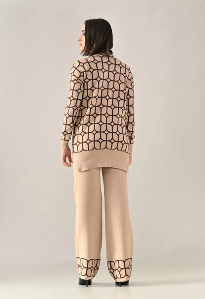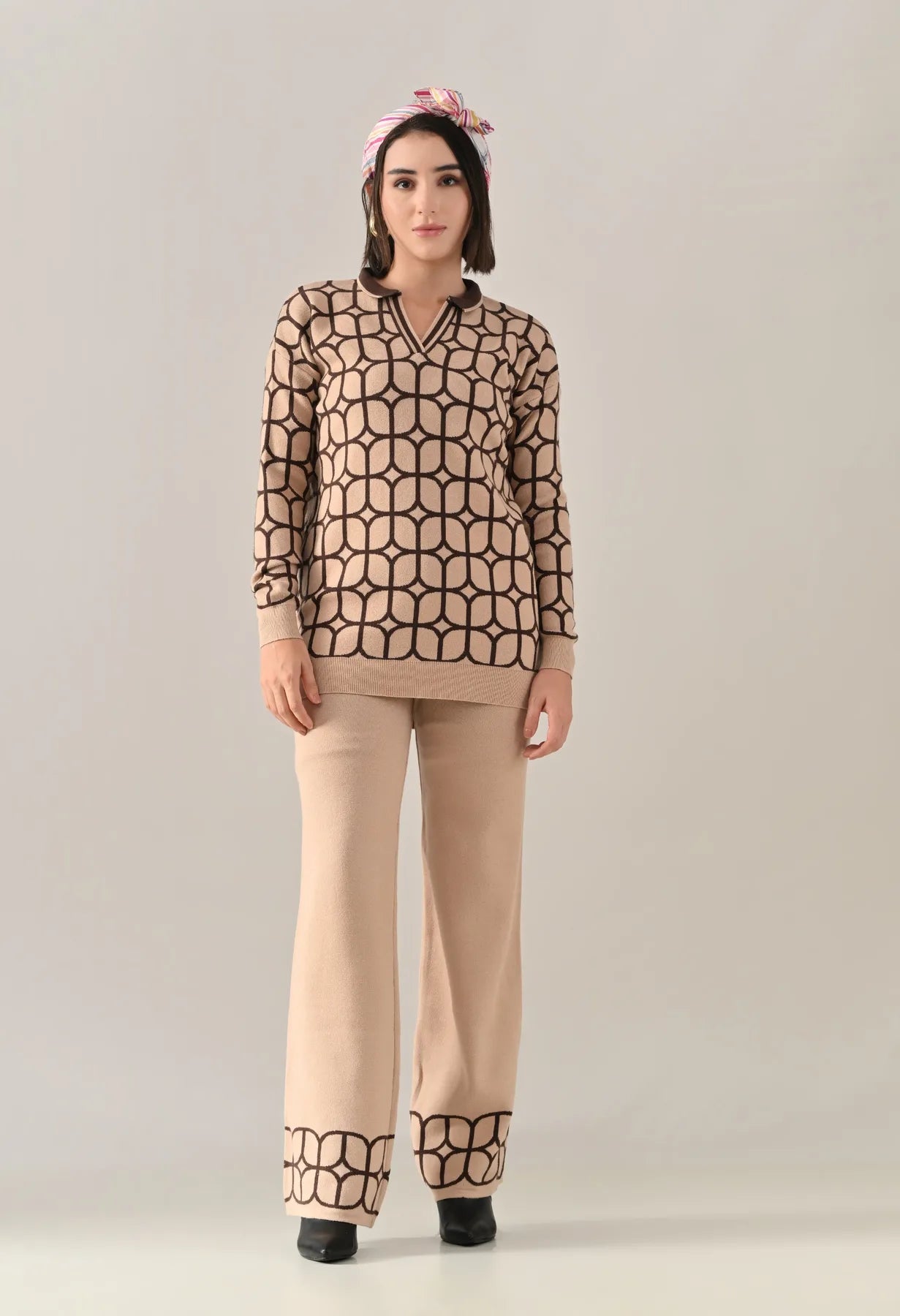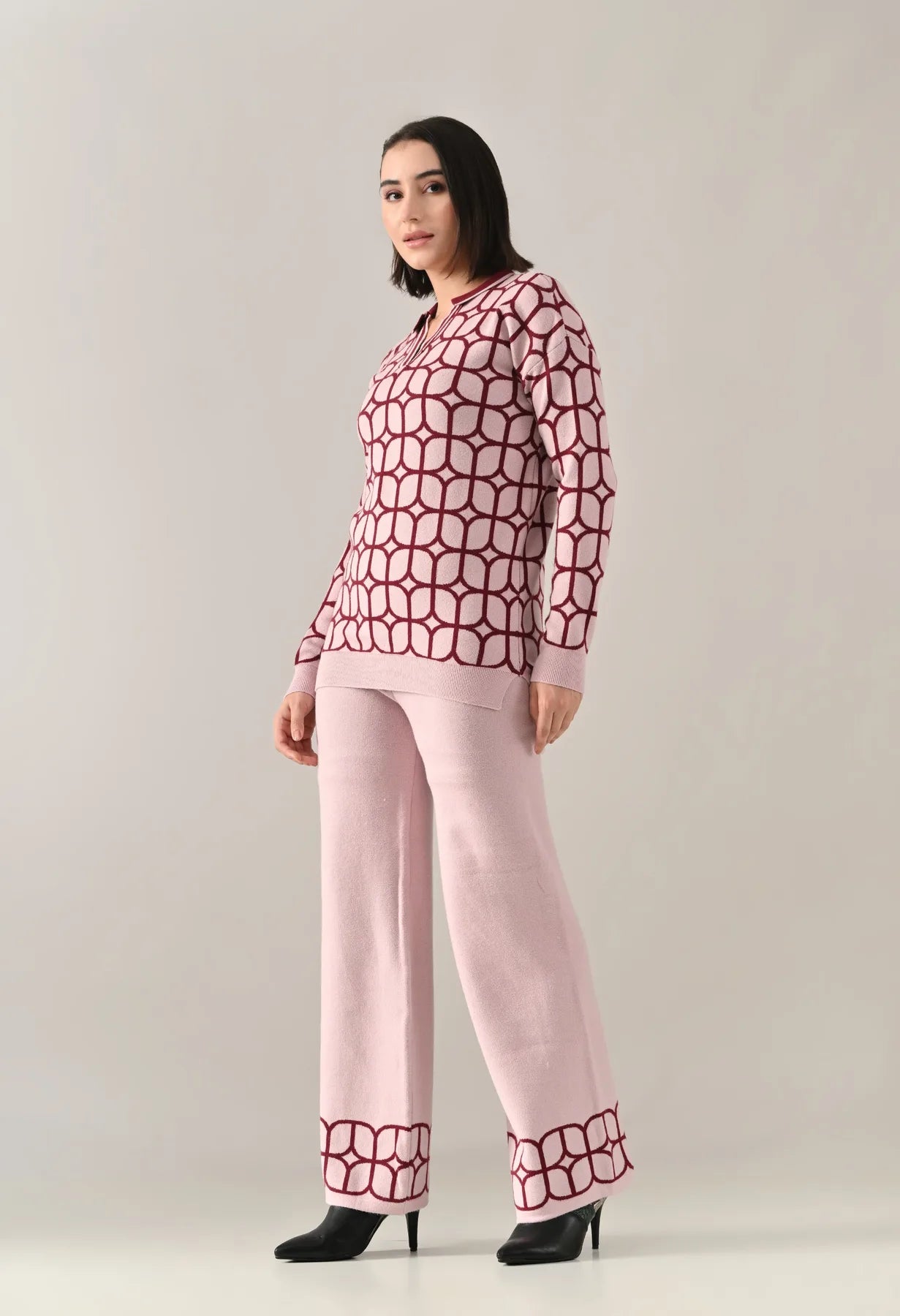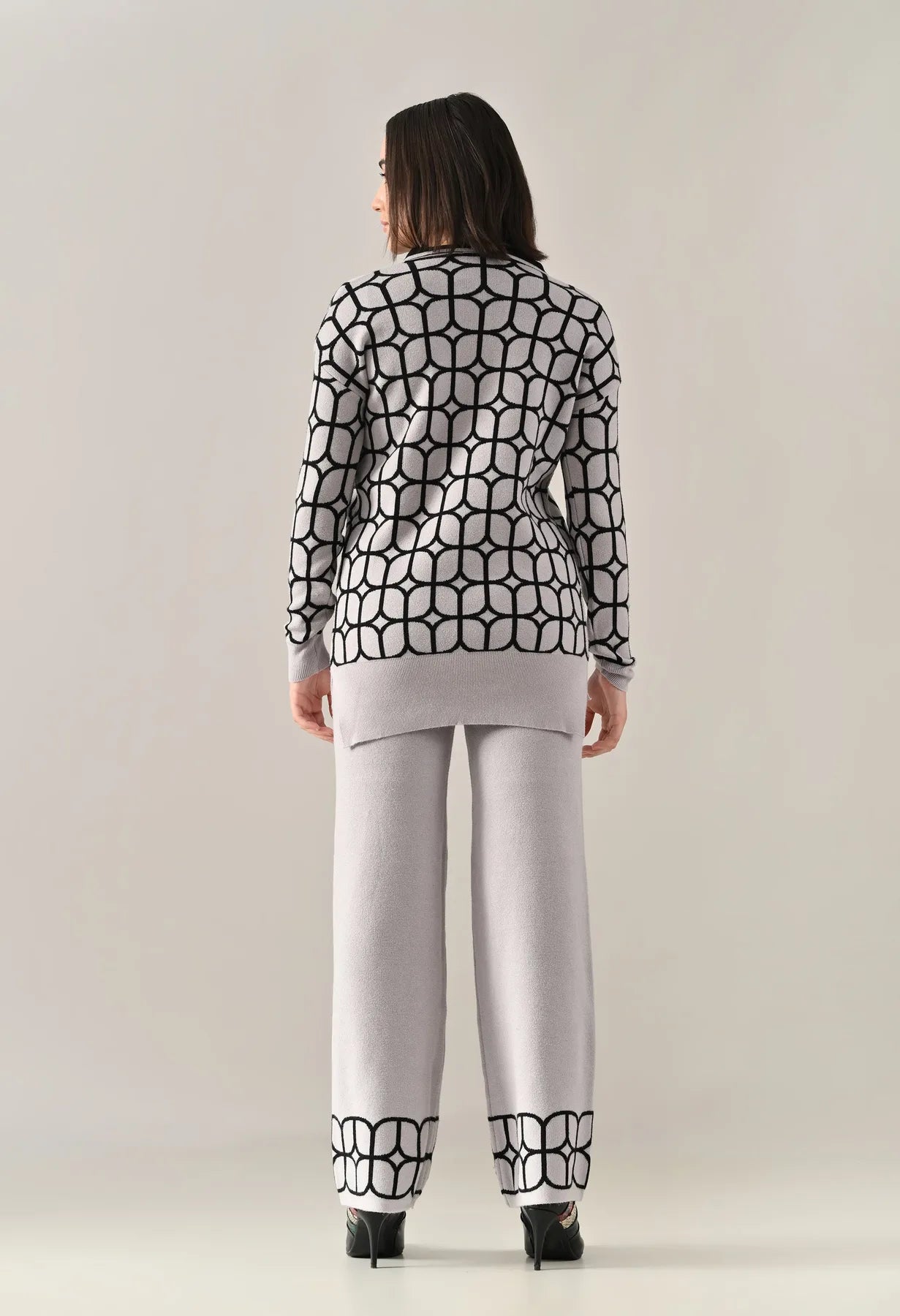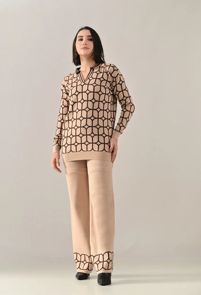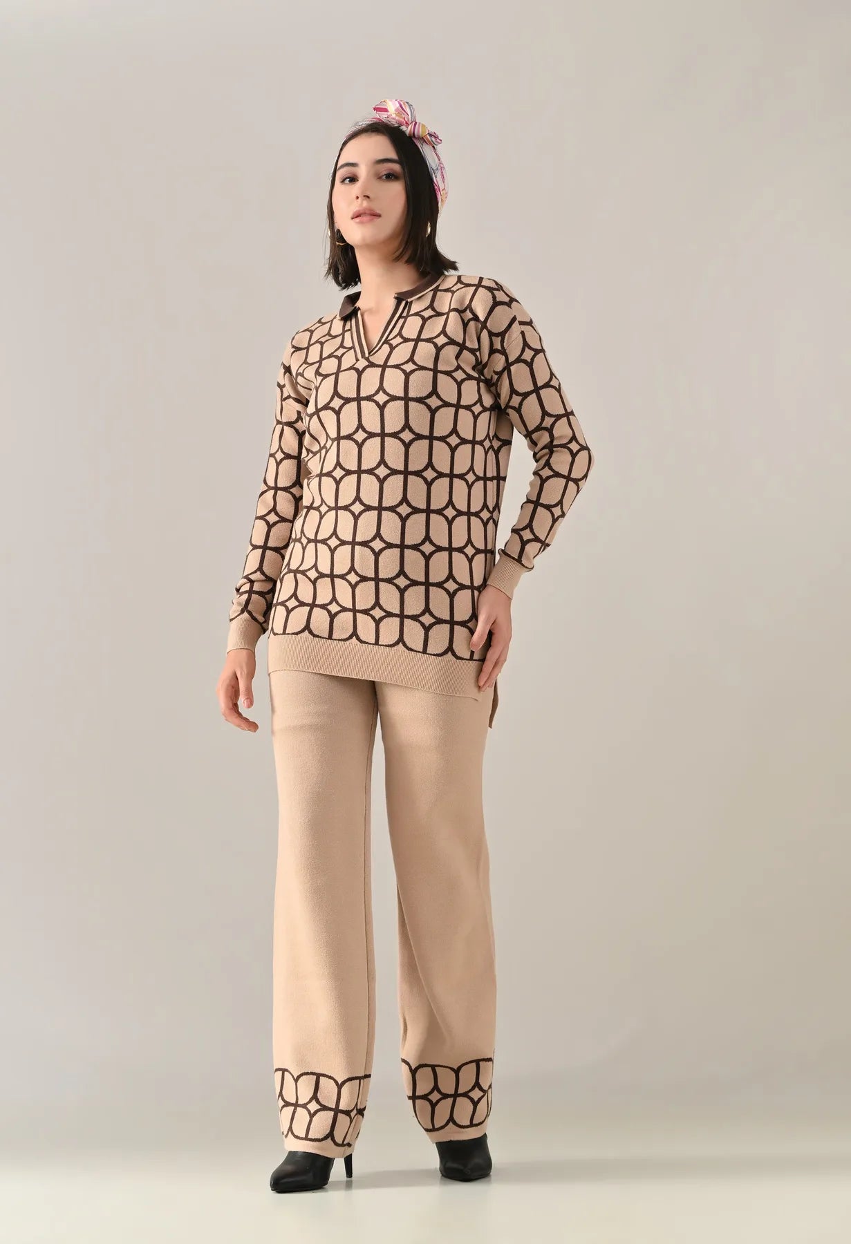 A chic sweater-knitted co-ord set featuring a collared V-neck top with long fitted sleeves and rib detailing at the hem and sleeve openings. Designed with a high-low front and back hem and side slits for a modern silhouette. The straight solid lower include a broad elasticated waist and ribbed hem, offering a perfect blend of style and comfort. Showcasing geometric pattern, this set is crafted from soft, comfortable, and stretchable fabric, ideal for a cozy yet elegant look.